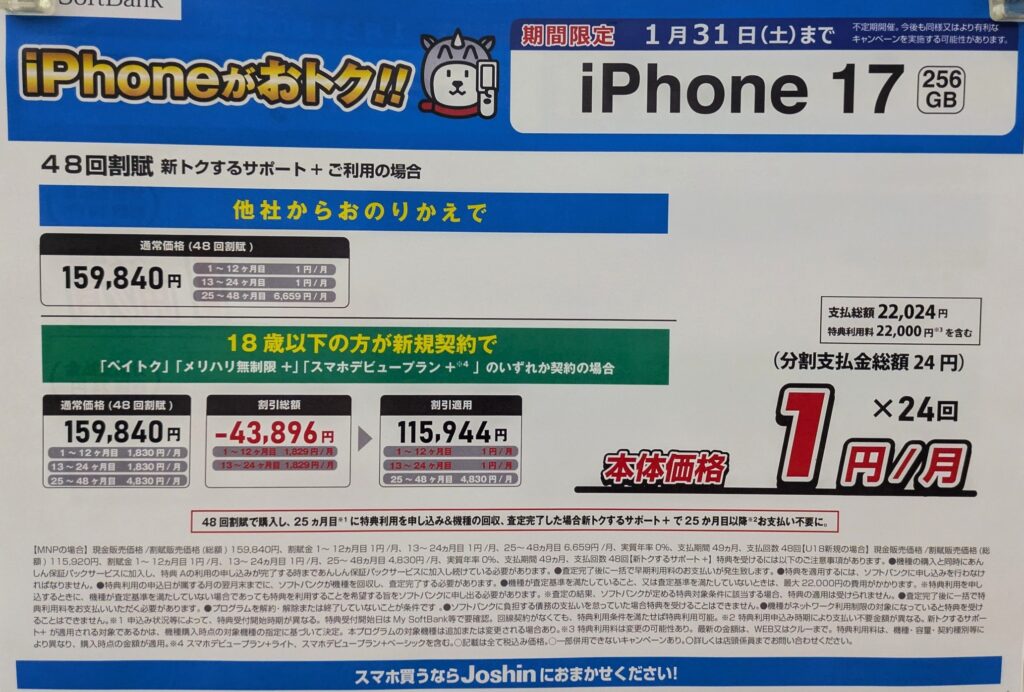 事務手数料はオンラインショップが3,850円(税込)、量販店は4,950円(税込)です。ポップはジョーシンですが、おそらく10~15%ポイント還元の一部エディオンも実施しているのかと思います(新規割引のポップは出していませんが)。