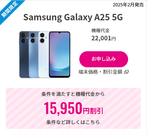 UQモバイルオンラインショップでは、2025年2月発売の「Galaxy A25 5G(税込22,001円)」が機種変更で▲15,950円割引になり、総額6,051円(税込)となっています。