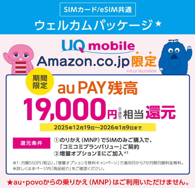 Amazonでは、UQモバイルの事務手数料3,850円(税込)が無料になる「ウエルカムパッケージ」利用、かつSIMのみMNPで最大19,000円相当のauPAY還元となっています。1/9(金)まで。