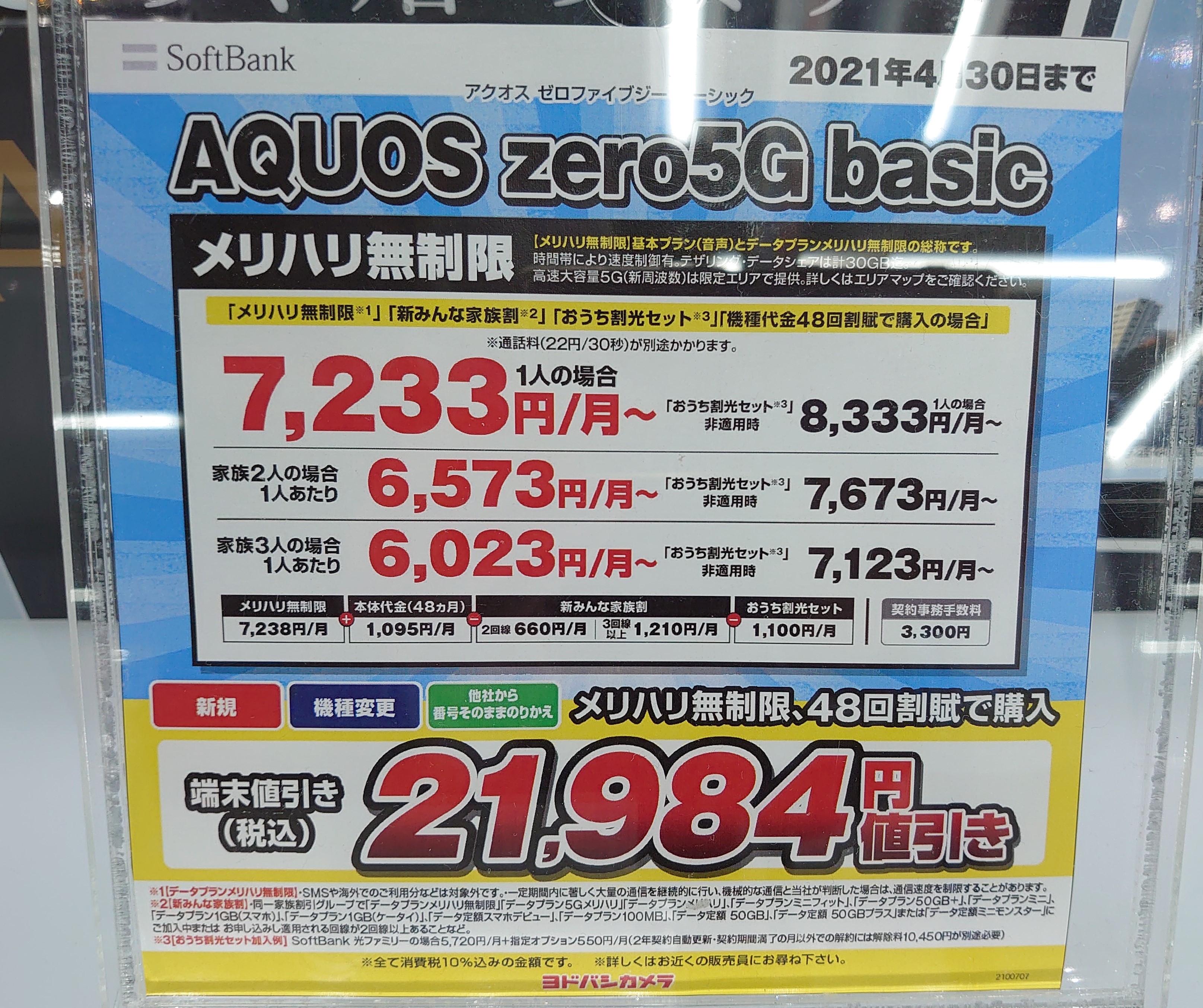 ヨドバシカメラ京都では、ソフトバンクのAQUOS zero5G basicが機種変更30,576円(税込)となっています。52,560円からの21,984円割引です。メリハリ無制限、48回分割購入が必要ですが、翌日以降ソフトバンクショップで一括清算が可能かと思われます。事務手数料は3,300円(税込)、4月30日(金)まで。