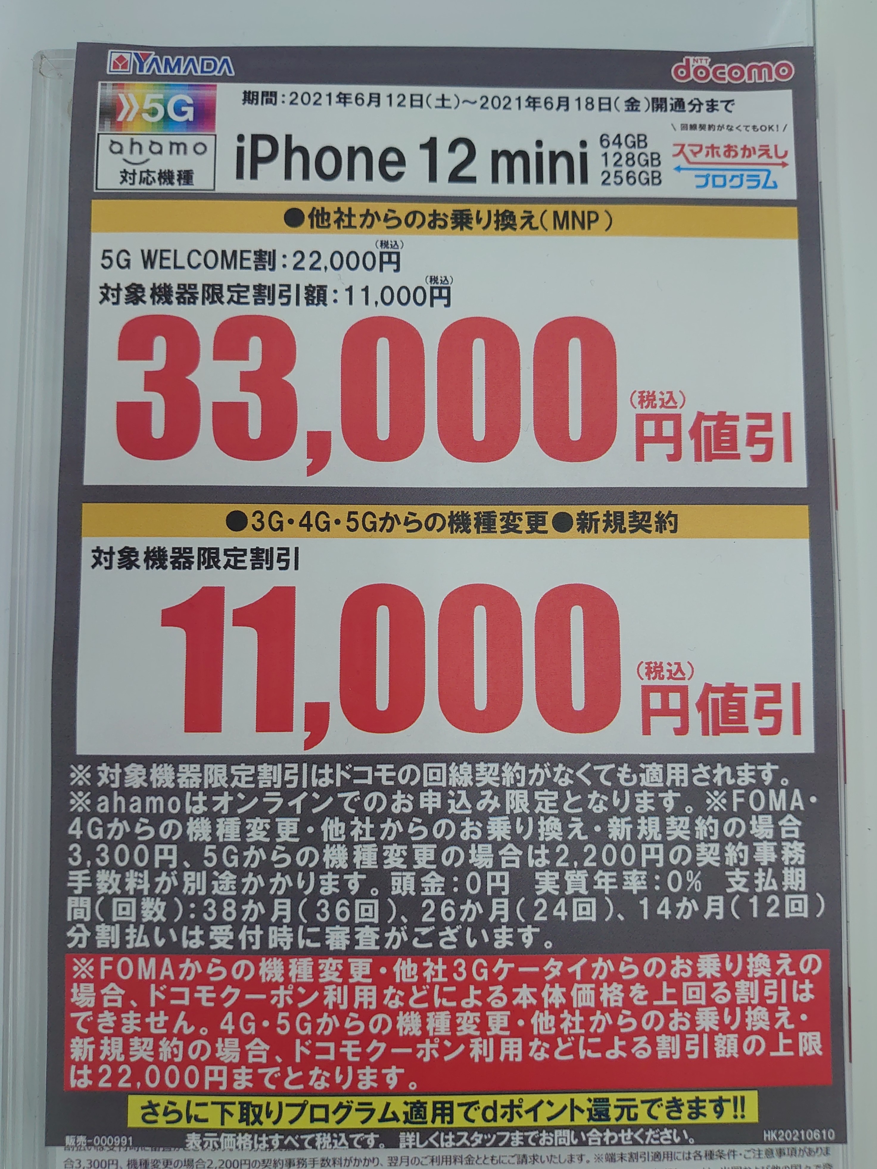 ヤマダ電機のドコモでは「iPhone 12 mini」の64・128・256GBがMNPで33,000円割引となっています。 本体価格(税込)と割引後価格(税込)は以下のとおり。64GBはだいぶ手の届く範囲になったかなという気はします。6月18日(金)まで。