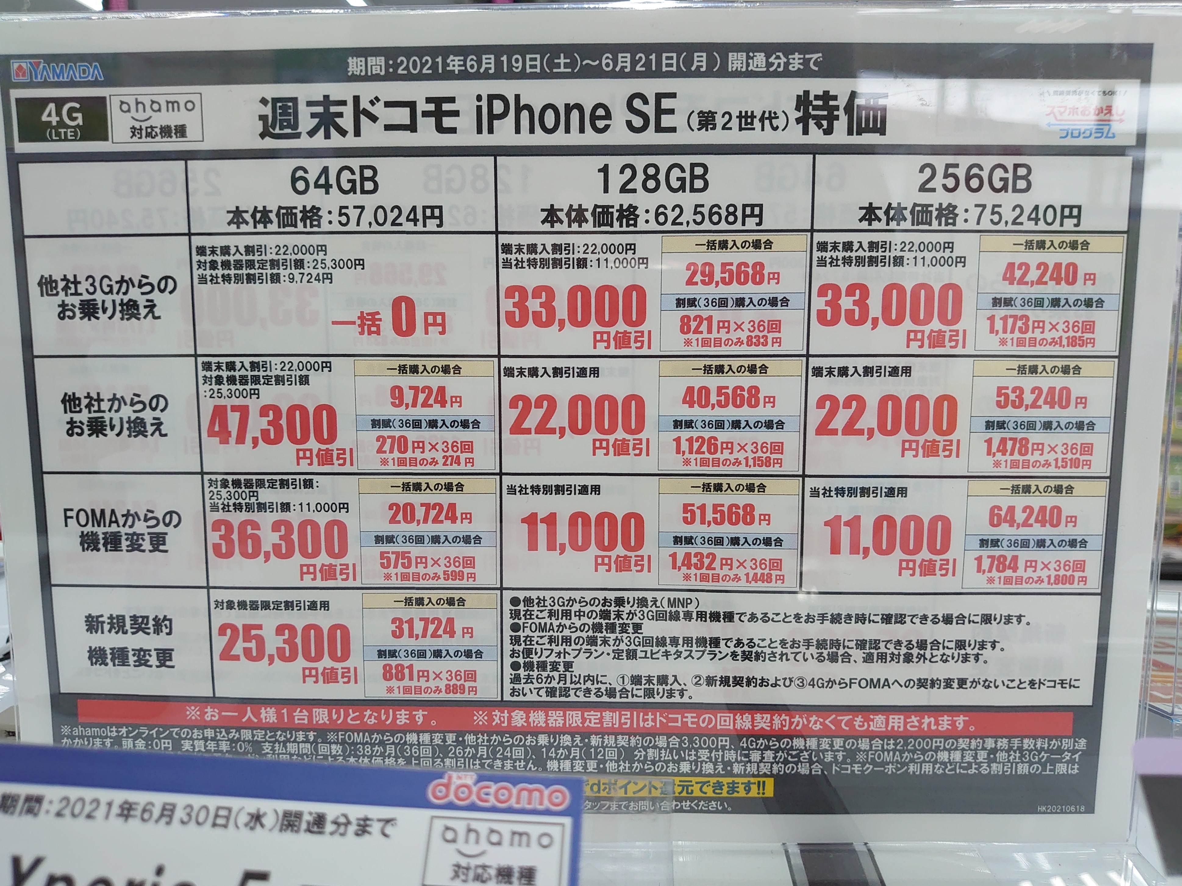 ヤマダ電機のドコモでは、iPhone SE 64GB(税込57,024円)がMNP一括9,724円(税込)となっています。新規契約・機種変更・端末のみ購入で31,724円(税込)。6月21日(月)まで。