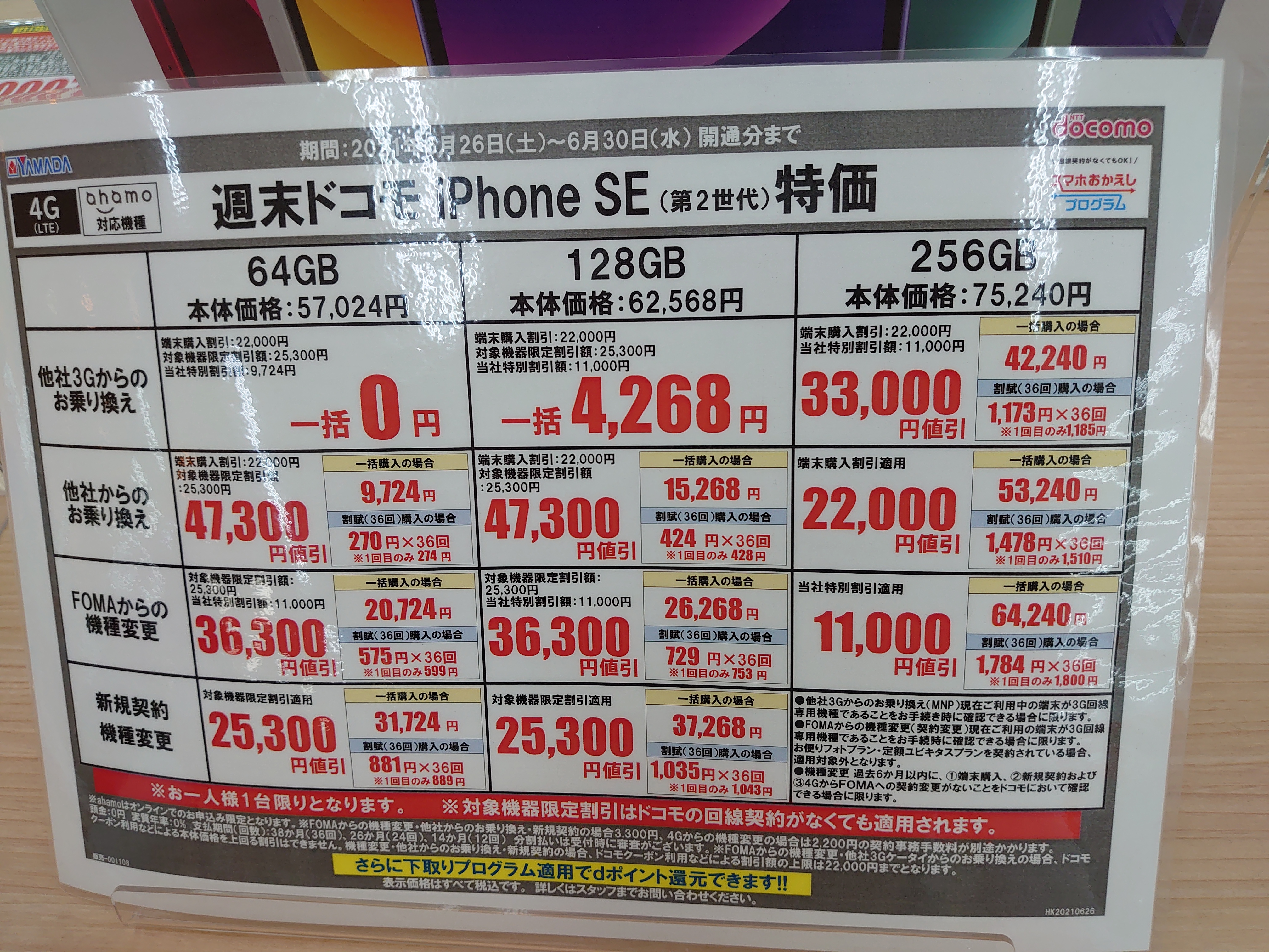【~6/30(水)まで】ドコモ iPhone SE 128GBがMNP一括15,268円/ヤマダ電機 2021 6/26 iPhone ドコモ 2021年6月26日 当ページにはアフィリエイト広告が含まれています。 既にアップしているヨドバシカメラや、その他店舗も同じですが、ヤマダ電機が見やすいのでUPしておきます。128GBの「新規契約・機種変更・端末のみ購入」が37,268円(税込)です。端末のみ購入の場合は事務手数料が不要となります。 iPhone ドコモ よかったらシェアしてね! URLをコピーしました! URLをコピーしました! この記事を書いた人 Sakura R5G ケータイ特価情報をお届けします。 遠慮なくコメント頂ければ結構ですが、コメントは私が承認するまで表示されませんので、ご注意下さい。 ※2024年7月1日より、参考程度の投稿以外はX(旧ツイッター)に投稿しようと思っています。 人気記事 ワイモバイル 【8/14(木)より】価格(再)更新、ワイモバイル「Google Pixel 8a」が機種変更で49,536円にPayPay還元/事務手数料0円/ヤフーショッピング店 2025年8月14日 ワイモバイル 【2025/11版】ワイモバイル「iPhone 13(認定中古品)」が機種変更一括29,520円/事務手数料3,850円/オンラインストア 2025年11月9日 楽天モバイル 【2025/12版】楽天モバイル「nubia S2R」や「Galaxy A25 5G」がMNP一括1円/事務手数料0円 2025年12月2日 ドコモ 【2025/8版】ahamoへのSIMのみMNPで20,000dポイント(分割進呈)/事務手数料0円/NTTドコモ 2025年8月10日 楽天モバイル 【7/1(火)より】楽天モバイルへのMNPで▲22,000円割引/「Nothing Phone (3a)」が一括32,890円など/事務手数料0円 2025年7月1日 新着記事 【1/10(土)】 Joshin webで「Xiaomi 14T Pro 512GB(パッケージ不良)」が79,800円 【1/15(木)発売】楽天モバイル「Nothing Phone (3a) Lite」が32,890円/はじめて申し込み&MNPで16,000ポイント/2回線目以降は新規で6,000ポイント 【1/13(火)まで】UQモバイル「自宅セット割」適用で10,000ポイント追加還元/ビックカメラ コメント コメントする コメントをキャンセルコメント ※ 名前 メール サイト 新しいコメントをメールで通知 新しい投稿をメールで受け取る