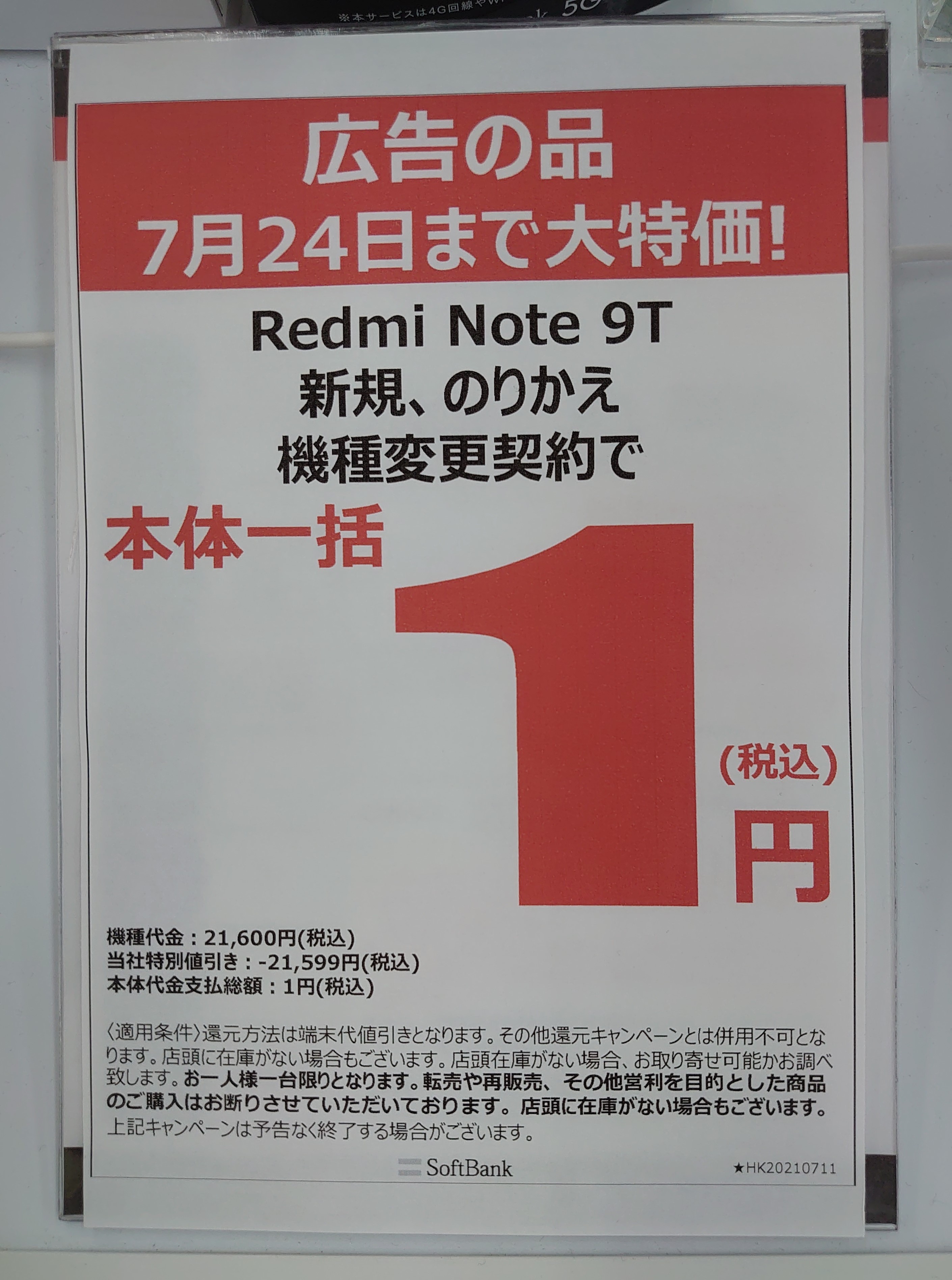 ヤマダ電機のソフトバンクでは、2021年2月発売の「Xiaomi Redmi Note 9T(税込21,600円)」が、機種変更を含む全契約形態(回線契約有り)で、一括1円です。事務手数料は3,300円(税込)。