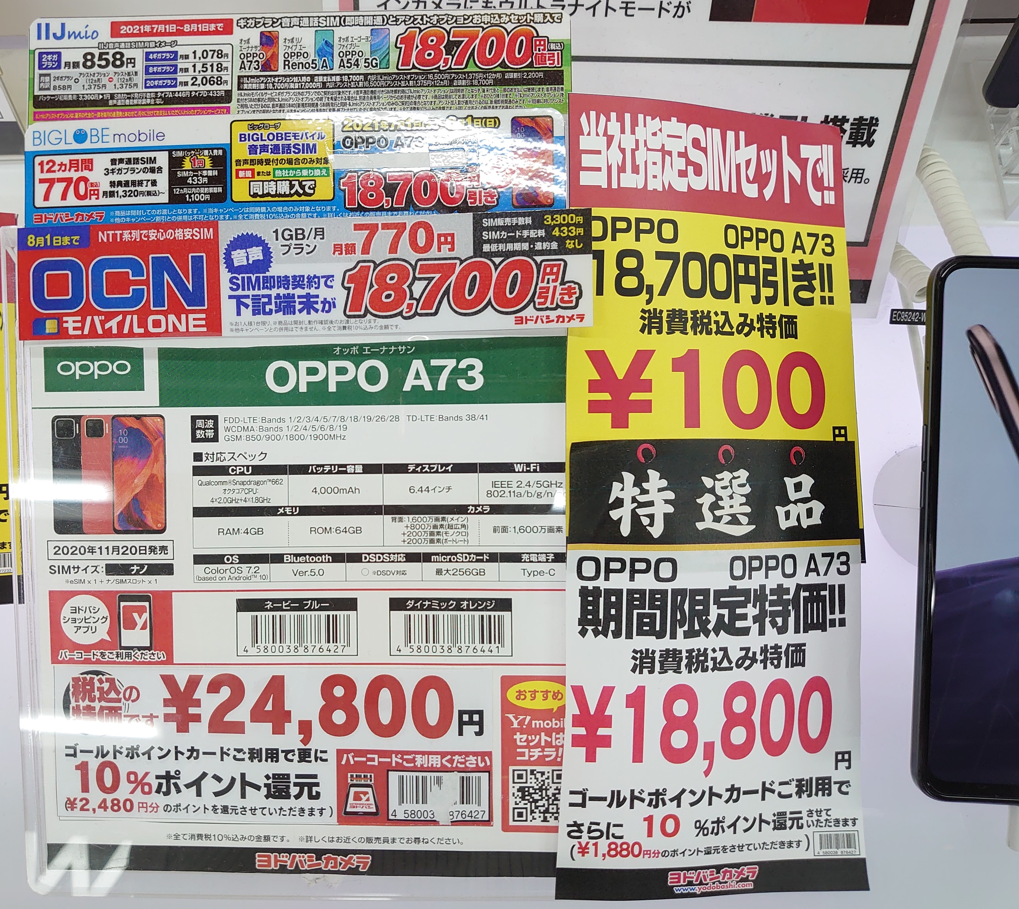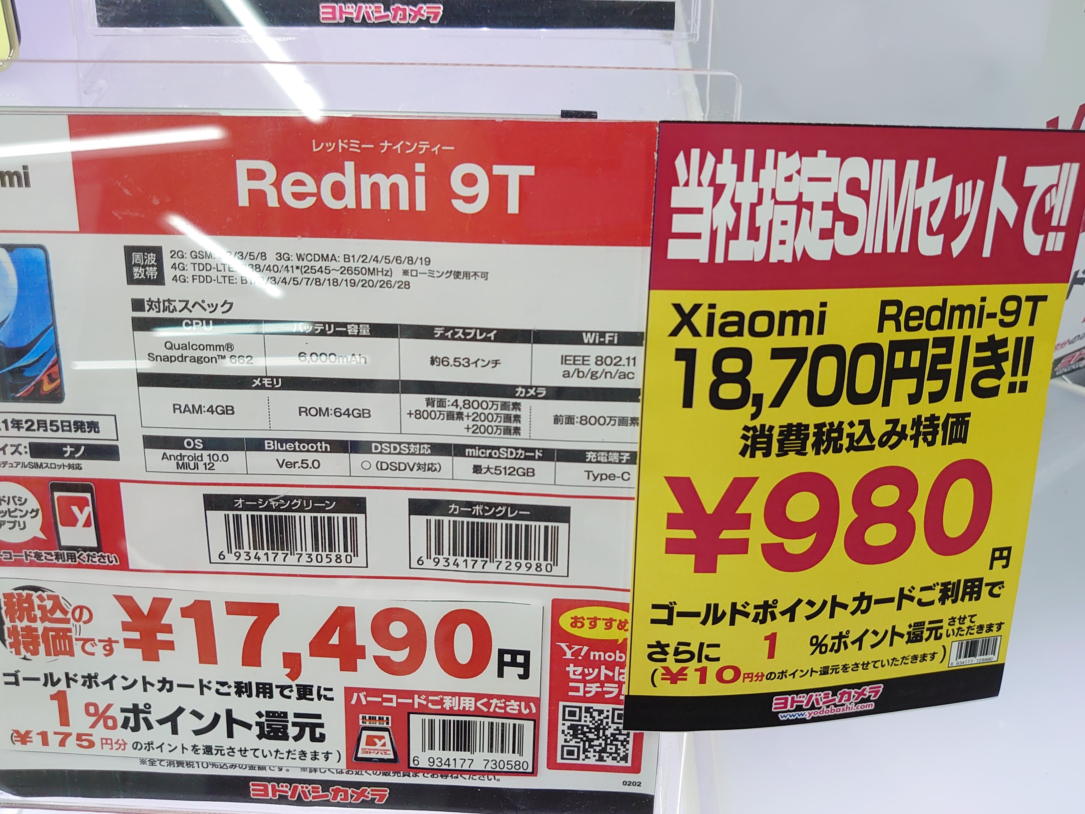 2021年7月22日、ヨドバシカメラ梅田では、IIJmio、OCNモバイルONE、ビッグローブの各SIMセット、Redmi 9Tが一括980円等になっています。通常13,000円割引ですが、7/22(木)~7/25(日)の連休限定で18,700円割引等になっています。以後週末限定等で継続される可能性は十分あります。