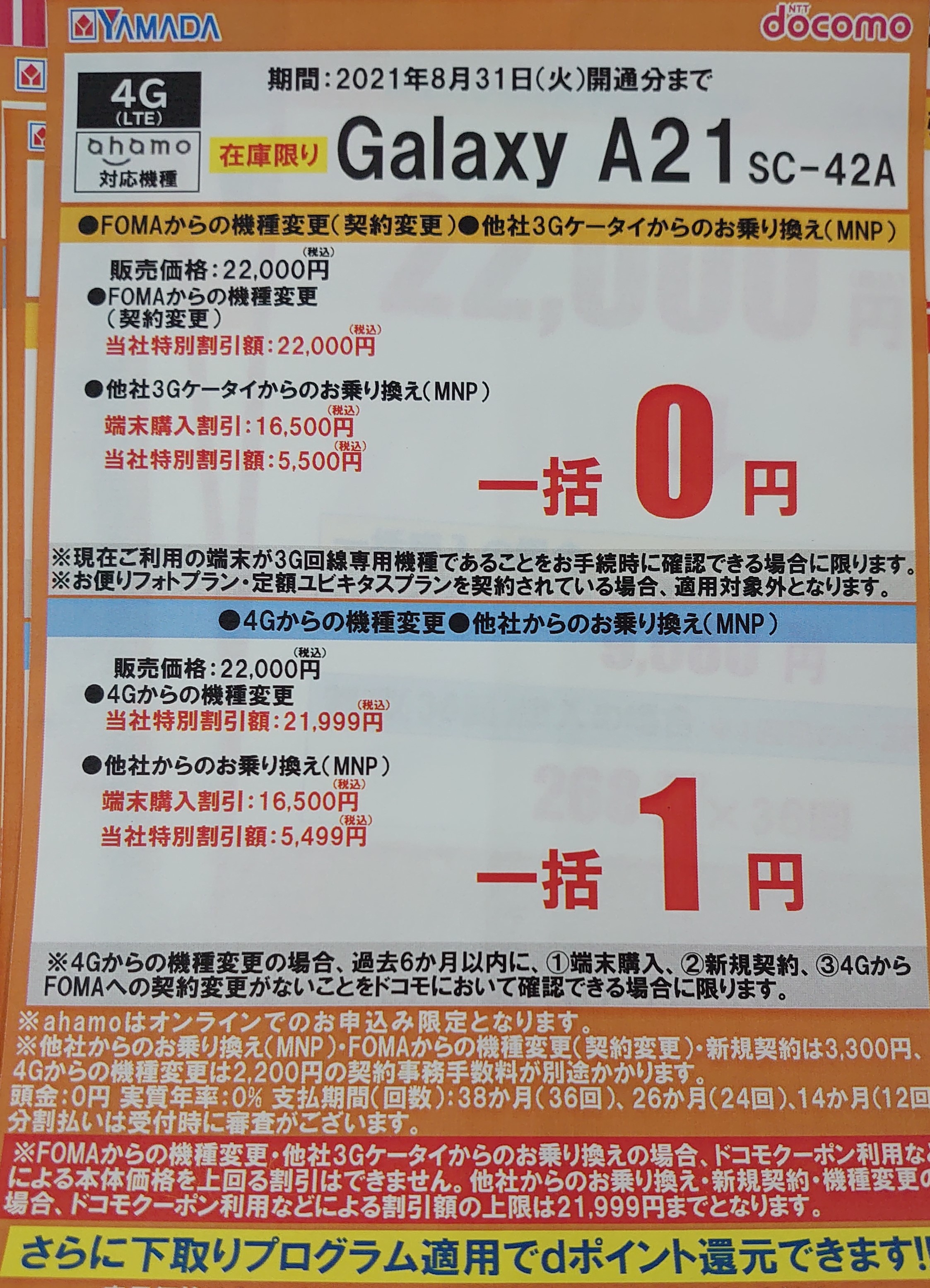 ヤマダ電機のドコモでは、2020年10月23日発売の「Galaxy A21 SC-42A(税込22,000円)」が、4Gからの機種変更で一括1円となっています。在庫限りで、在庫を持つ店も少ないと思います。また、2020年6月25日発売の「arrows Be4(税込23,760円)」は機種変更1,760円(税込)です。