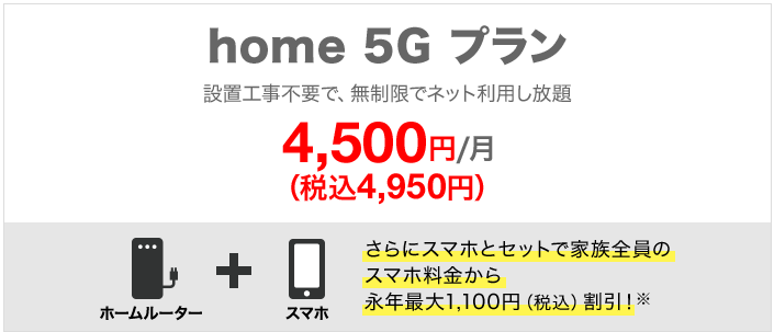 「home 5G」 契約者と同一「ファミリー割引」グループ内の「ドコモのギガプラン」を契約している家族全員が対象です。