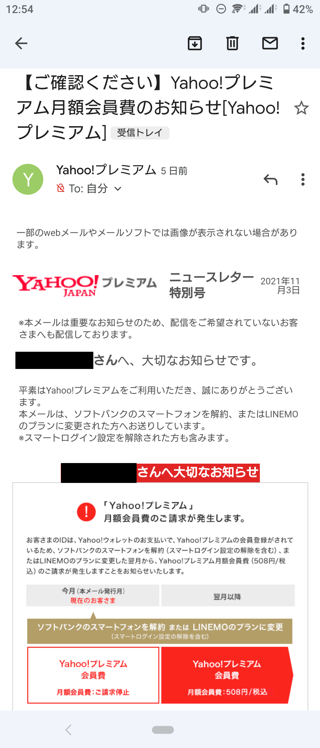 実はそのソフトバンク回線はyahooと紐付けていたみたいで(yahooウォレット支払い)、yahooから以下のようなメールが届きました。