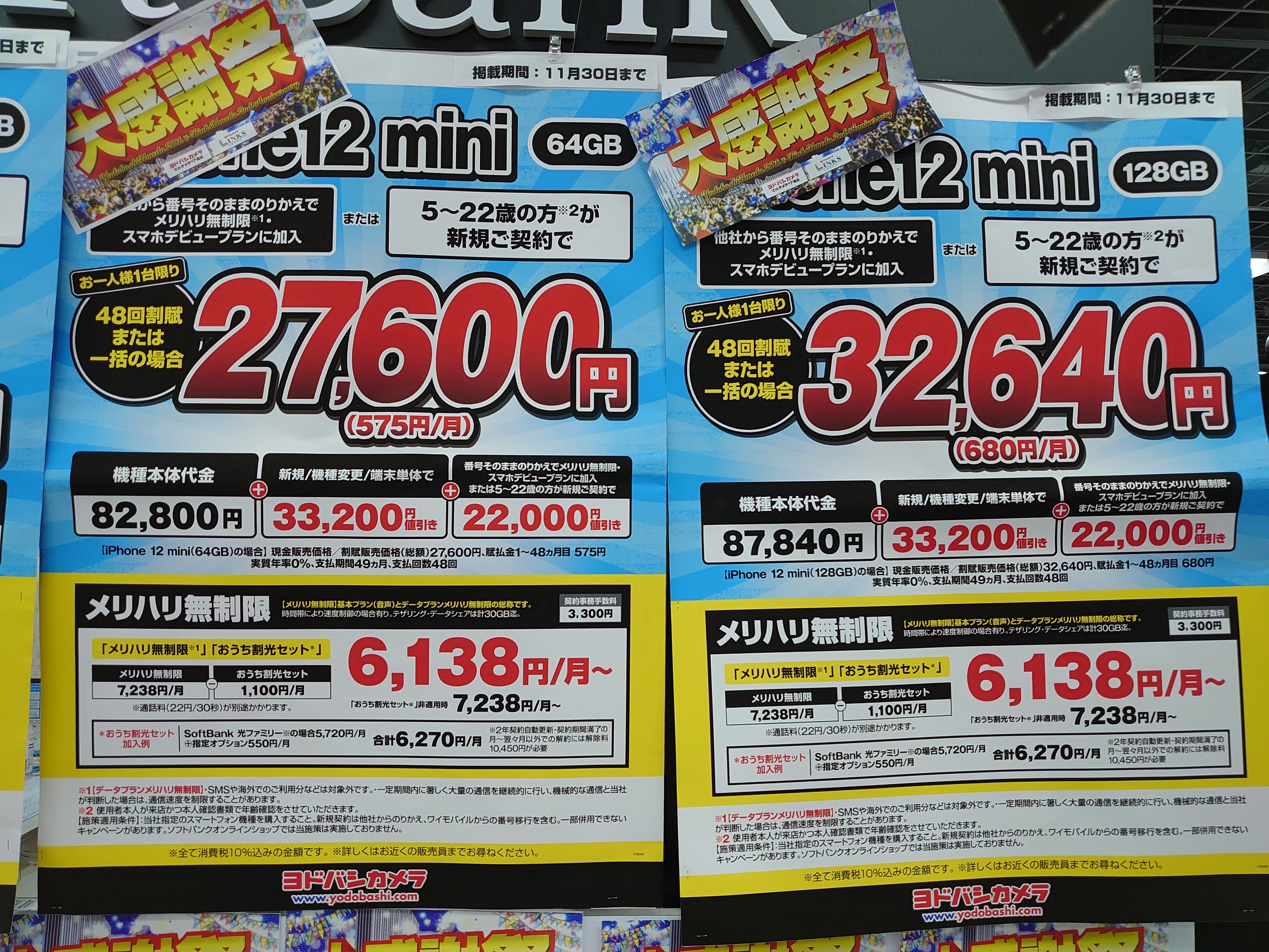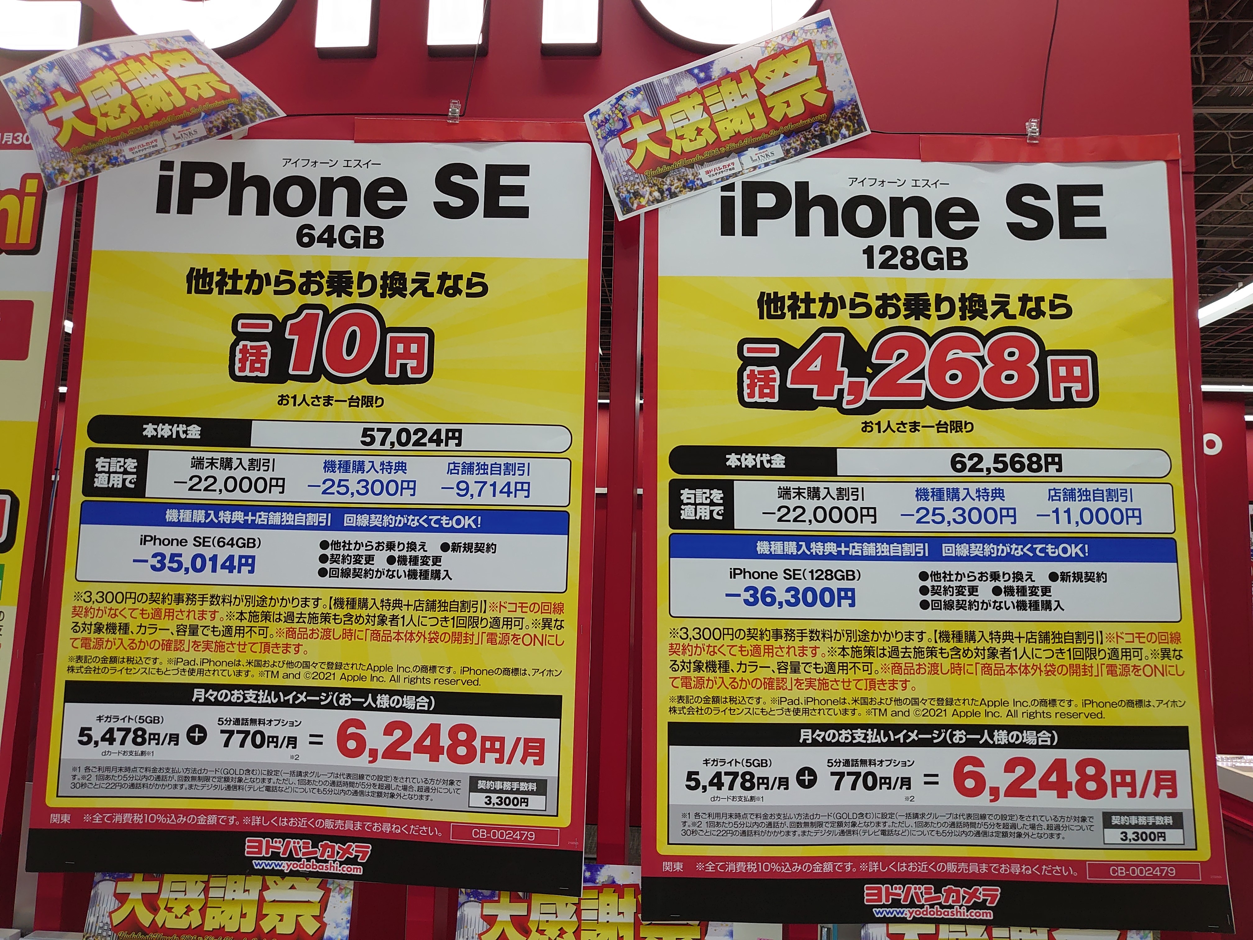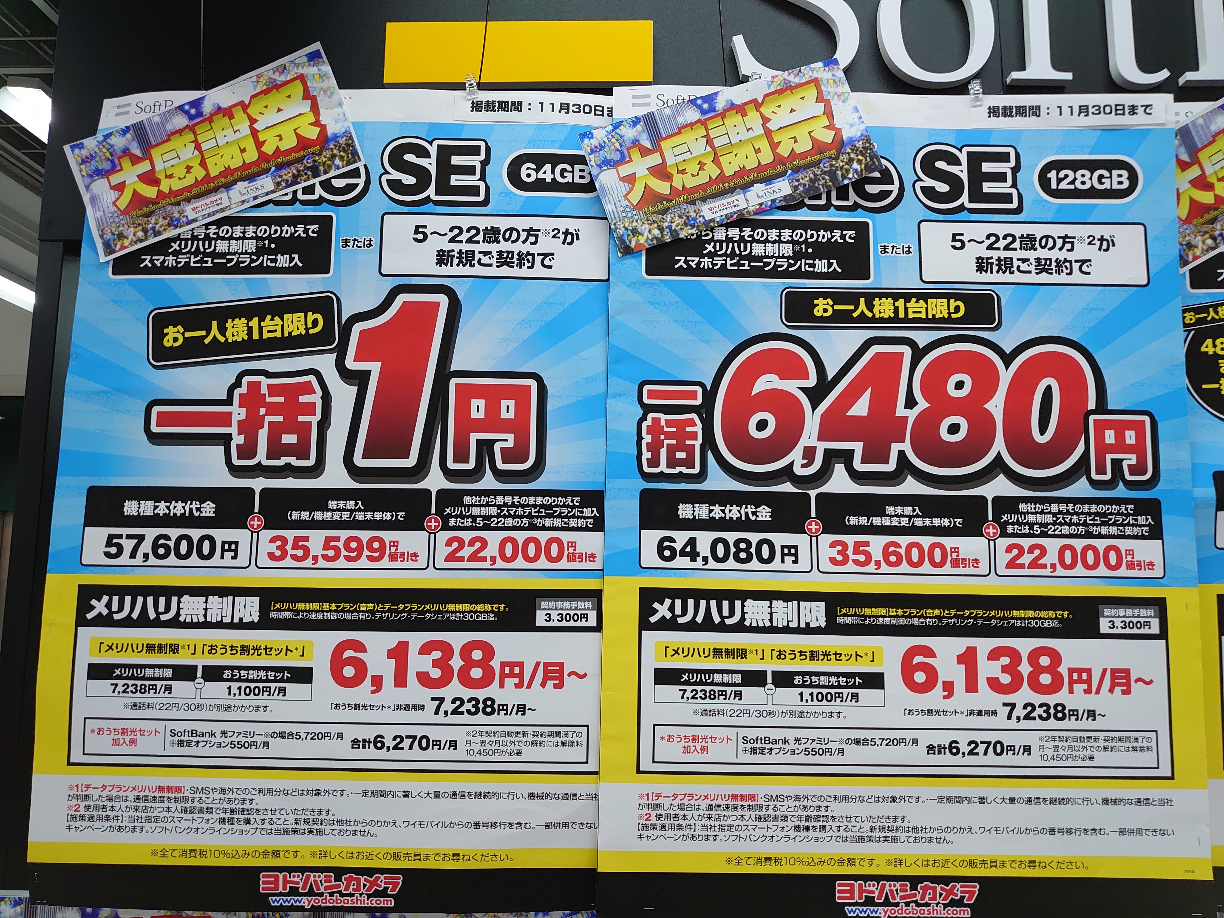 2~3週間前だったと思いますが、ドコモでは3日間限定(土・日・祭日)でSE128GB版がMNP一括10円というキャンペーンも実施されていました。大感謝祭・年末にもう一度期待したいところです。