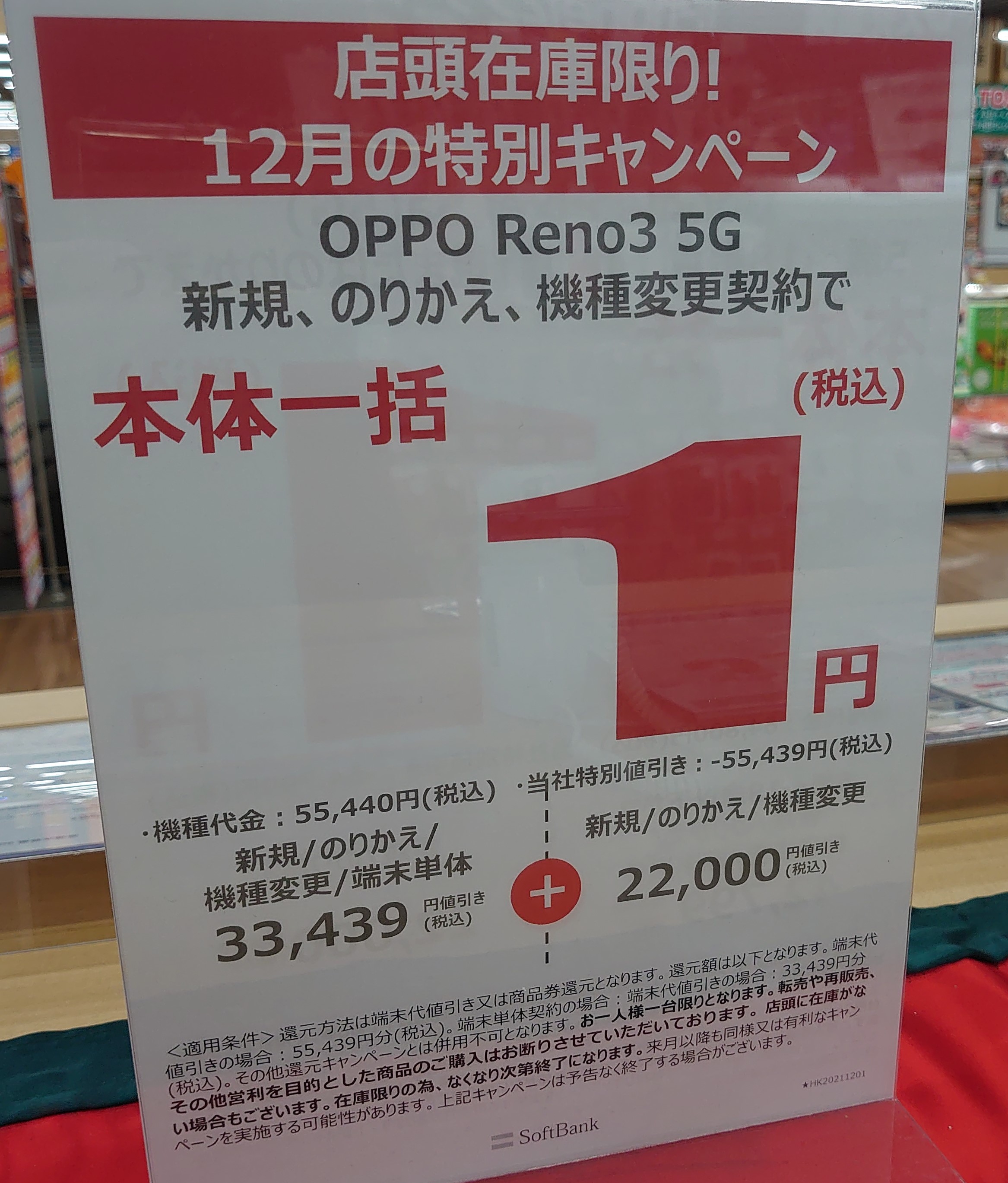 ヤマダ電機のソフトバンクでは、2020年7月31日発売の「OPPO Reno3 5G(税込55,440円)」が機種変更一括1円となっています。