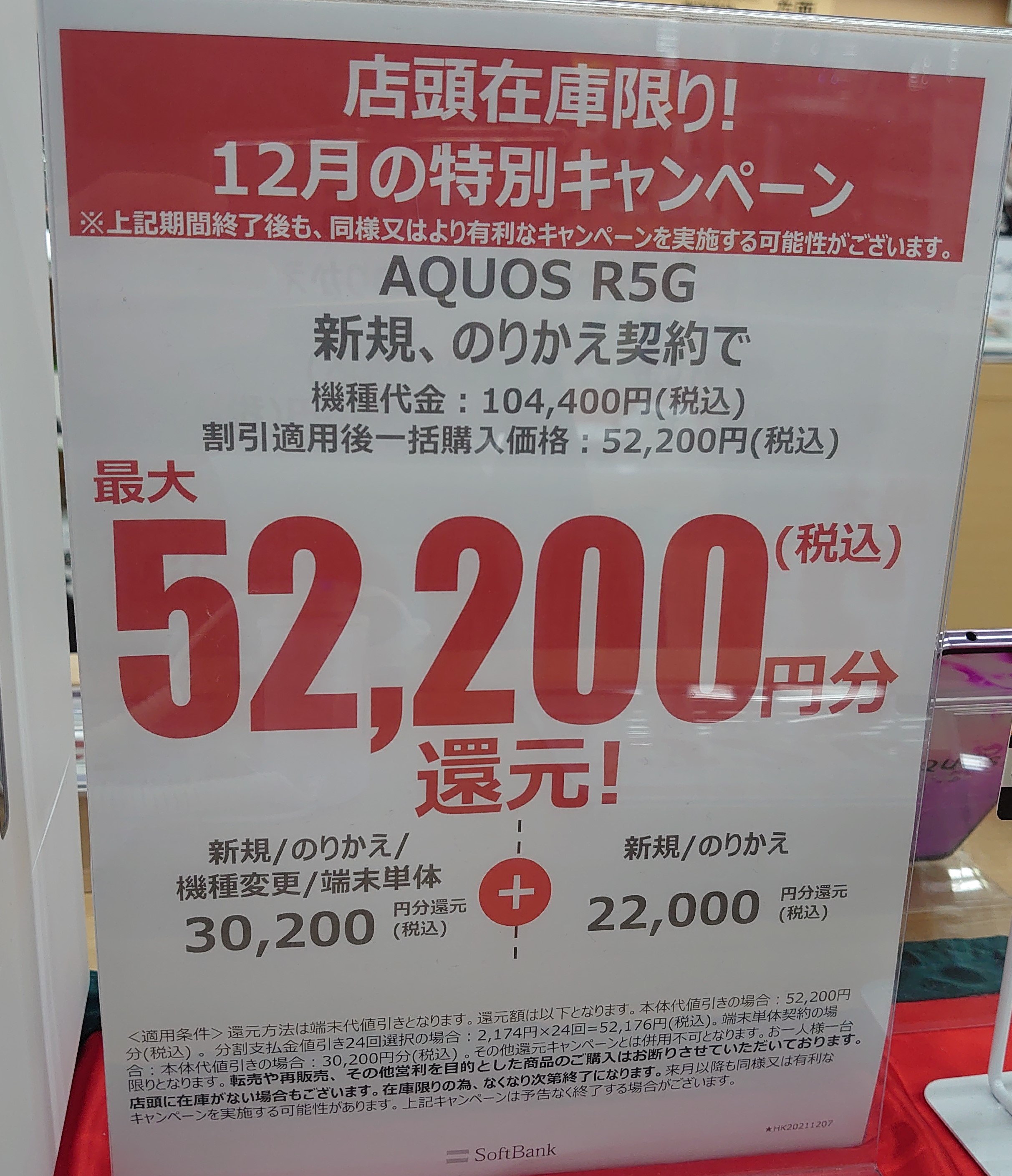 ということで、ある意味自然な文言ではありますが、額面通りさらなる有利な割引を期待しましょう。ざっと他のポップを見まわしましたが、この文言が記載されているのは「AQUOS R5G」のみでした。