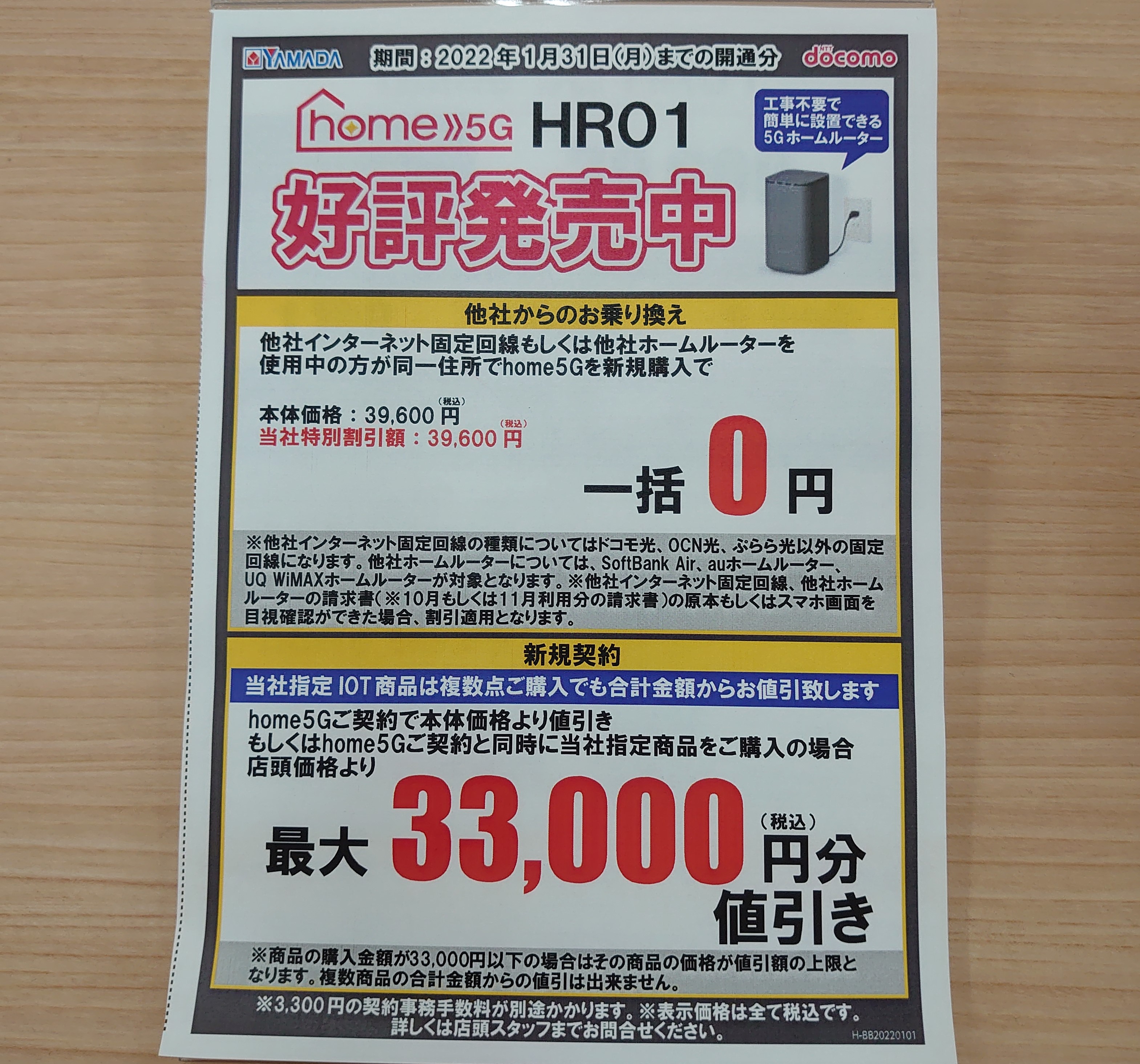 ヤマダ電機ではドコモのホームルーター「home 5G HR01(税込39,600円)」が、【固定回線の乗り換え】で一括0円となっています。事務手数料は3,300円(税込)、月額料金は4,950円(税込)です。ドコモ光、OCN光、ぷらら光からは特価対象外。1月31日まで。