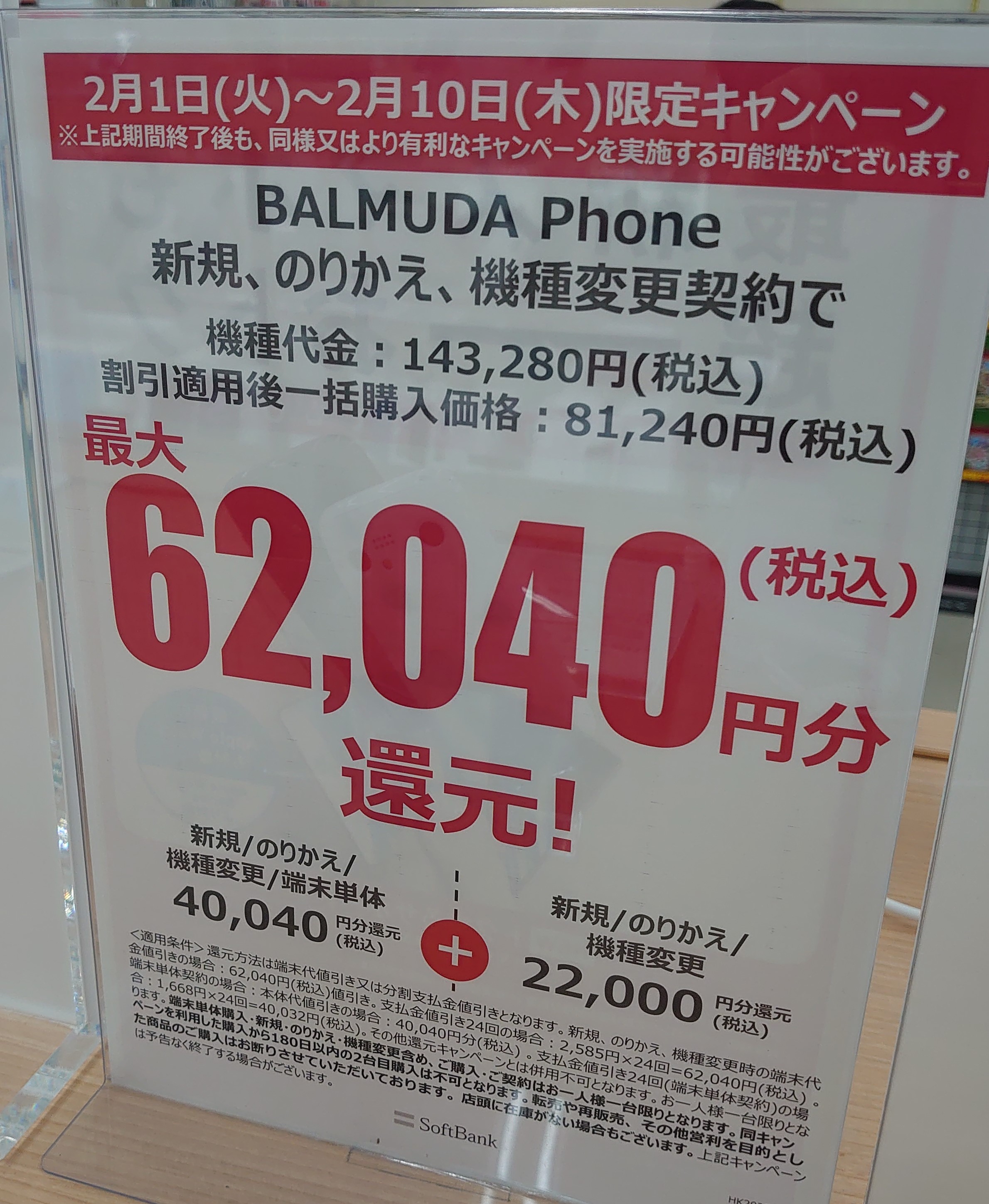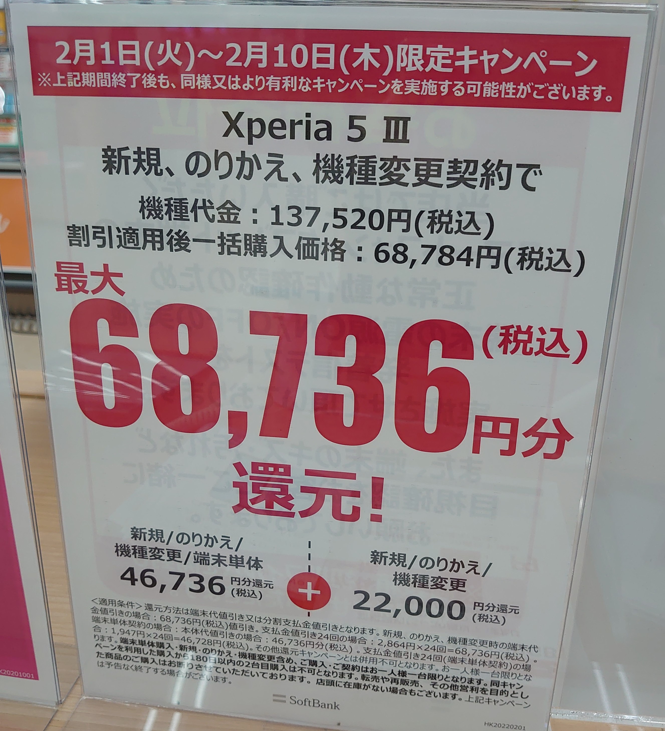 ヤマダ電機のソフトバンクでは2021年11月12日発売の「Xperia 5 III(税込137,520円)」が、新規・MNP・機種変更で68,736円割引の、一括68,784円(税込)となっています。