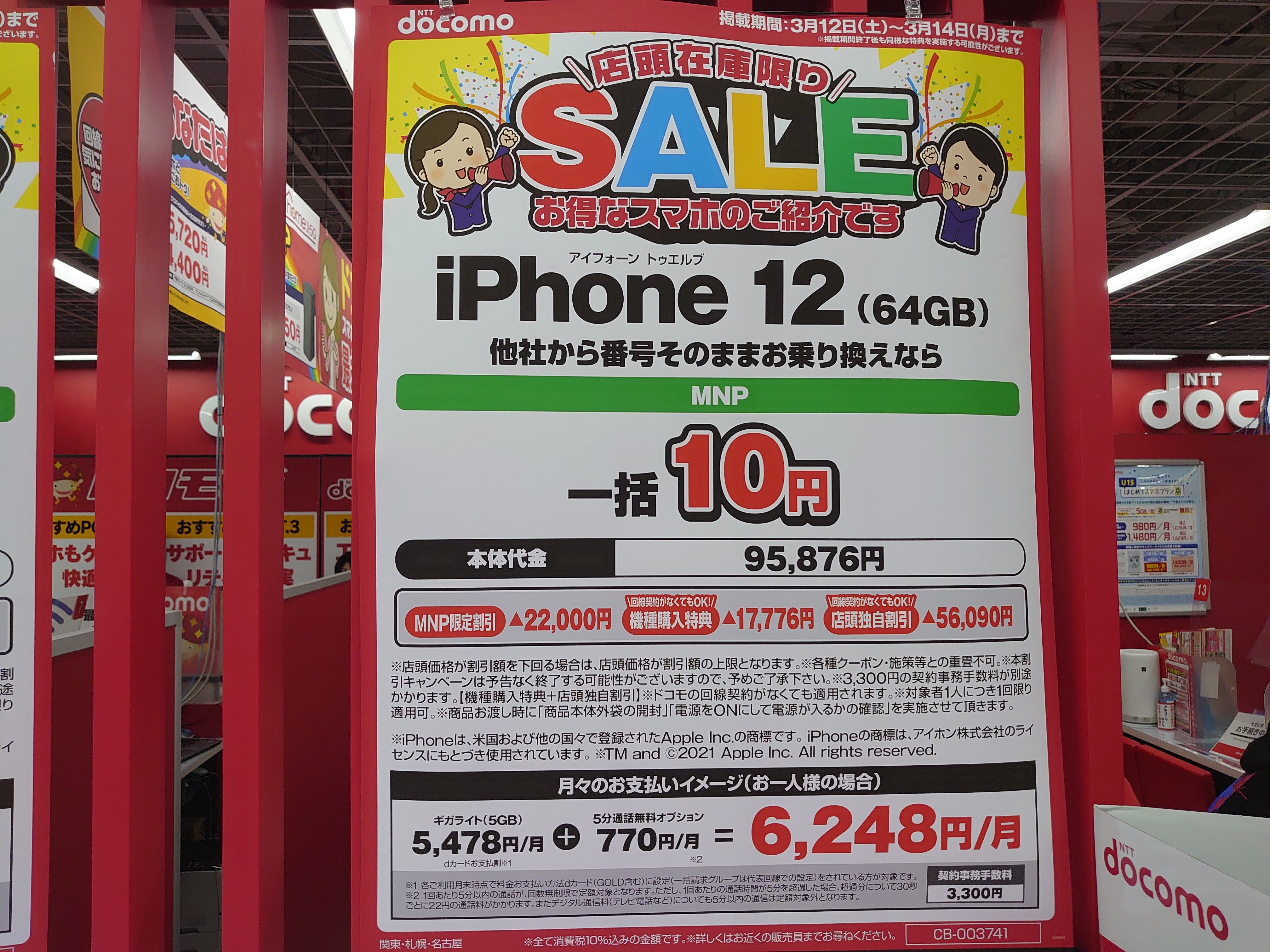 ヨドバシカメラ京都では、ドコモ「iPhone 12 64GB(税込95,876円)」がMNPで一括10円(税込)となっています。