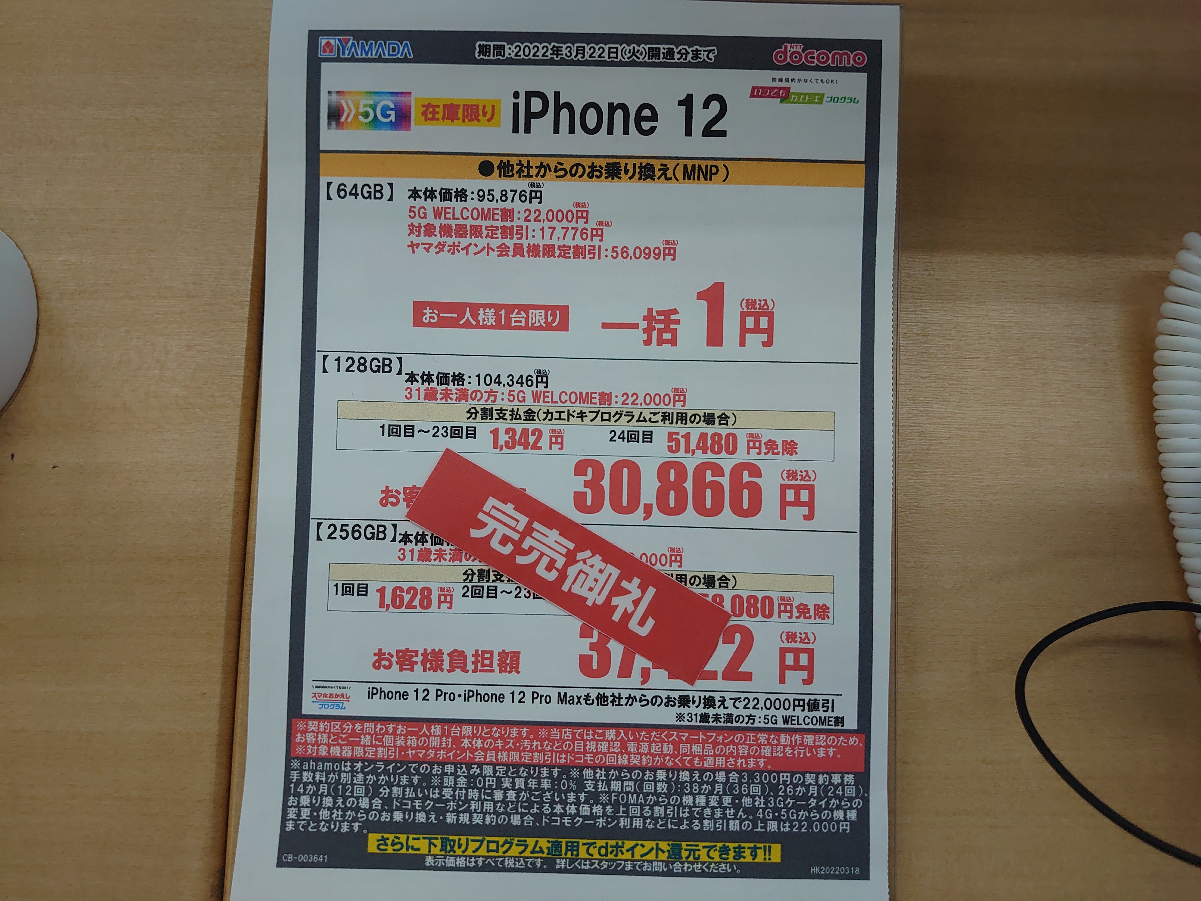 2022年3月19日(土)、ヤマダ電機ではドコモ「iPhone 12 64GB(税込95,876円)」がMNPで一括1円(税込)となっています。