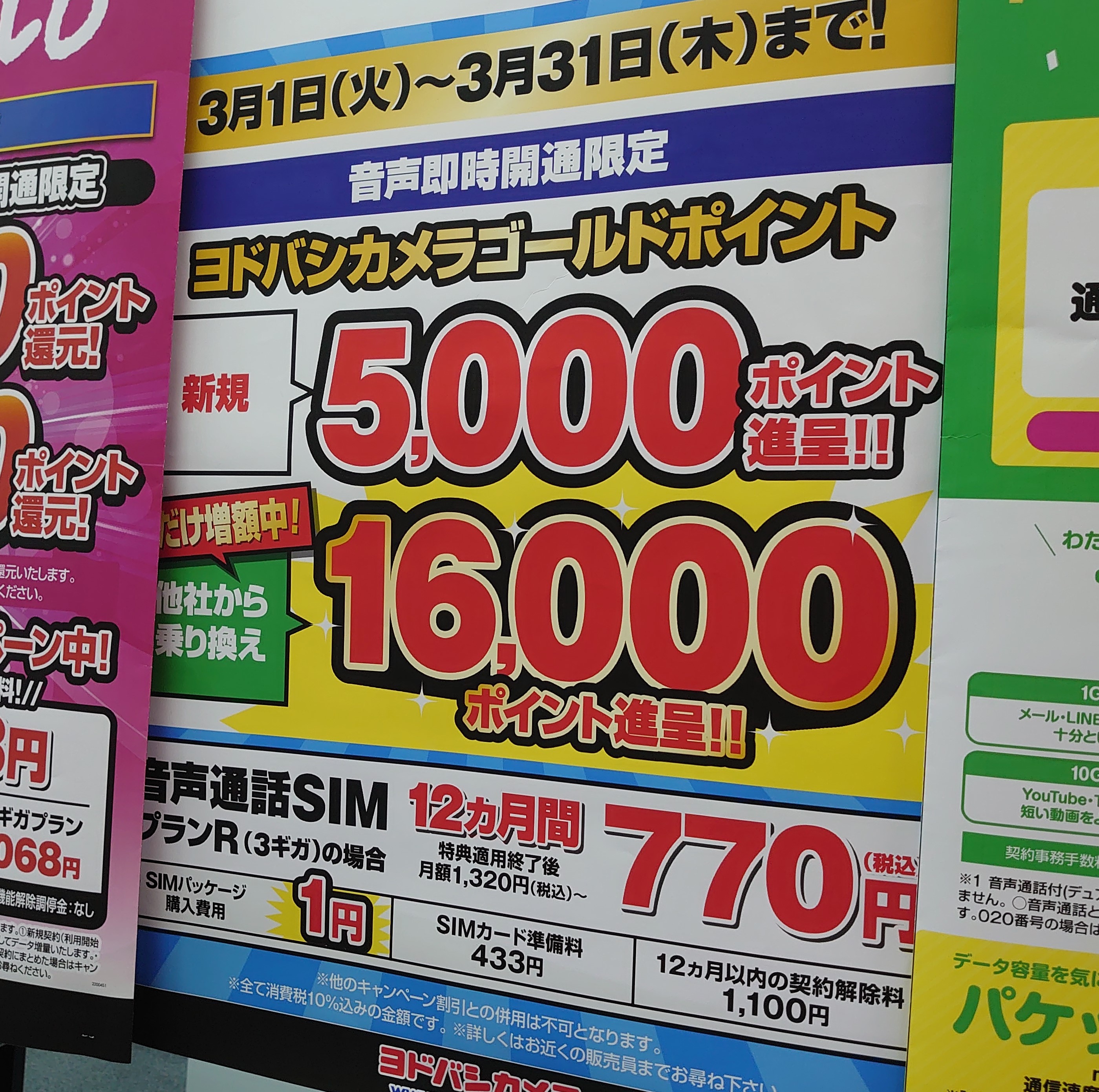 月額料金は、1年間は1GB550円(子回線は330円)。ビッグローブ公式ホームページにはこの特典の記載がないようですが、念のためヨドバシでご確認下さい。