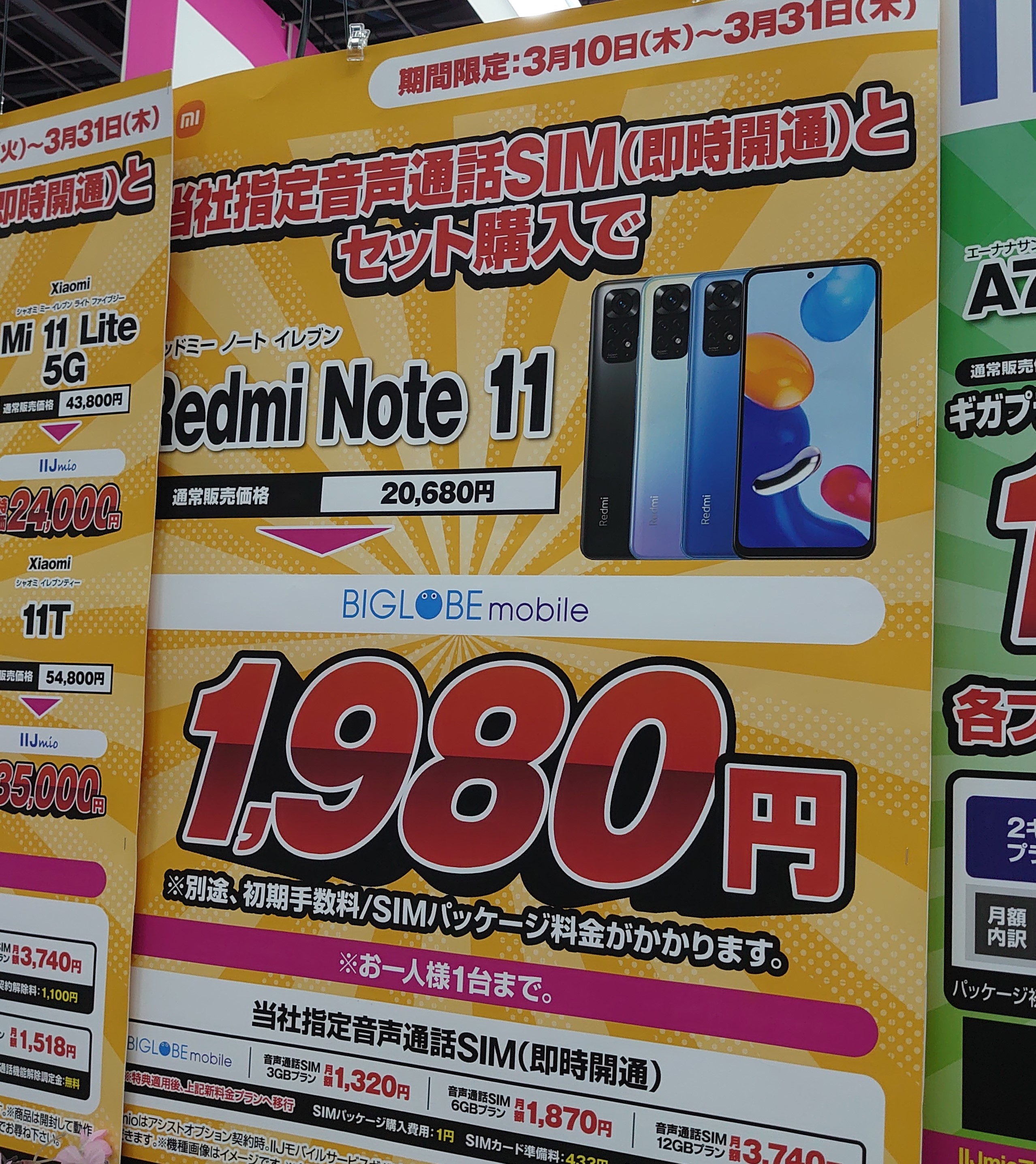 ヨドバシカメラでは、ビッグローブSIMセット(新規・MNP)で、2022年3月10日発売の「Redmi Note 11」が、1,980円(税込)となっています。事務手数料は1円、SIMカード準備料は433円(税込)。
