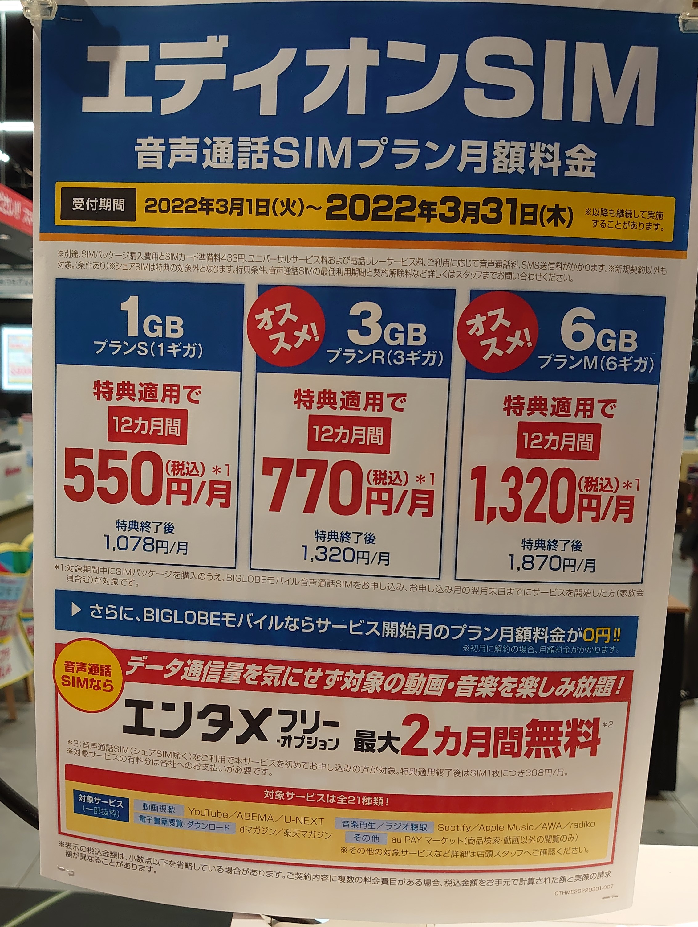エディオンSIMセット(ビッグローブ)も参考にして下さい。