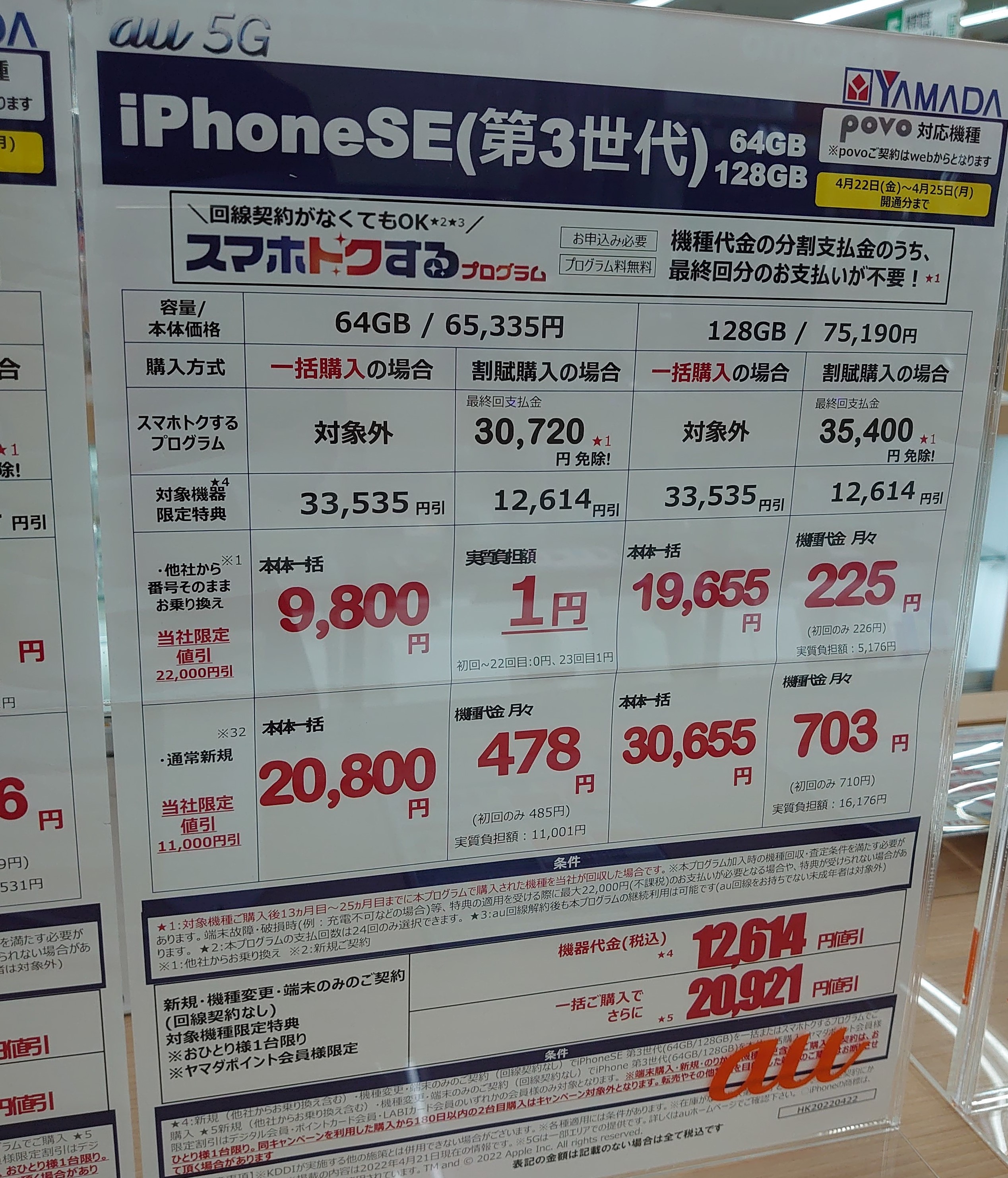 ヤマダ電機のauでは「iPhone 12 64GB(税込94,485円)」がMNP一括24,800円(税込)、「iPhone 12 128GB(税込100,015円)」がMNP一括30,330円(税込)となっています。