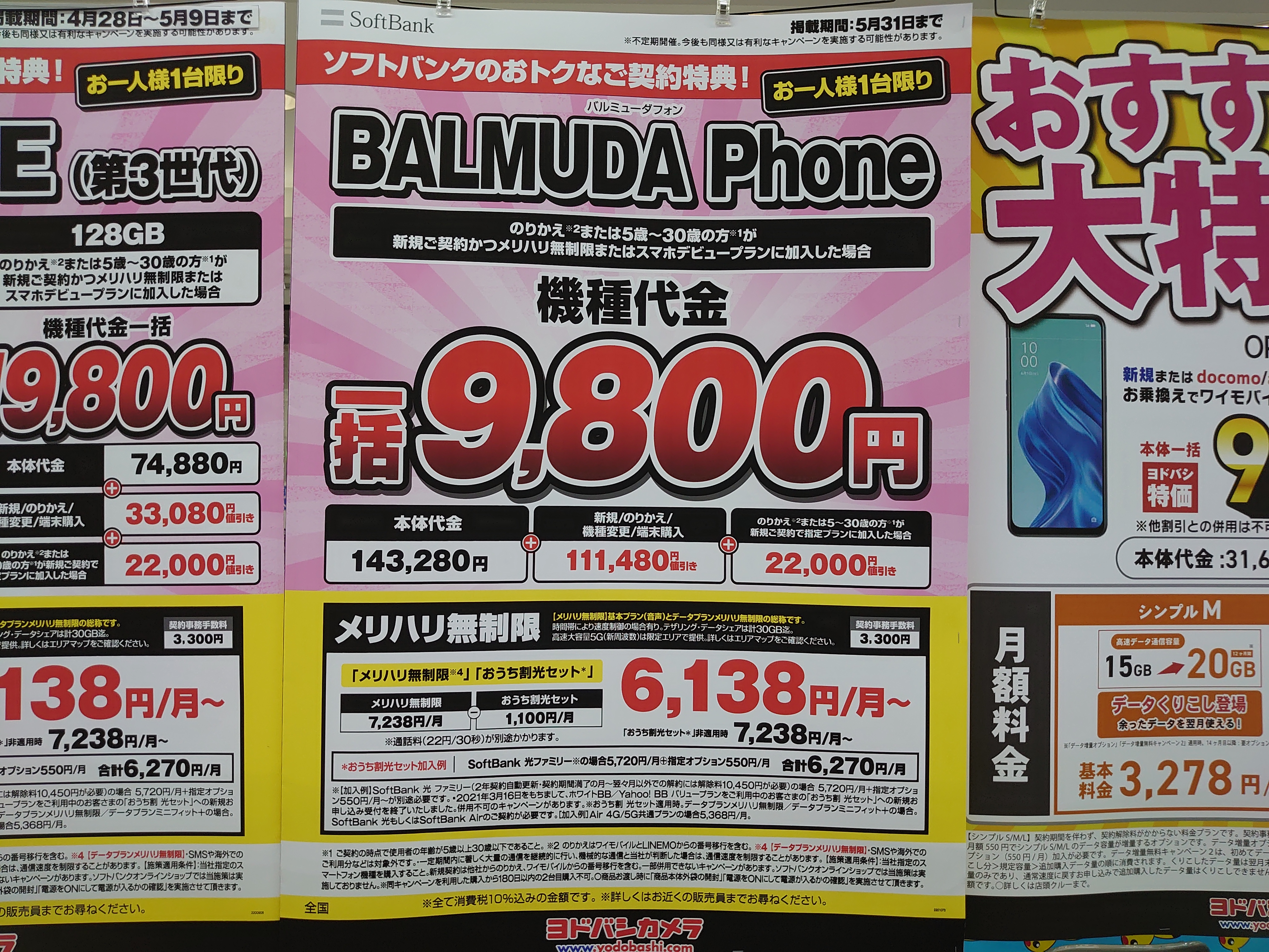 ソフトバンク「BALMUDA Phone(税込143,280円)」がまさかのMNP一括9,800円となっています。