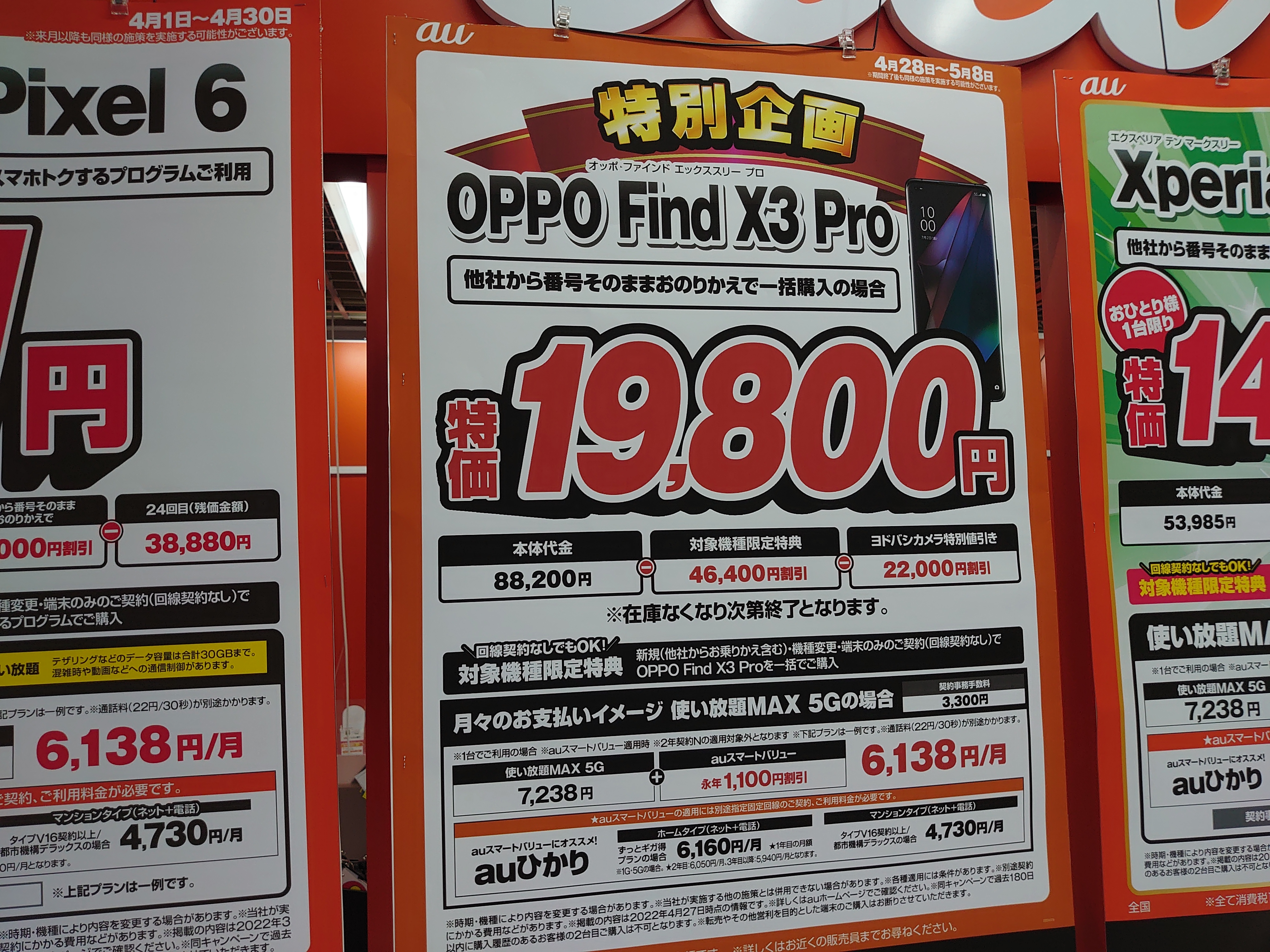 au「OPPO Find X3 Pro(税込88,200円)」がMNP一括19,800円(税込)。ラストチャンスではないでしょうか。