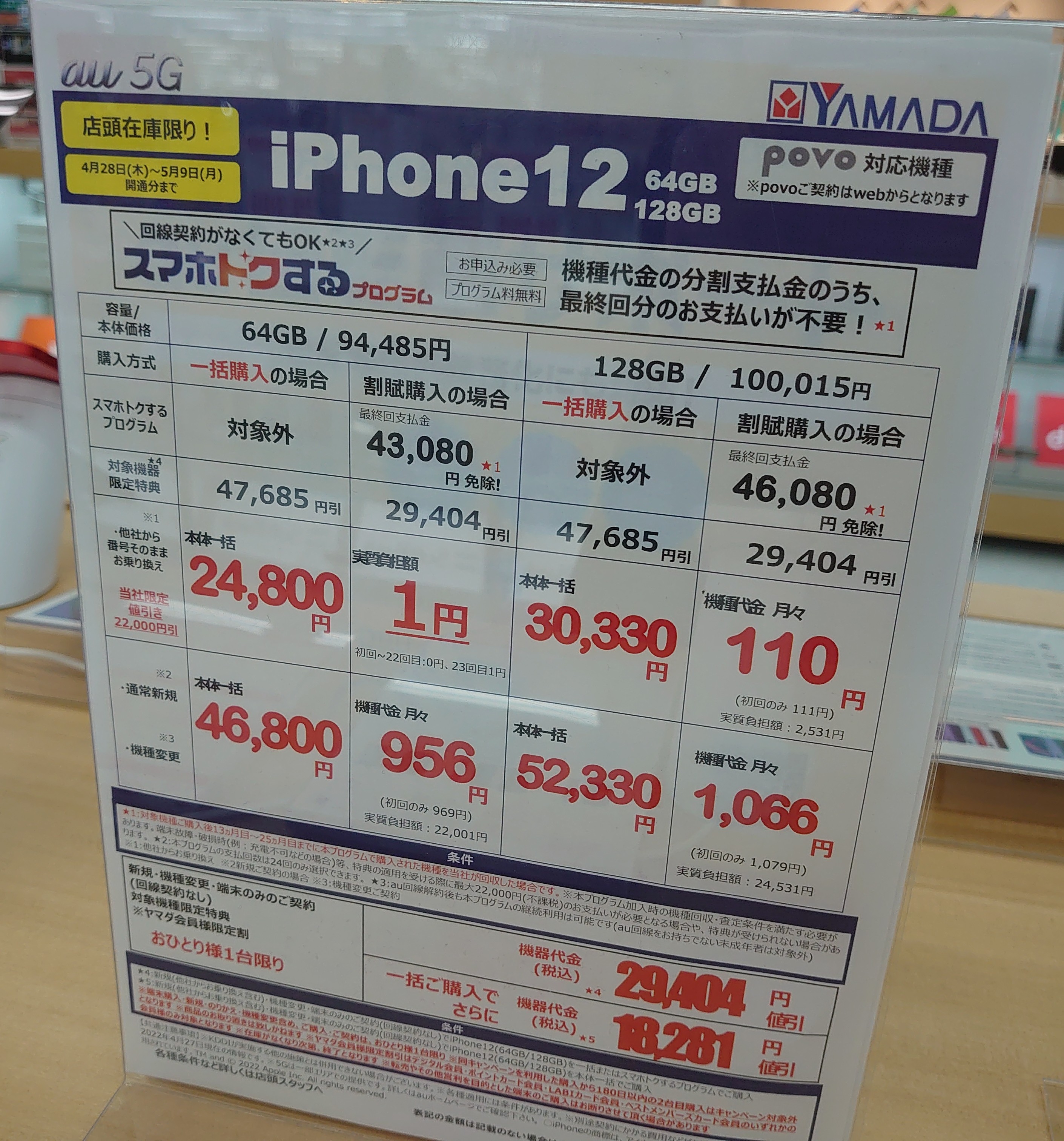 2022年4月29日(金)、ヤマダ電機ではau「iPhone 12 64GB(税込94,485円)」がMNP一括24,800円(税込)となっています。5/9(月)まで。