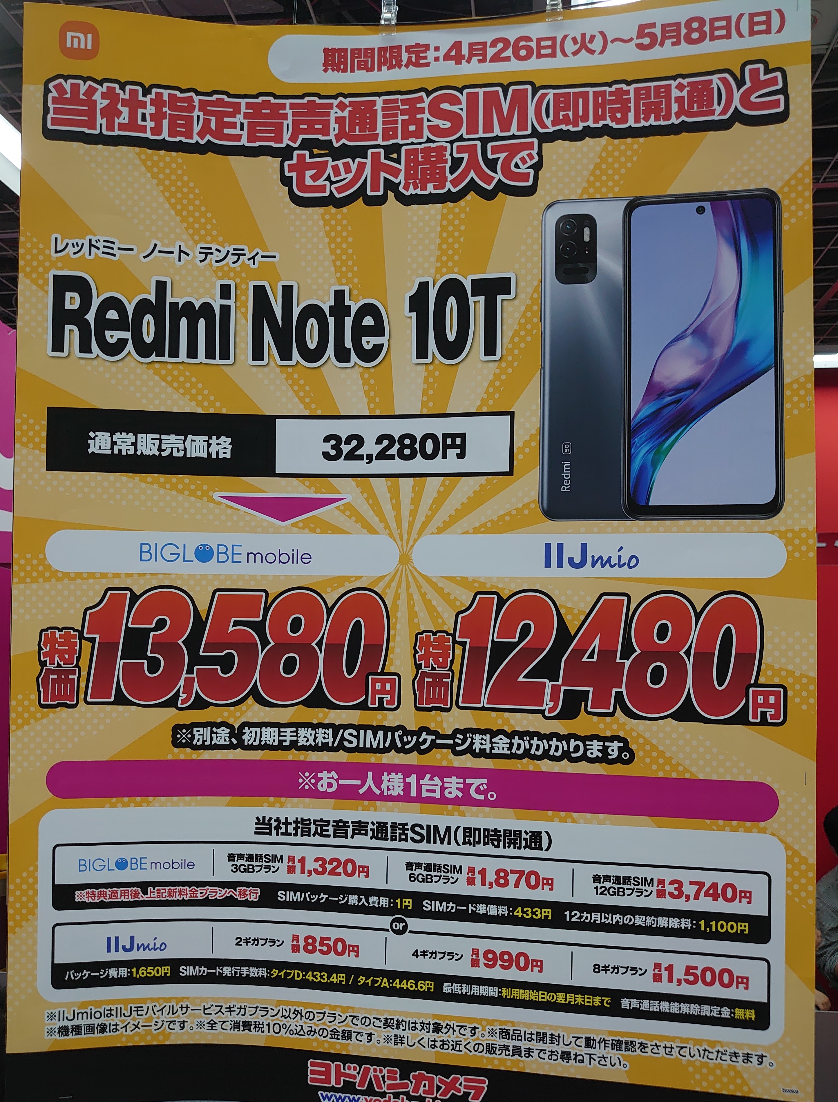 ヨドバシカメラ梅田ではビッグローブの新規・MNPで、4月26日発売でFeliCa対応の「Xiaomi Redmi Note 10T」が一括13,580円(税込)です。単体32,280円からの18,700円割引。単体価格自体が若干の割安価格となっています。事務手数料1円。