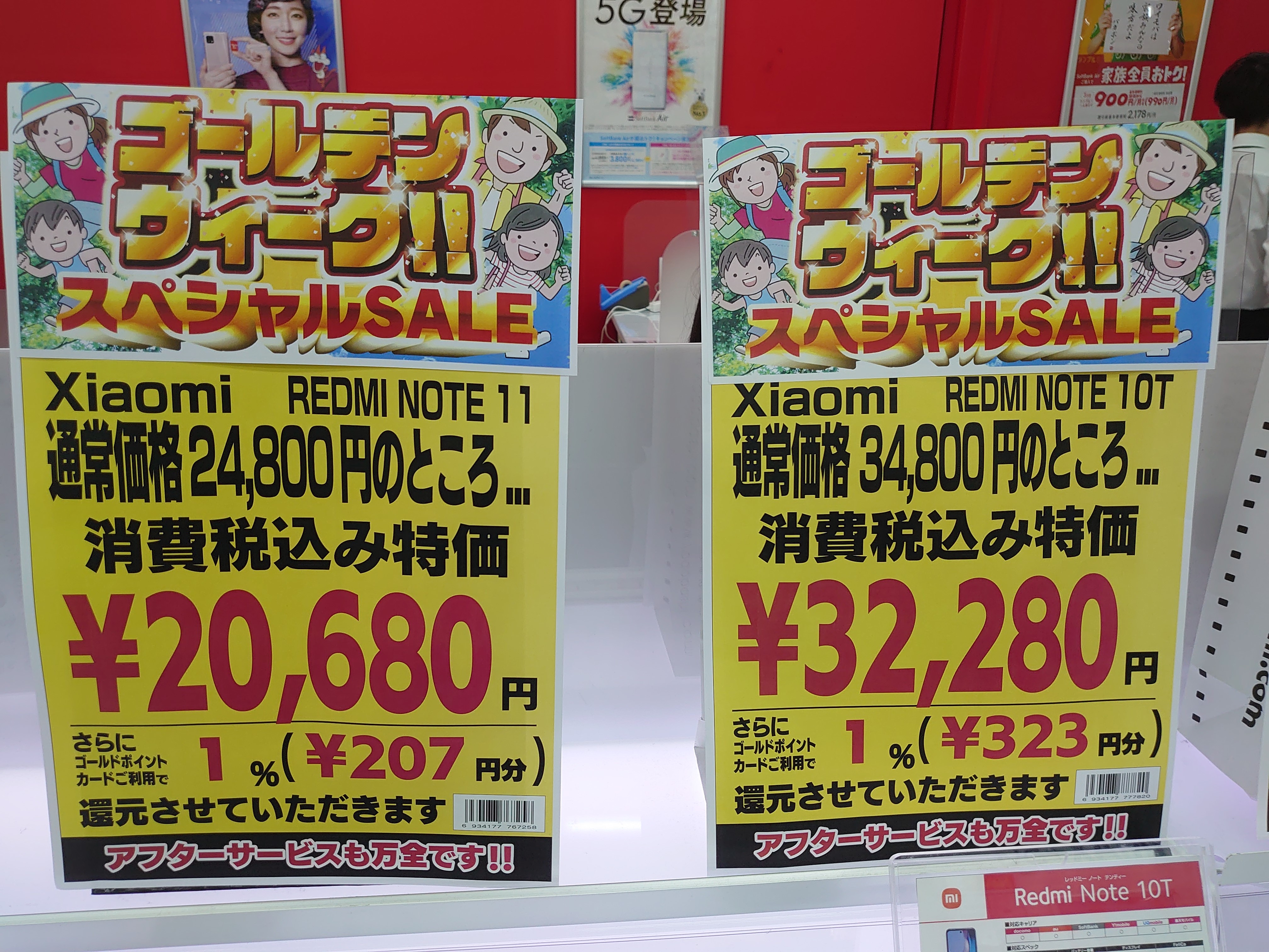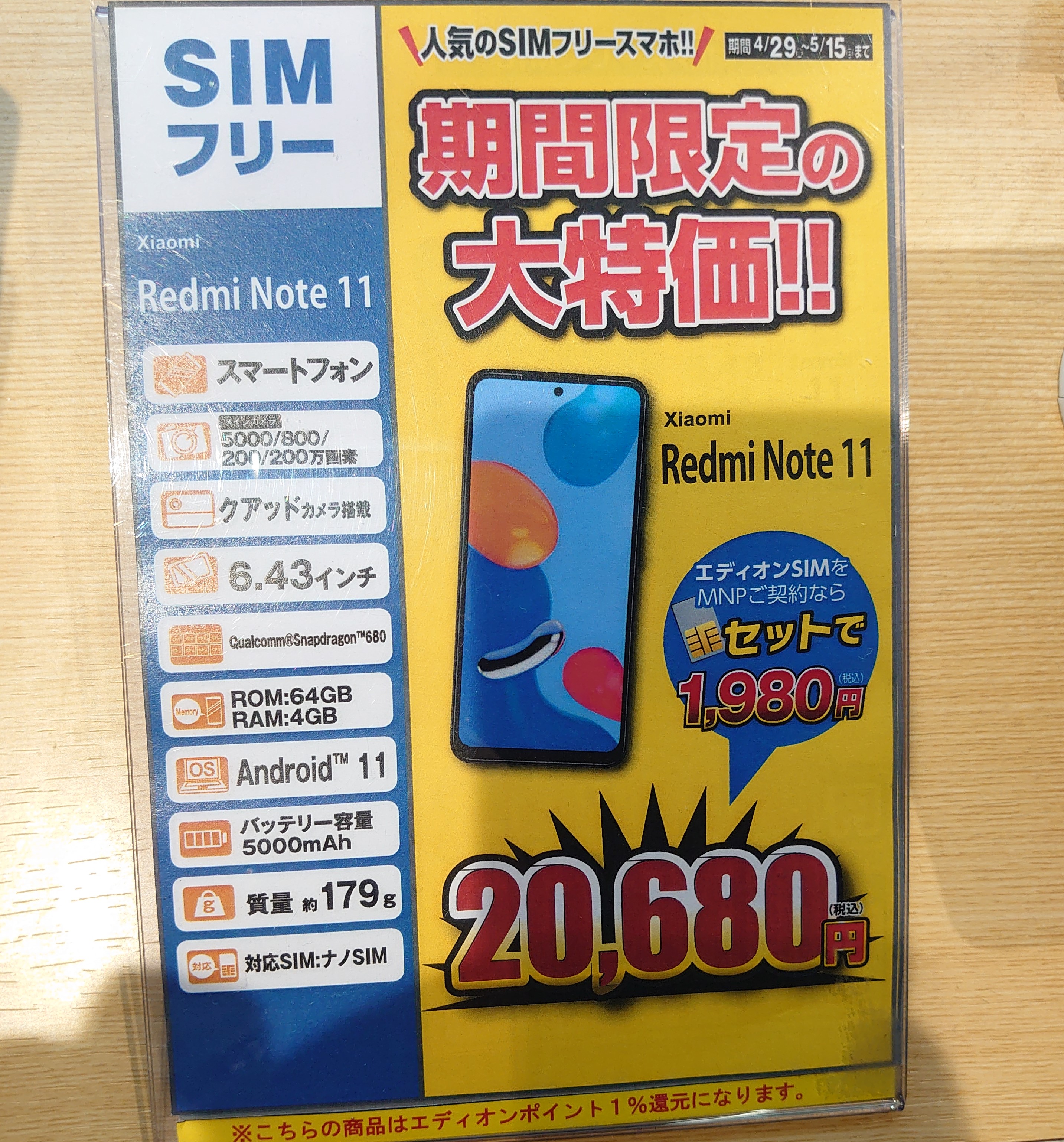 さらに、「Redmi Note 11」もGWに入って1,980円(税込)復活です。ヨドバシカメラやエディオンでは単体20,680円からの18,700円割引です。ヨドバシカメラではビッグローブへの新規・MNPが条件、エディオンはエディオンSIMへのMNPが条件となります。