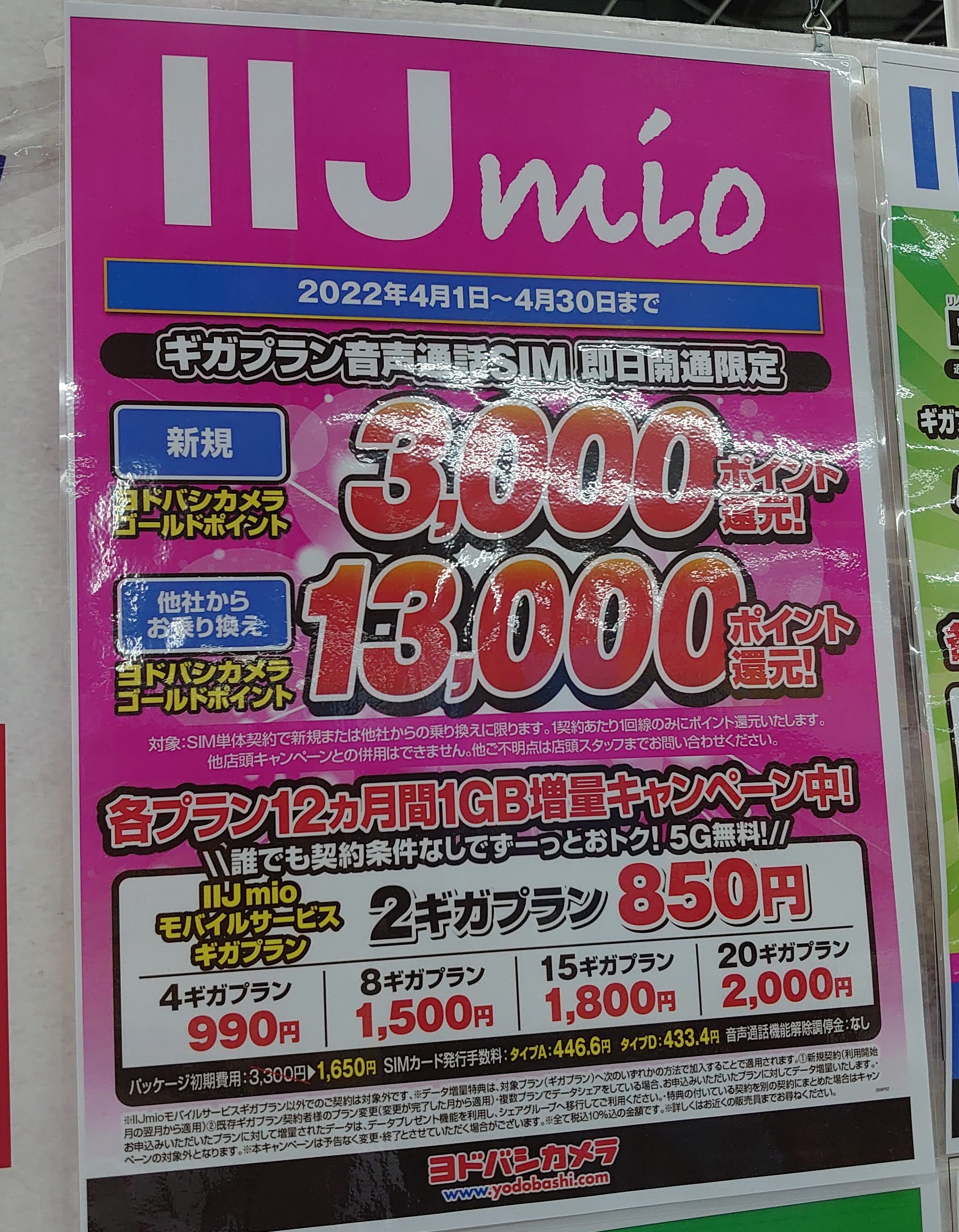 ちなみに、IIJmioに関しては、ヨドバシカメラのSIMのみMNP13,000ポイント還元も何気におトクになっています。