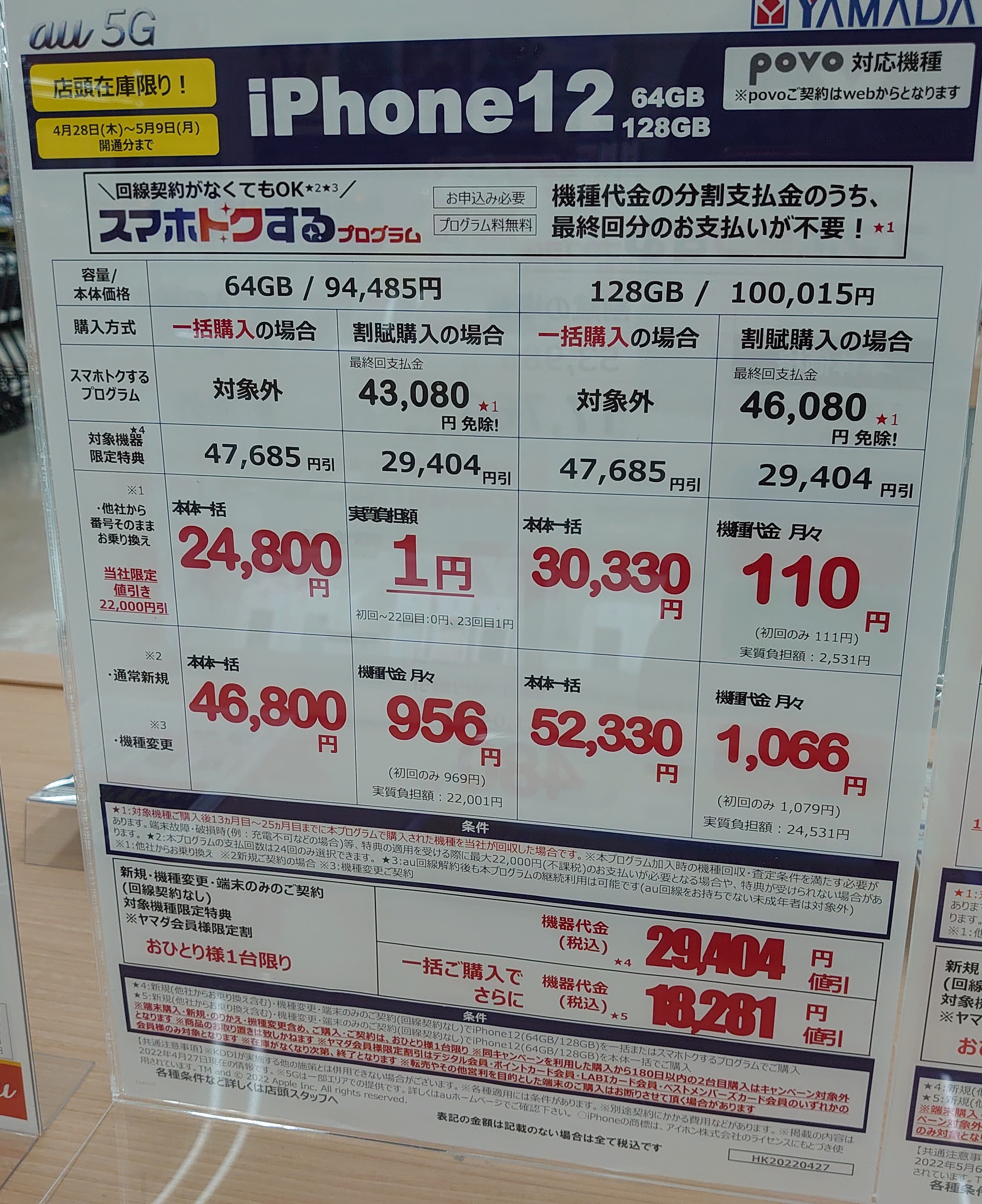 ヤマダ電機では、第3世代のau「iPhone SE 128GB(税込75,190円)」がMNP一括9,800円となっています。5/9(月)まで。