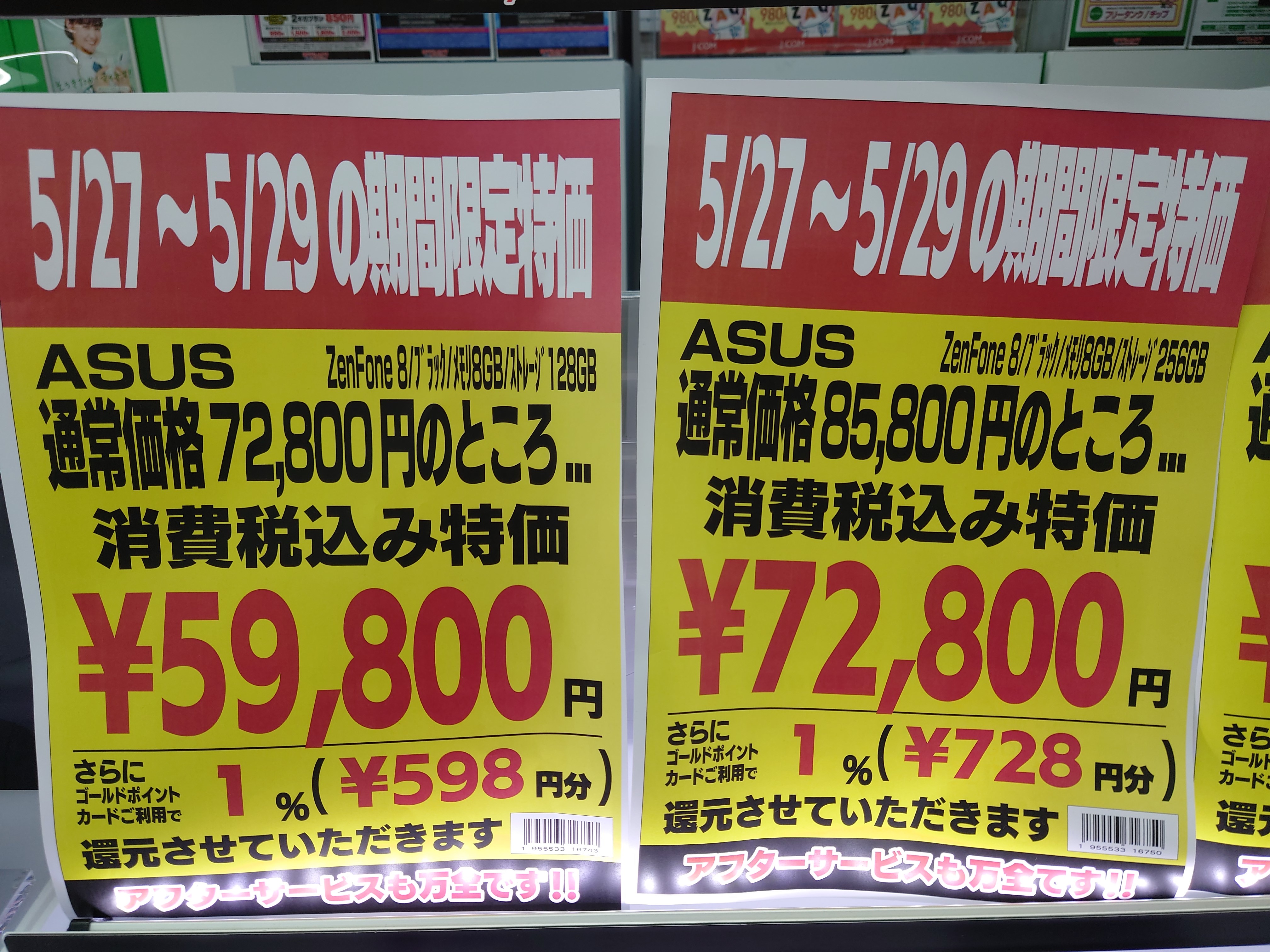 「Zenfone 8 8GB/128GB」が59,800円、「Zenfone 8 8GB/256GB」が72,800円。こちらは、Amazonタイムセールと同価格ですが、Amazonの方はケース付です。