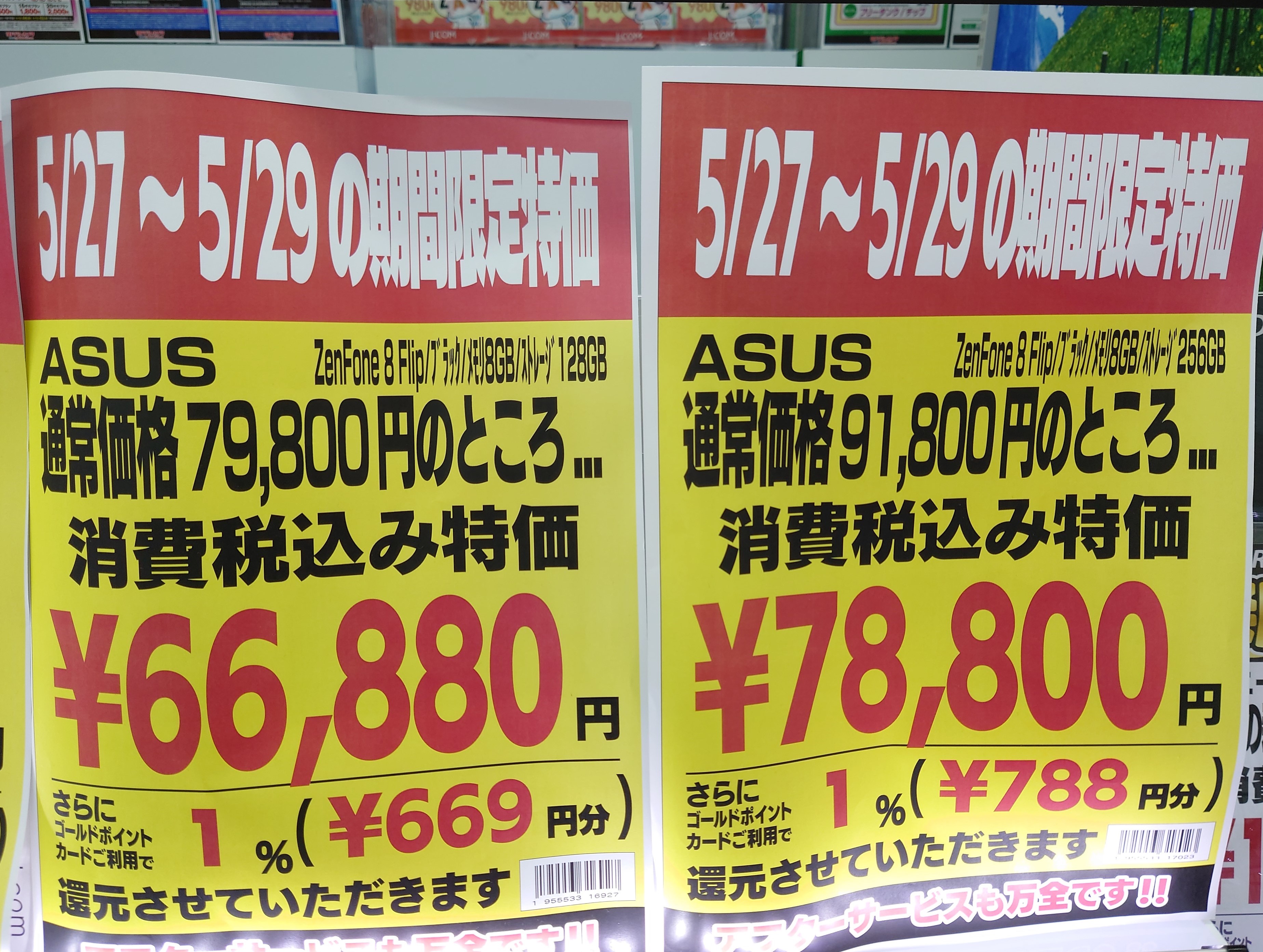 ヨドバシカメラ梅田では「Zenfone 8 Flip 8GB/128GB」が66,880円(amazonは69,800円)、「Zenfone 8 Flip 8GB/256GB」が78,800円(amazonは79,800円)となっています。amazonの方は「microSDカード64GB(880円)」がセットです。