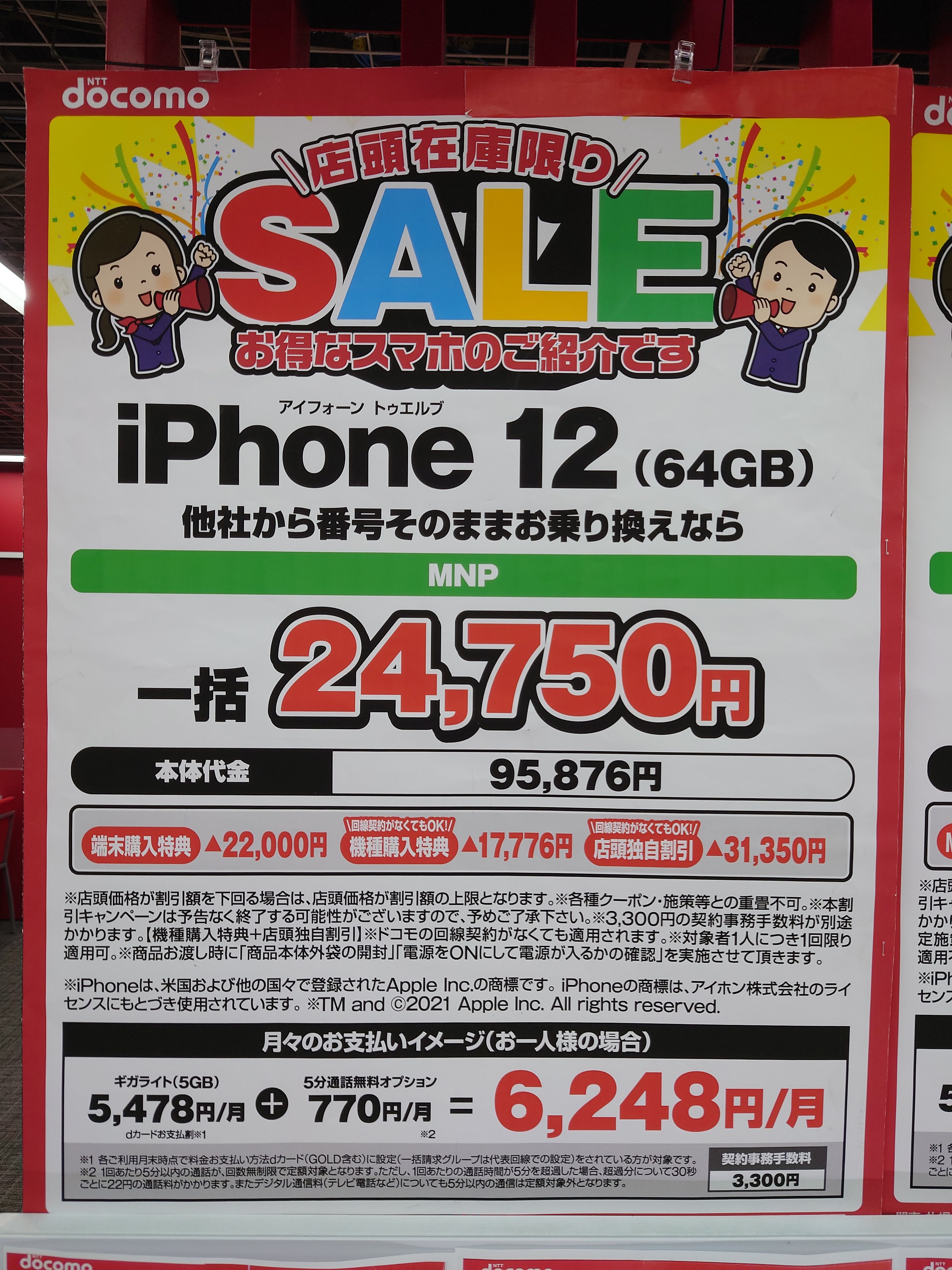 2022年6月18日(土)、ヨドバシカメラ梅田ではドコモ「iPhone 12 64GB(税込95,876円)」がMNP一括24,750円(税込)等となっています。