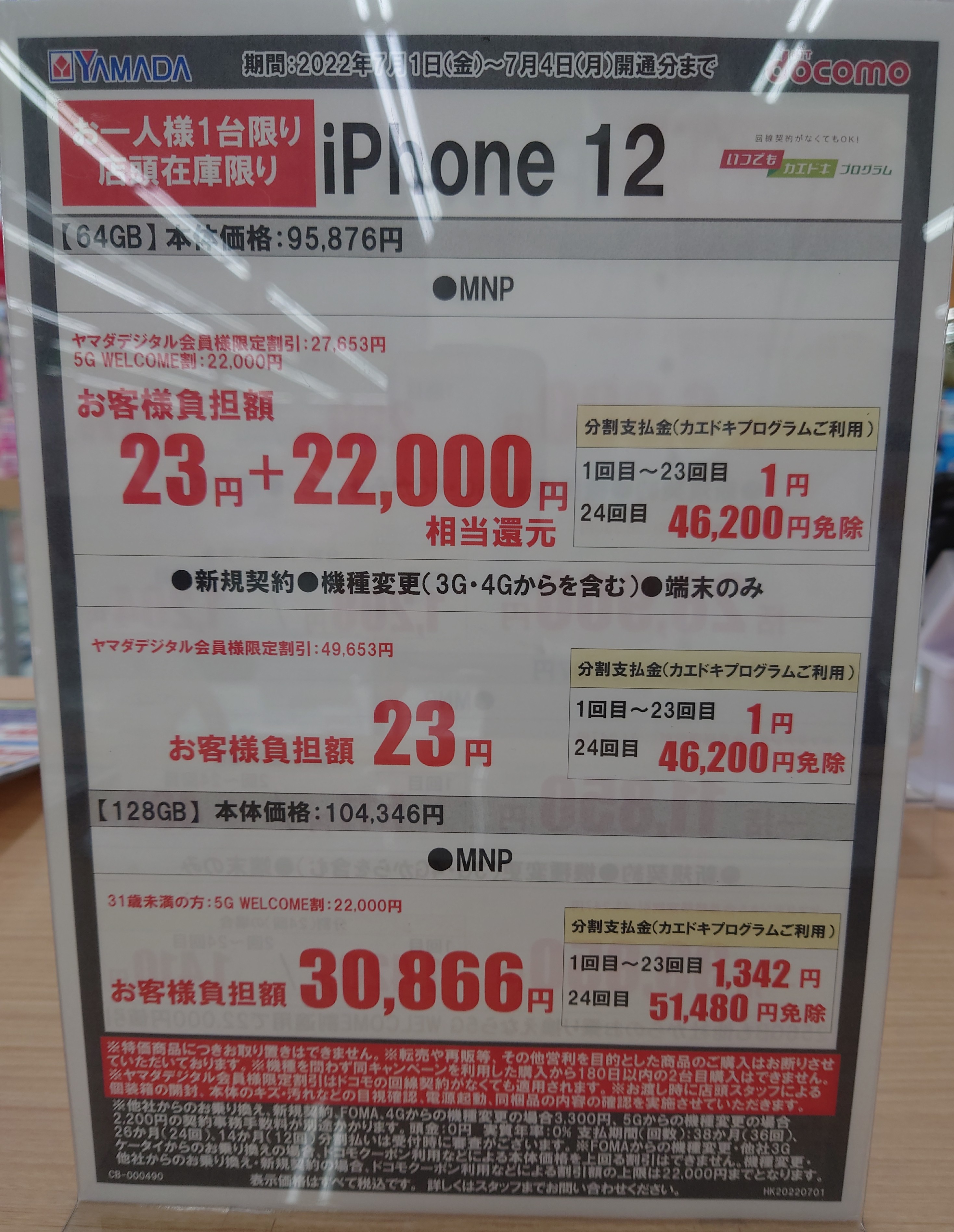 ヤマダ電機ではドコモ「iPhone SE 64GB(税込65,230円」がMNP一括6,900円(税込)となっています。事務手数料は3,300円(税込)。7/4(月)まで