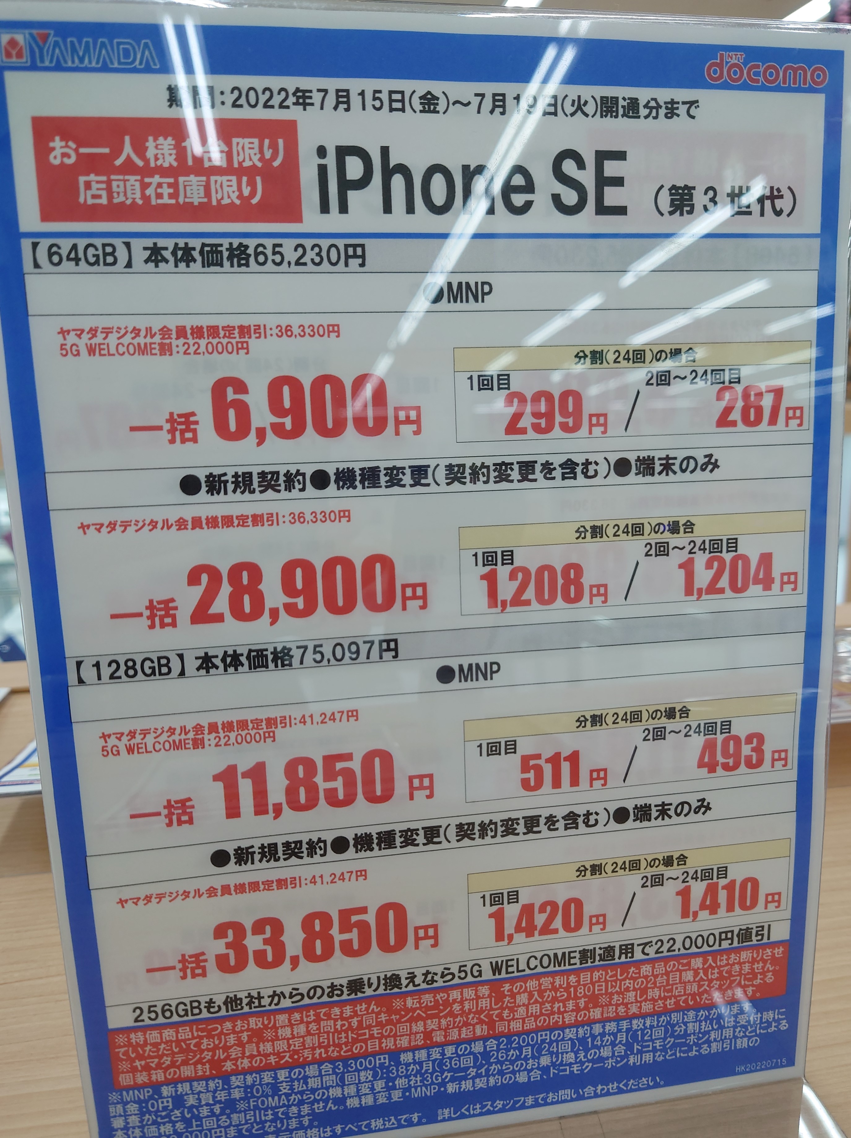 ヤマダ電機ではドコモ「iPhone SE 64GB(税込65,230円」がMNP一括6,900円(税込)となっています。事務手数料は3,300円(税込)。7/19(火)まで