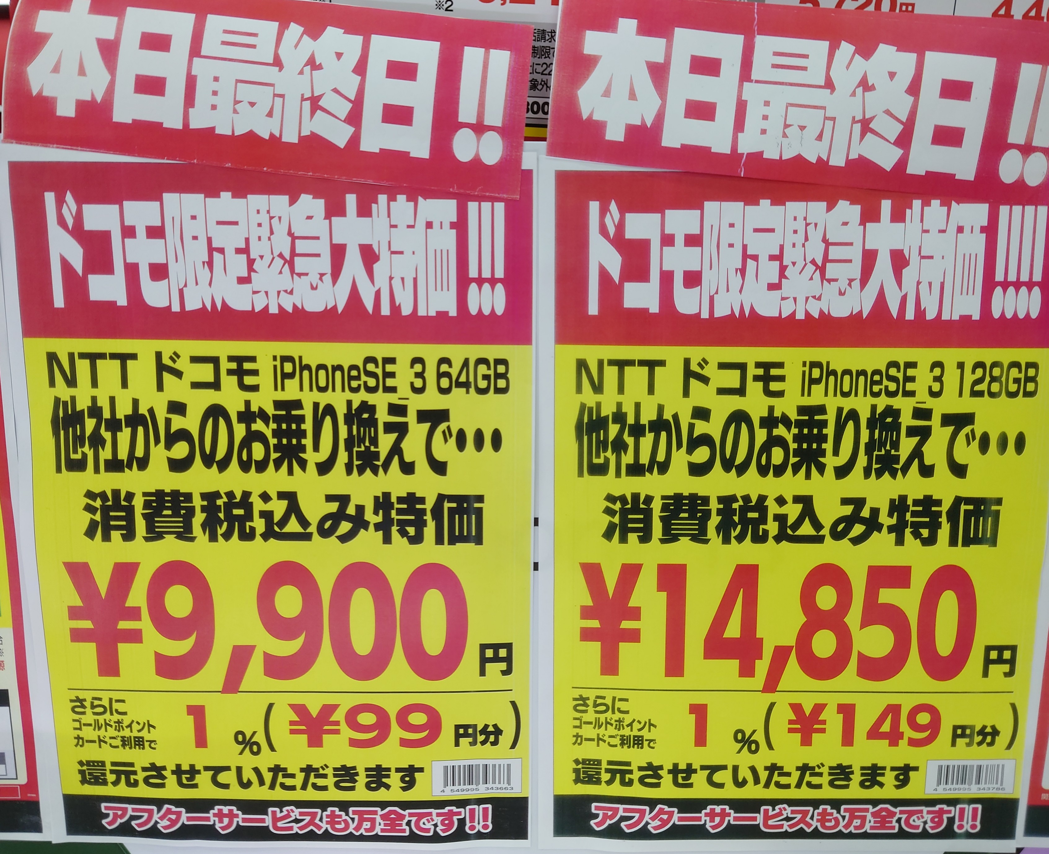【お盆最終日】ドコモ「iPhone SE 64GB」がMNP一括9,900円/ヨドバシカメラ 2022 8/16 ドコモ 2022年8月16日 当ページにはアフィリエイト広告が含まれています。 2022年8月16日(火)、ヨドバシカメラ梅田ではドコモ「iPhone SE 64GB(税込73,370円)」がMNP一括9,900円(税込)となっています。 本日お盆最終日。 ドコモ よかったらシェアしてね! URLをコピーしました! URLをコピーしました! この記事を書いた人 Sakura R5G ケータイ特価情報をお届けします。 遠慮なくコメント頂ければ結構ですが、コメントは私が承認するまで表示されませんので、ご注意下さい。 ※2024年7月1日より、参考程度の投稿以外はX(旧ツイッター)に投稿しようと思っています。 人気記事 ワイモバイル 【8/14(木)より】価格(再)更新、ワイモバイル「Google Pixel 8a」が機種変更で49,536円にPayPay還元/事務手数料0円/ヤフーショッピング店 2025年8月14日 ワイモバイル 【2025/11版】ワイモバイル「iPhone 13(認定中古品)」が機種変更一括29,520円/事務手数料3,850円/オンラインストア 2025年11月9日 楽天モバイル 【2025/12版】楽天モバイル「nubia S2R」や「Galaxy A25 5G」がMNP一括1円/事務手数料0円 2025年12月2日 ドコモ 【2025/8版】ahamoへのSIMのみMNPで20,000dポイント(分割進呈)/事務手数料0円/NTTドコモ 2025年8月10日 楽天モバイル 【7/1(火)より】楽天モバイルへのMNPで▲22,000円割引/「Nothing Phone (3a)」が一括32,890円など/事務手数料0円 2025年7月1日 新着記事 【1/10(土)】 Joshin webで「Xiaomi 14T Pro 512GB(パッケージ不良)」が79,800円 【1/15(木)発売】楽天モバイル「Nothing Phone (3a) Lite」が32,890円/はじめて申し込み&MNPで16,000ポイント/2回線目以降は新規で6,000ポイント 【1/13(火)まで】UQモバイル「自宅セット割」適用で10,000ポイント追加還元/ビックカメラ コメント コメントする コメントをキャンセルコメント ※ 名前 メール サイト 新しいコメントをメールで通知 新しい投稿をメールで受け取る