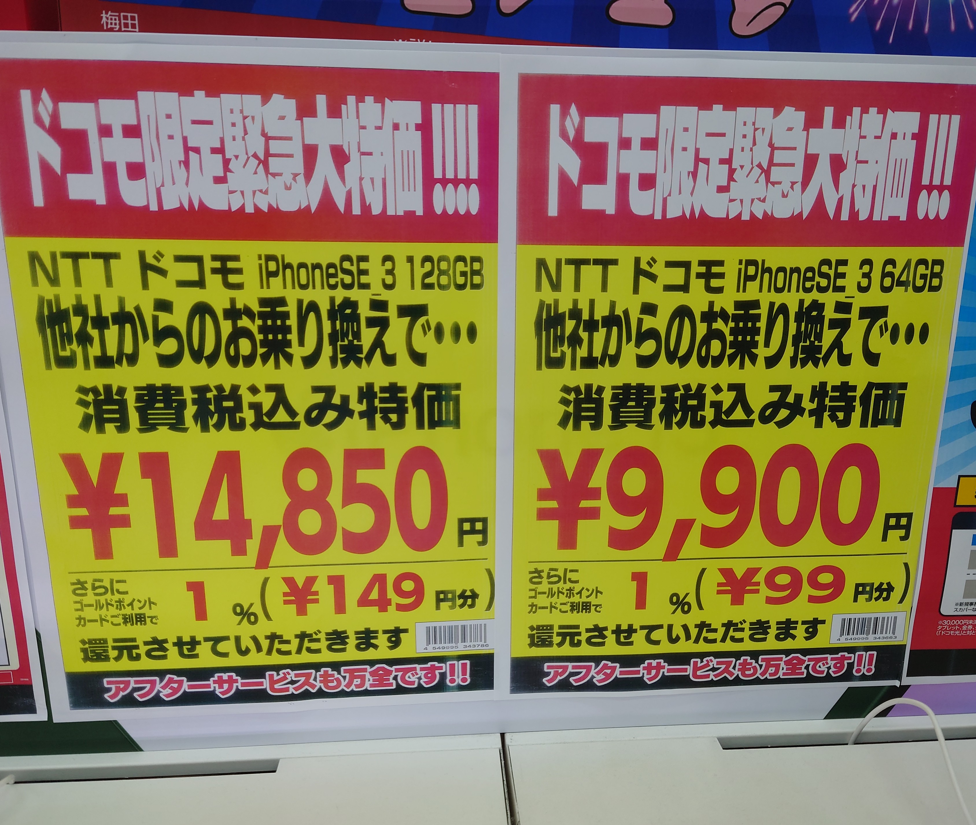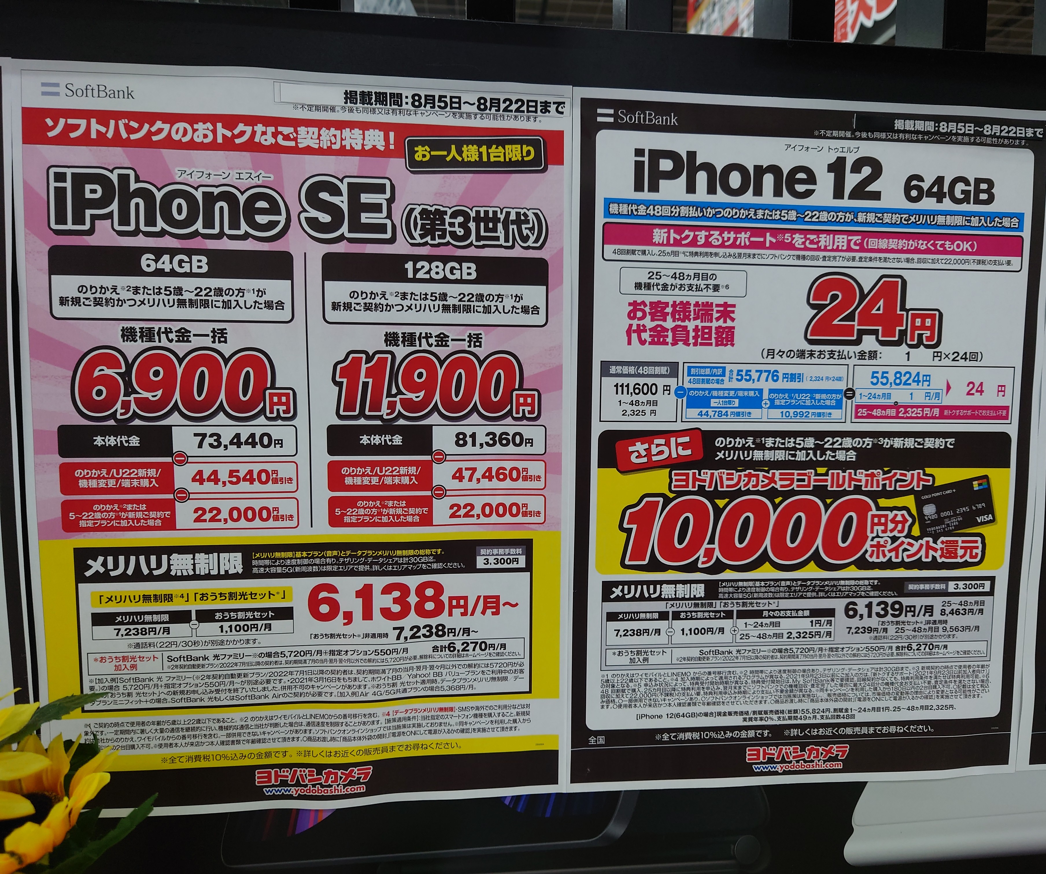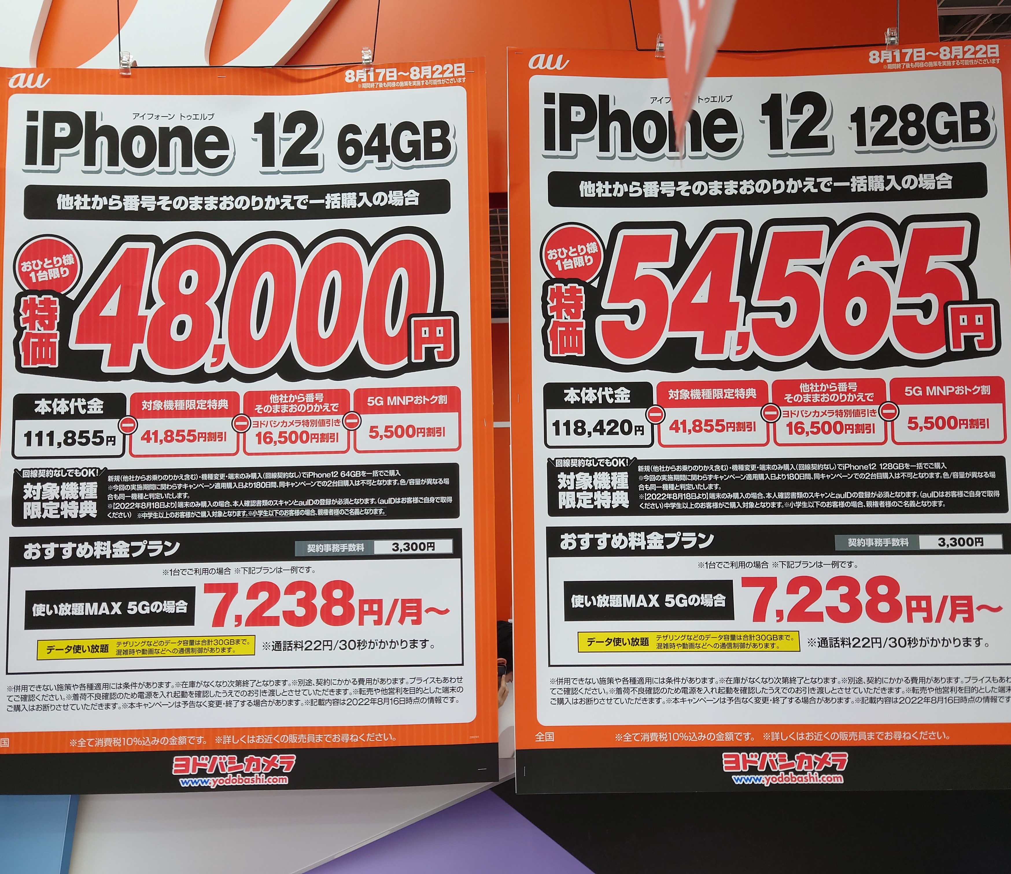【8/20(土)】ヨドバシカメラ/au「iPhone 12 128GB」がMNP一括54,565円など 2022 8/20 au 2022年8月20日 当ページにはアフィリエイト広告が含まれています。 2022年8月20日(土)、ヨドバシカメラ梅田ではau「iPhone 12 128GB(税込118,420円)」が、MNP一括54,565円(税込)等となっています。 au よかったらシェアしてね! URLをコピーしました! URLをコピーしました! この記事を書いた人 Sakura R5G ケータイ特価情報をお届けします。 遠慮なくコメント頂ければ結構ですが、コメントは私が承認するまで表示されませんので、ご注意下さい。 ※2024年7月1日より、参考程度の投稿以外はX(旧ツイッター)に投稿しようと思っています。 人気記事 ワイモバイル 【8/14(木)より】価格(再)更新、ワイモバイル「Google Pixel 8a」が機種変更で49,536円にPayPay還元/事務手数料0円/ヤフーショッピング店 2025年8月14日 ワイモバイル 【2025/11版】ワイモバイル「iPhone 13(認定中古品)」が機種変更一括29,520円/事務手数料3,850円/オンラインストア 2025年11月9日 楽天モバイル 【2025/12版】楽天モバイル「nubia S2R」や「Galaxy A25 5G」がMNP一括1円/事務手数料0円 2025年12月2日 ドコモ 【2025/8版】ahamoへのSIMのみMNPで20,000dポイント(分割進呈)/事務手数料0円/NTTドコモ 2025年8月10日 楽天モバイル 【7/1(火)より】楽天モバイルへのMNPで▲22,000円割引/「Nothing Phone (3a)」が一括32,890円など/事務手数料0円 2025年7月1日 新着記事 【1/10(土)】 Joshin webで「Xiaomi 14T Pro 512GB(パッケージ不良)」が79,800円 【1/15(木)発売】楽天モバイル「Nothing Phone (3a) Lite」が32,890円/はじめて申し込み&MNPで16,000ポイント/2回線目以降は新規で6,000ポイント 【1/13(火)まで】UQモバイル「自宅セット割」適用で10,000ポイント追加還元/ビックカメラ コメント コメントする コメントをキャンセルコメント ※ 名前 メール サイト 新しいコメントをメールで通知 新しい投稿をメールで受け取る