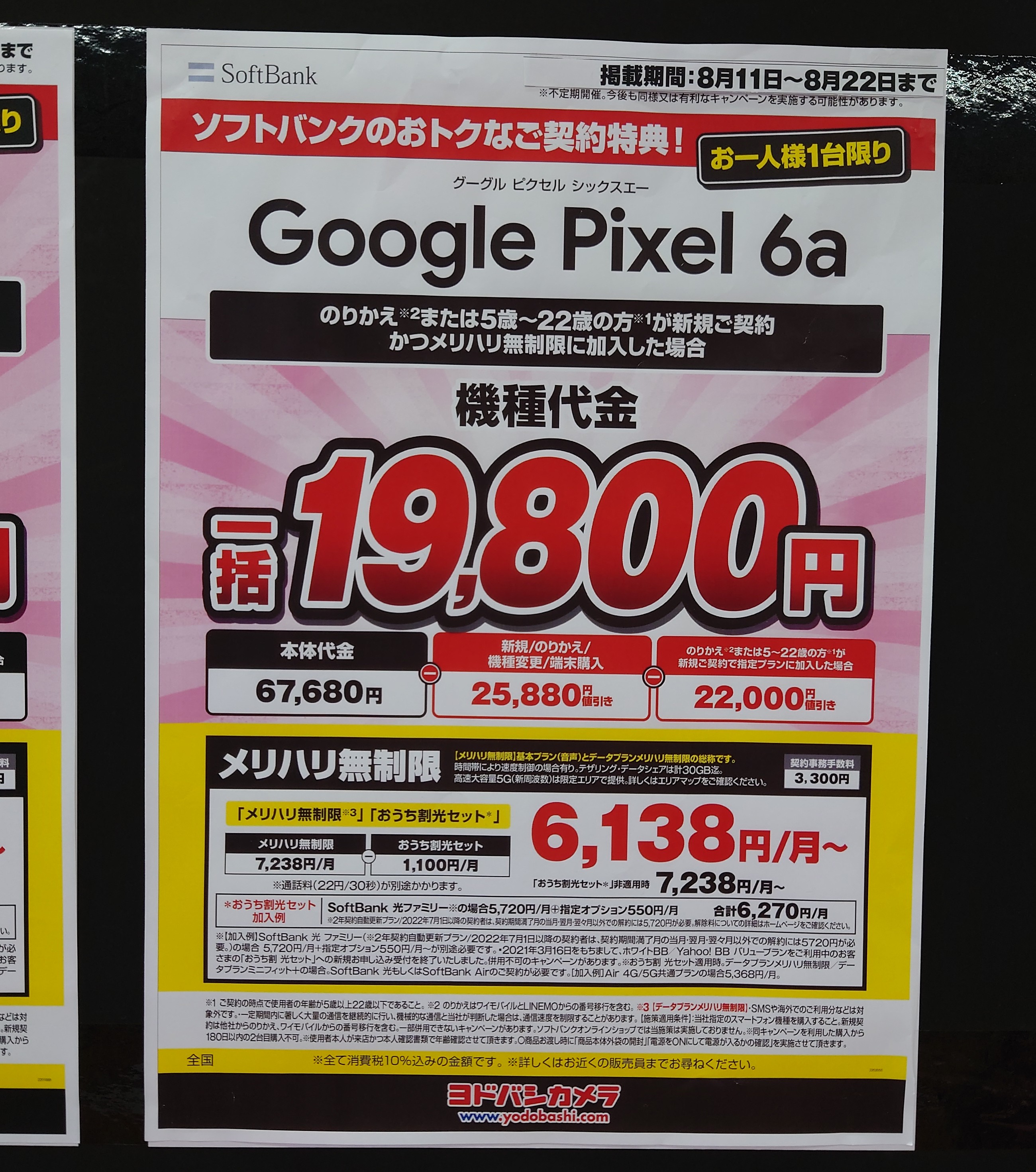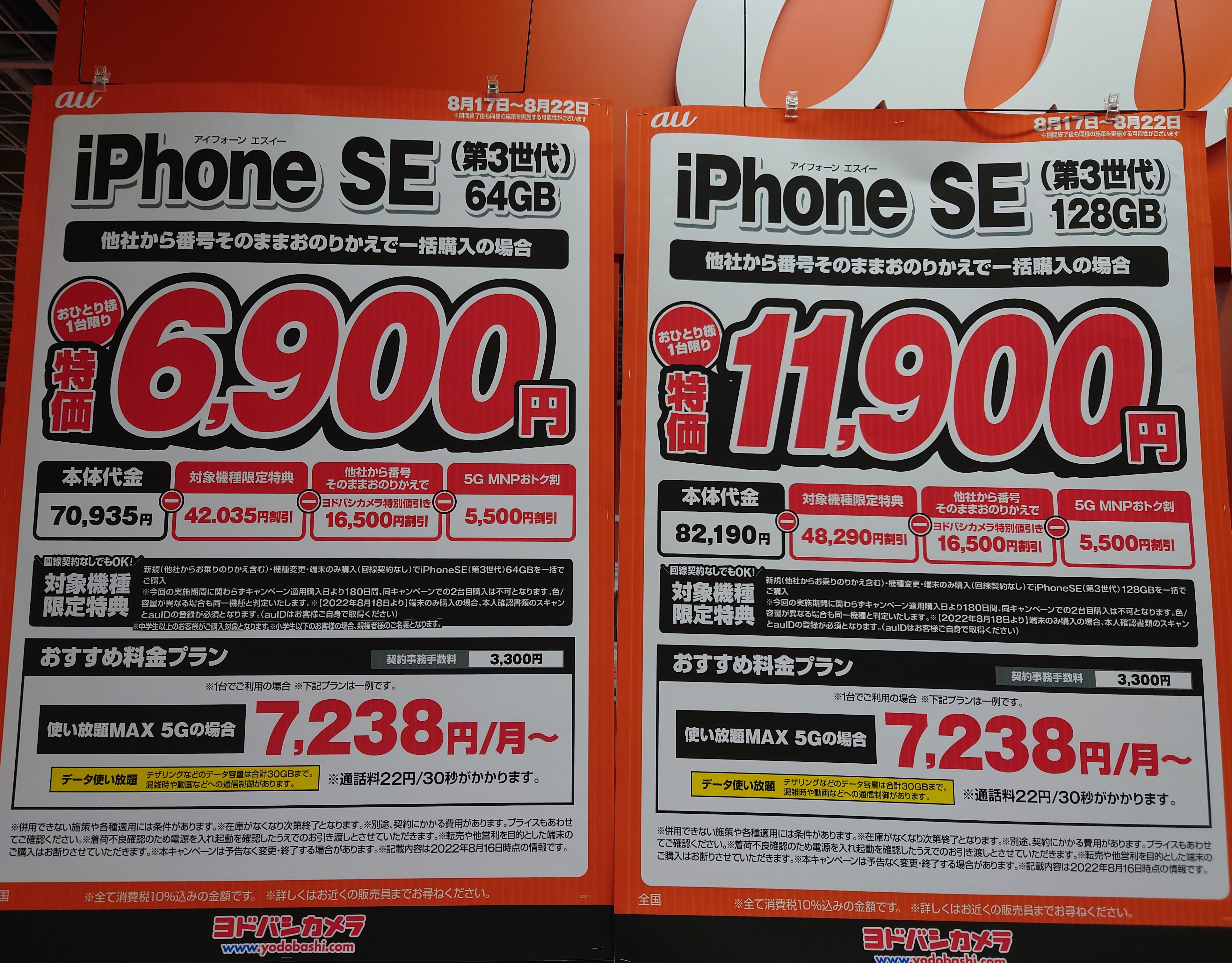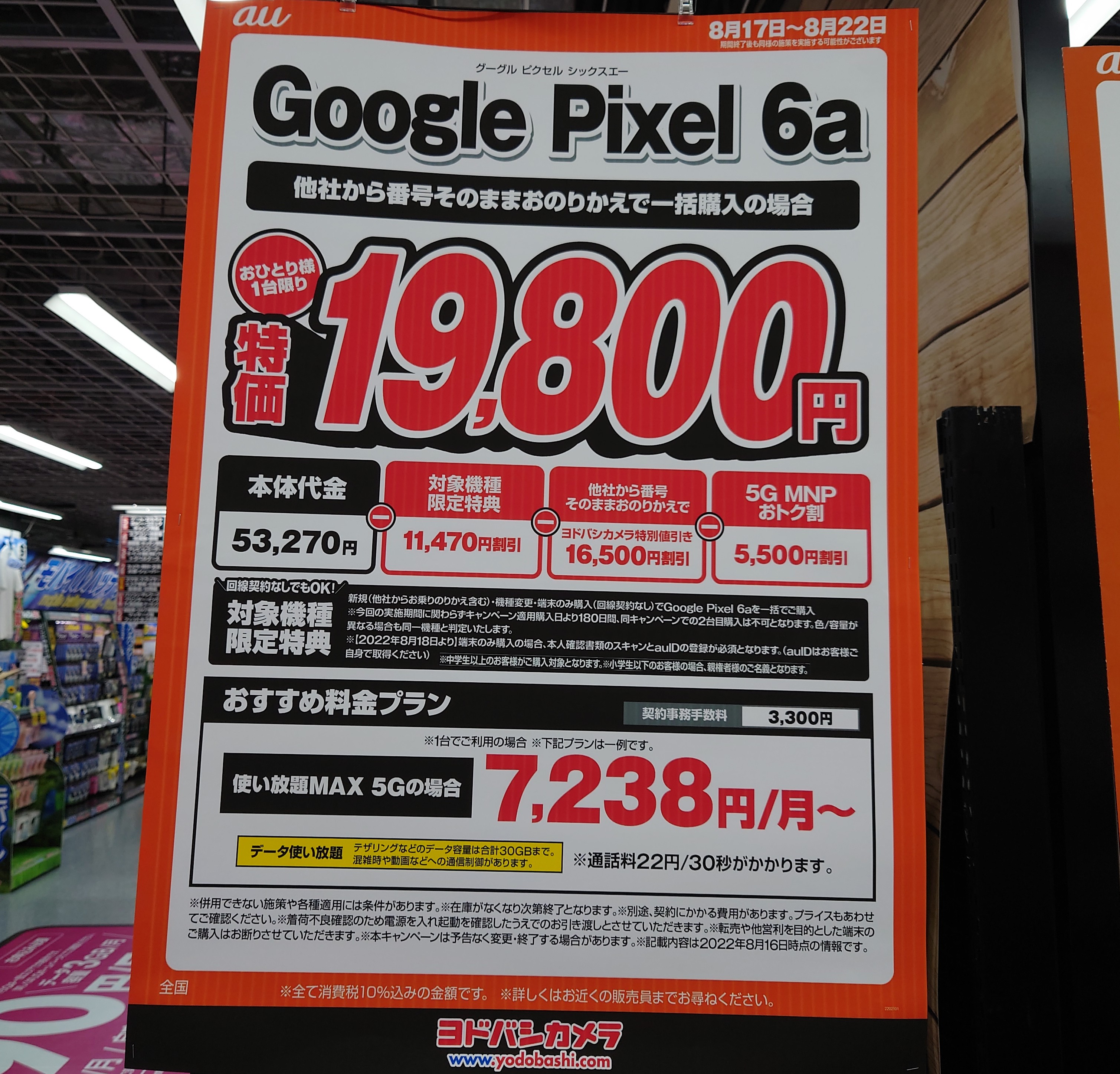 【8/20(土)】ヨドバシカメラ/au「iPhone 12 128GB」がMNP一括54,565円など 2022 8/20 au 2022年8月20日 当ページにはアフィリエイト広告が含まれています。 2022年8月20日(土)、ヨドバシカメラ梅田ではau「iPhone 12 128GB(税込118,420円)」が、MNP一括54,565円(税込)等となっています。 au よかったらシェアしてね! URLをコピーしました! URLをコピーしました! この記事を書いた人 Sakura R5G ケータイ特価情報をお届けします。 遠慮なくコメント頂ければ結構ですが、コメントは私が承認するまで表示されませんので、ご注意下さい。 ※2024年7月1日より、参考程度の投稿以外はX(旧ツイッター)に投稿しようと思っています。 人気記事 ワイモバイル 【8/14(木)より】価格(再)更新、ワイモバイル「Google Pixel 8a」が機種変更で49,536円にPayPay還元/事務手数料0円/ヤフーショッピング店 2025年8月14日 ワイモバイル 【2025/11版】ワイモバイル「iPhone 13(認定中古品)」が機種変更一括29,520円/事務手数料3,850円/オンラインストア 2025年11月9日 楽天モバイル 【2025/12版】楽天モバイル「nubia S2R」や「Galaxy A25 5G」がMNP一括1円/事務手数料0円 2025年12月2日 ドコモ 【2025/8版】ahamoへのSIMのみMNPで20,000dポイント(分割進呈)/事務手数料0円/NTTドコモ 2025年8月10日 楽天モバイル 【7/1(火)より】楽天モバイルへのMNPで▲22,000円割引/「Nothing Phone (3a)」が一括32,890円など/事務手数料0円 2025年7月1日 新着記事 【1/10(土)】 Joshin webで「Xiaomi 14T Pro 512GB(パッケージ不良)」が79,800円 【1/15(木)発売】楽天モバイル「Nothing Phone (3a) Lite」が32,890円/はじめて申し込み&MNPで16,000ポイント/2回線目以降は新規で6,000ポイント 【1/13(火)まで】UQモバイル「自宅セット割」適用で10,000ポイント追加還元/ビックカメラ コメント コメントする コメントをキャンセルコメント ※ 名前 メール サイト 新しいコメントをメールで通知 新しい投稿をメールで受け取る