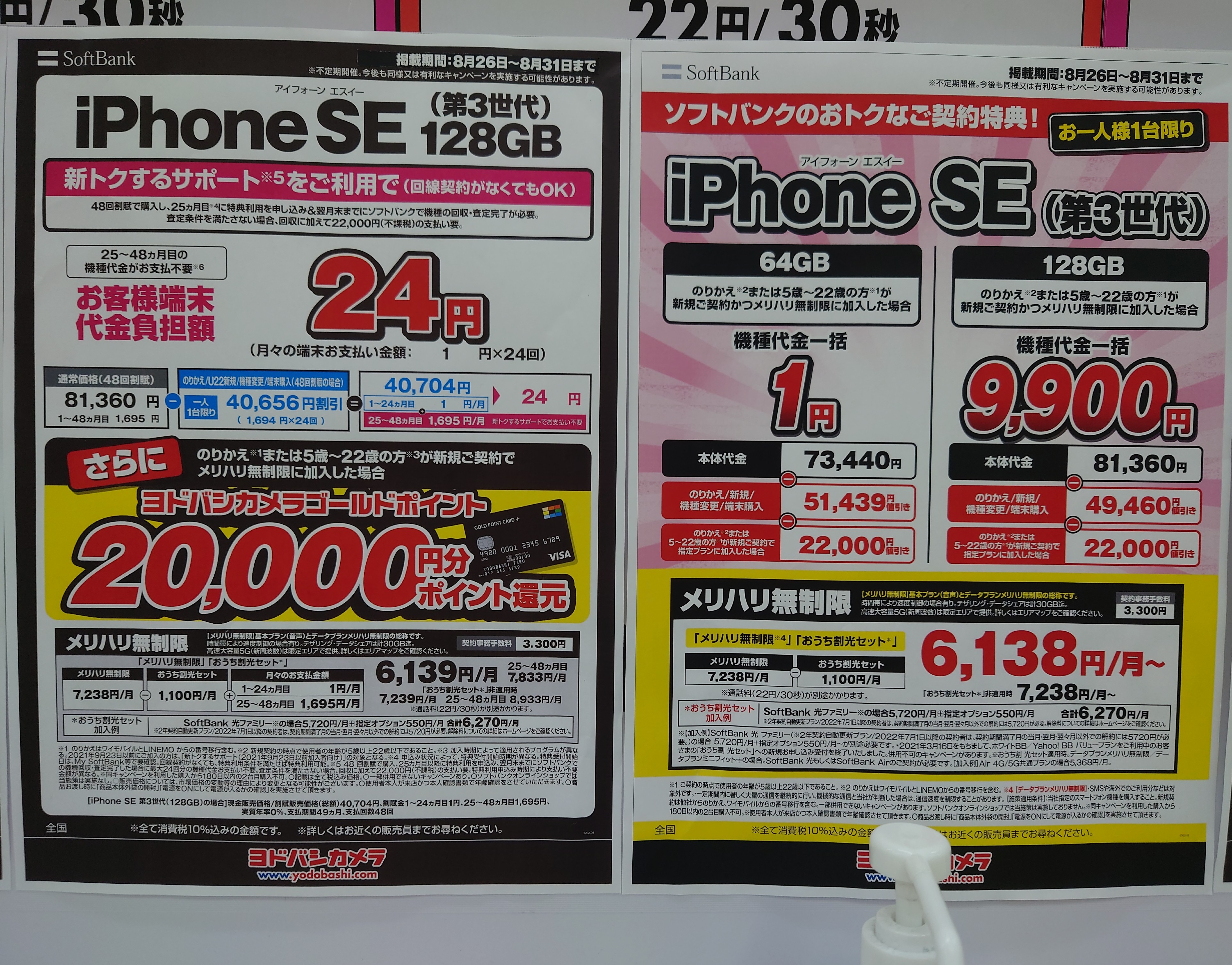 2022年8月27日(土)、ヨドバシカメラ梅田ではドコモ「iPhone SE 64GB(税込73,370円)」がMNP一括1円(税込)となっています。8/31(水)まで。