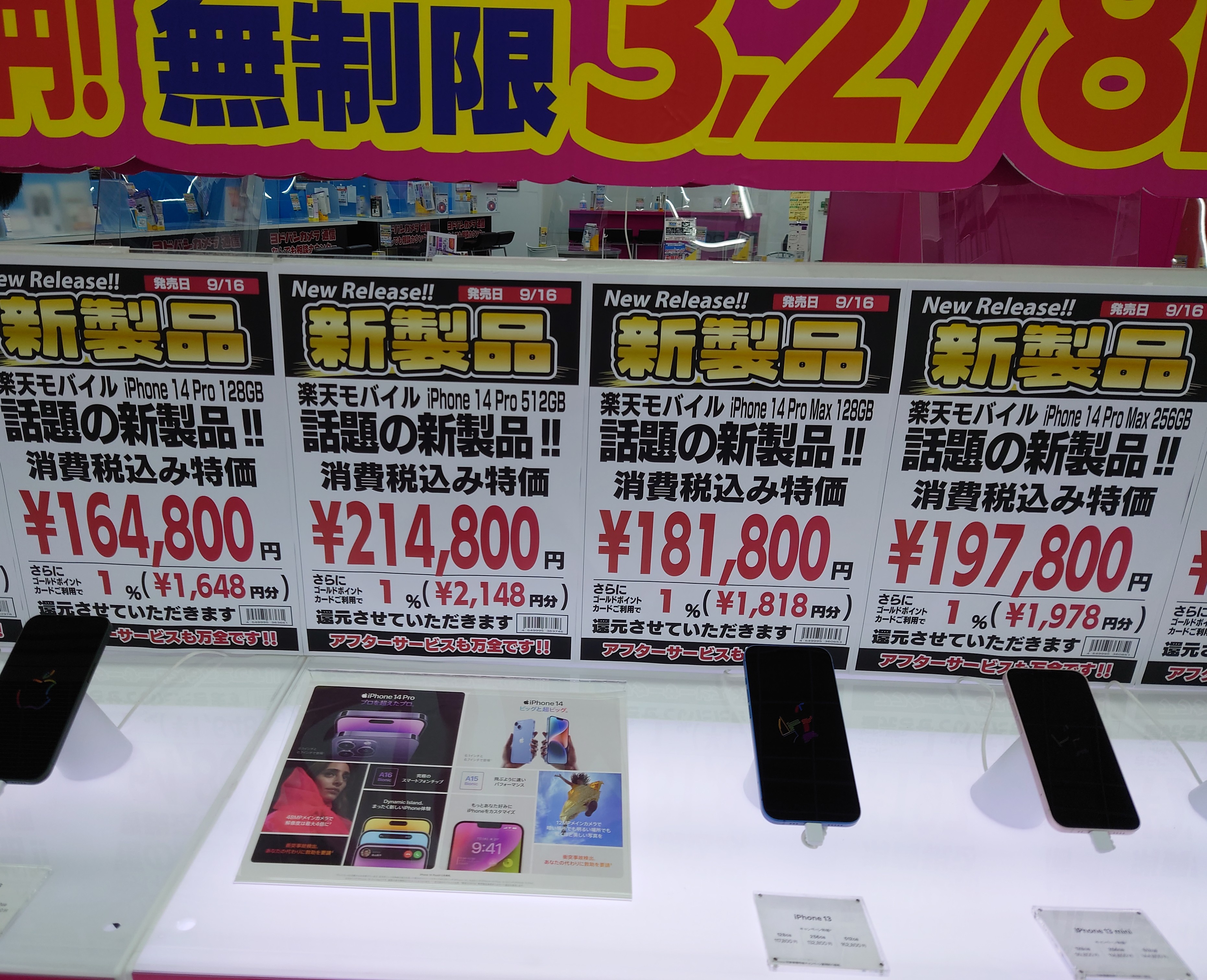 楽天モバイル「iPhone 14 Pro 128GB(税込164,800円)」は在庫有り。楽天市場店(ネット)契約と比較すると、16,000円直接割引無し(ポイントで還元)や、1%ポイント還元のみですのでオトク感はありませんが、特にヨドバシポイントを使いたい方は。