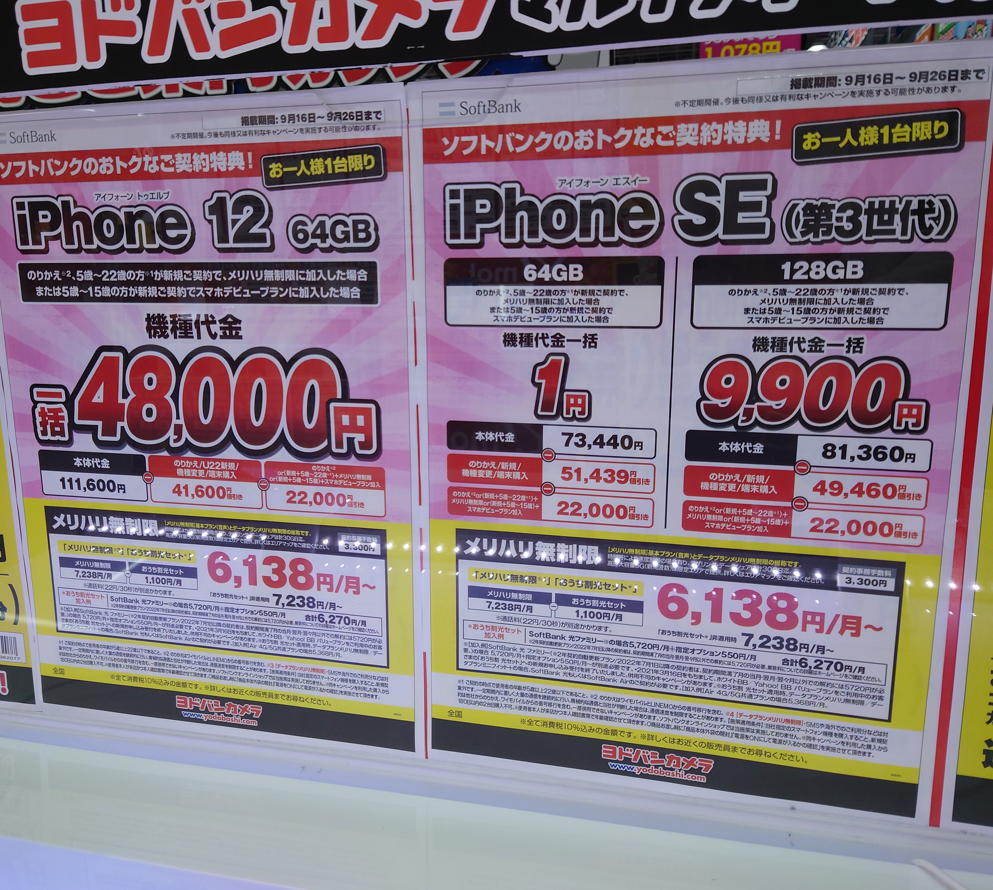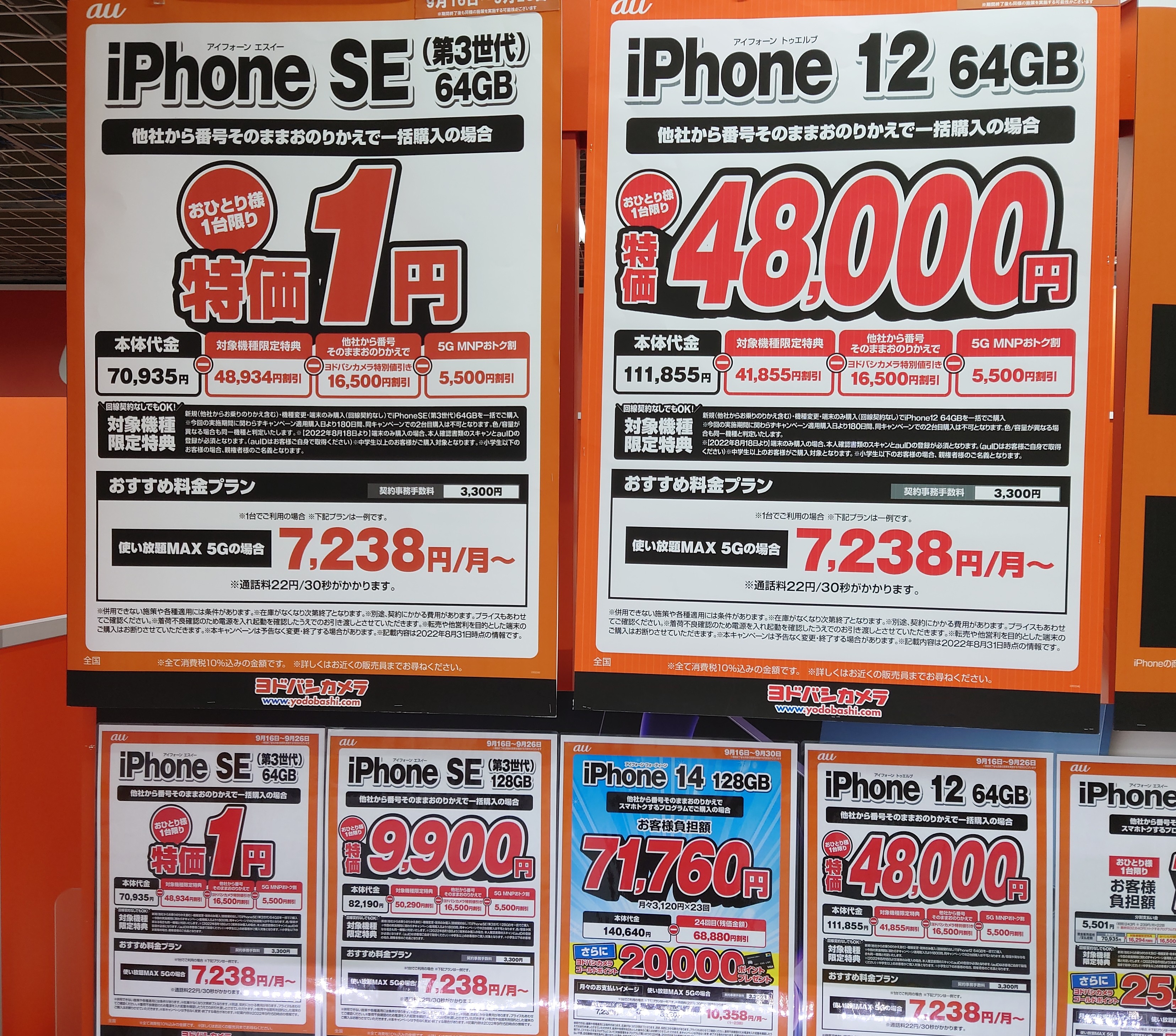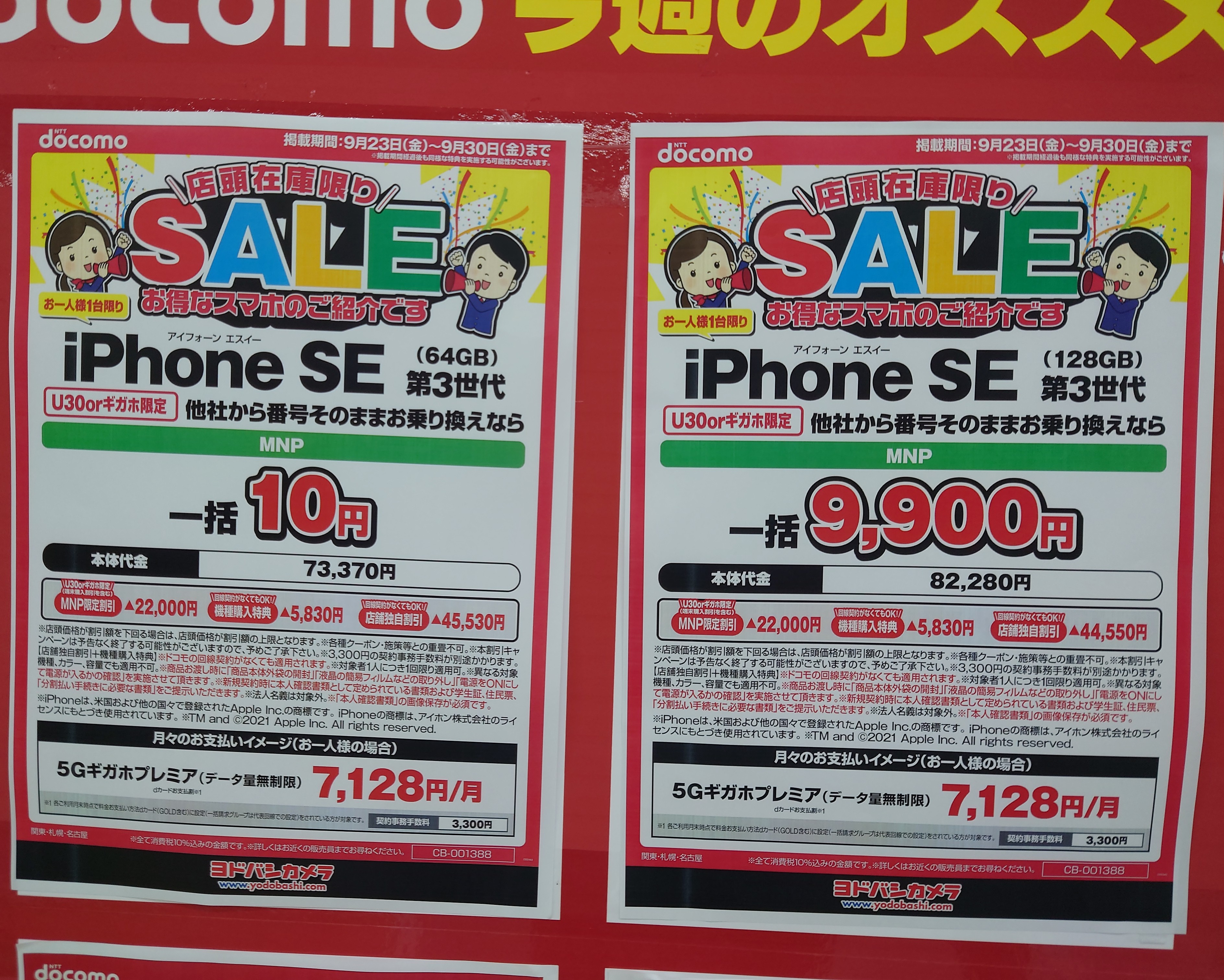 2022年9月23日(金)、ヨドバシカメラ梅田ではドコモ「iPhone SE 64GB(税込73,370円)」がMNP一括10円となっています。条件はギガホ契約、若しくは30歳以下(プラン指定無)。