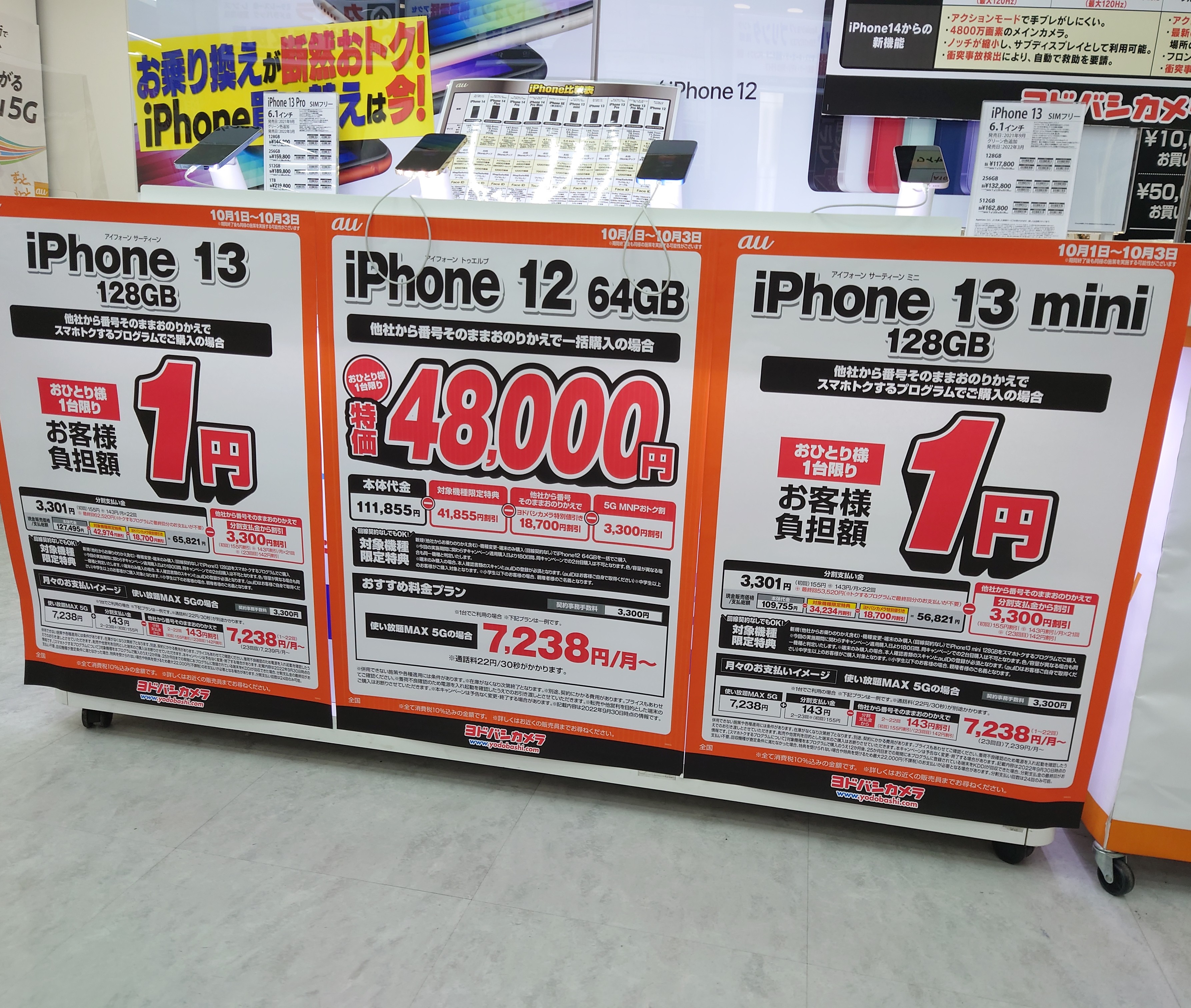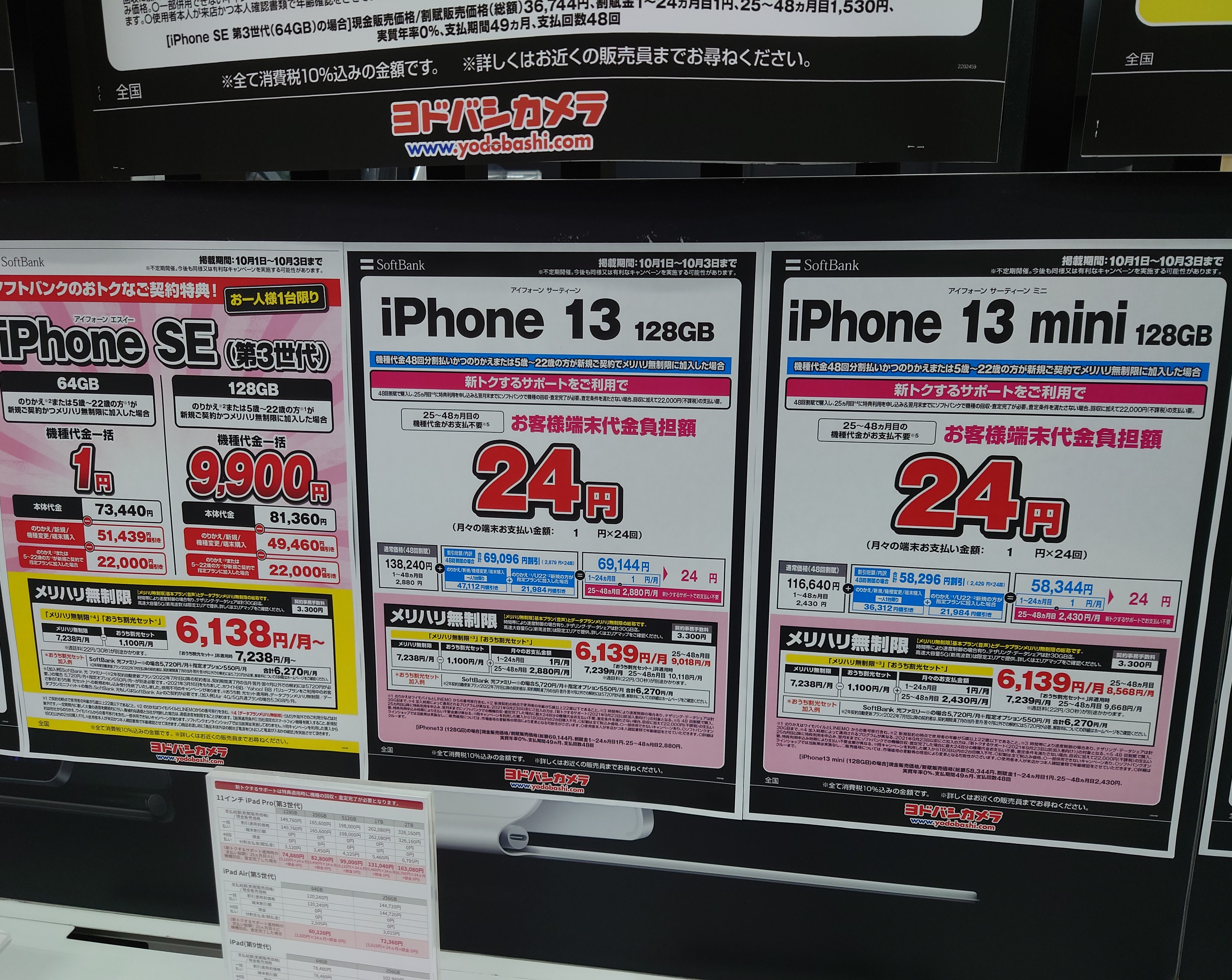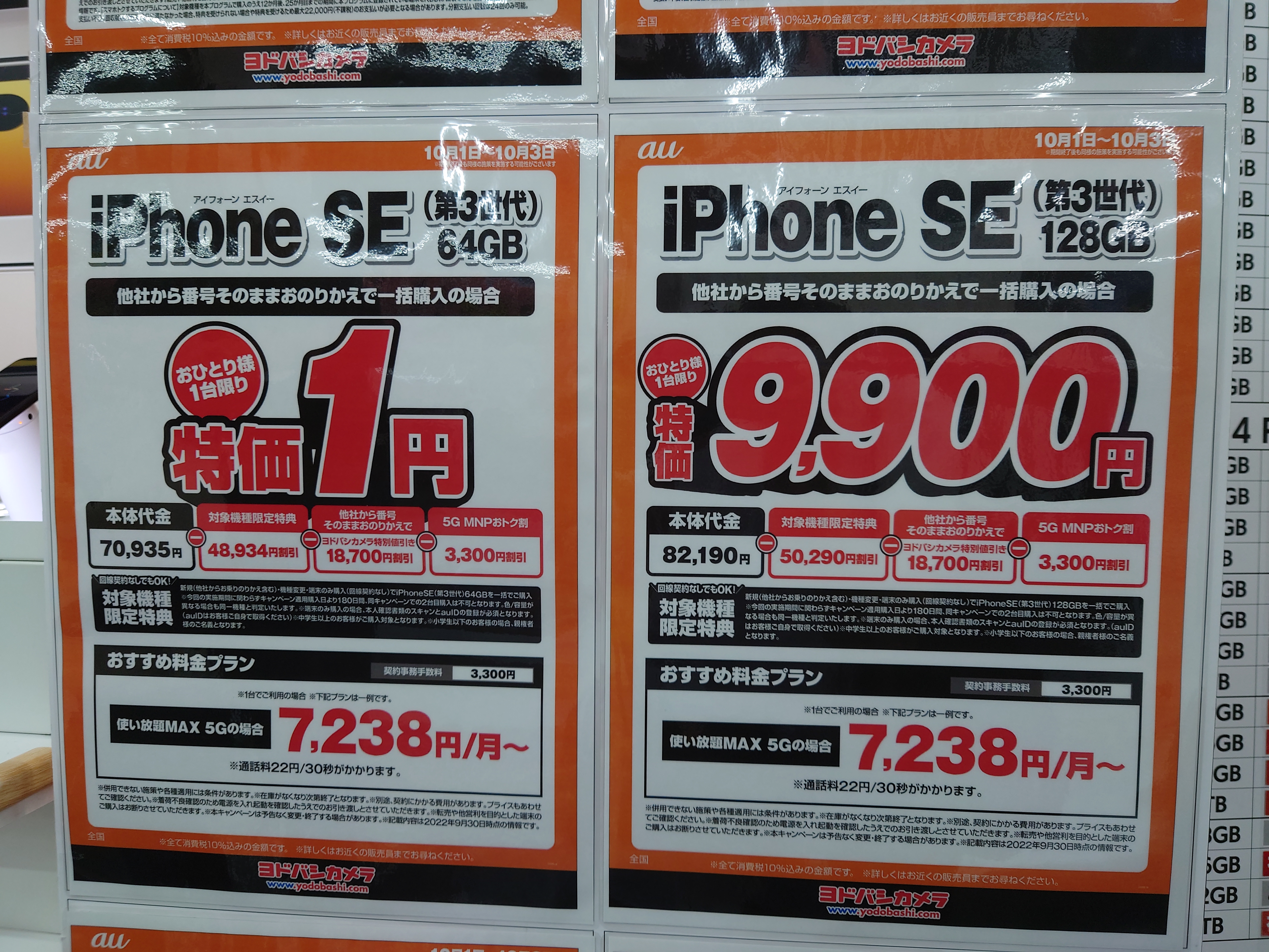 2022年10月1日(土)、ヨドバシカメラ梅田ではドコモ「iPhone SE 64GB(税込73,370円)」がMNP一括9,900円(税込)となっています。