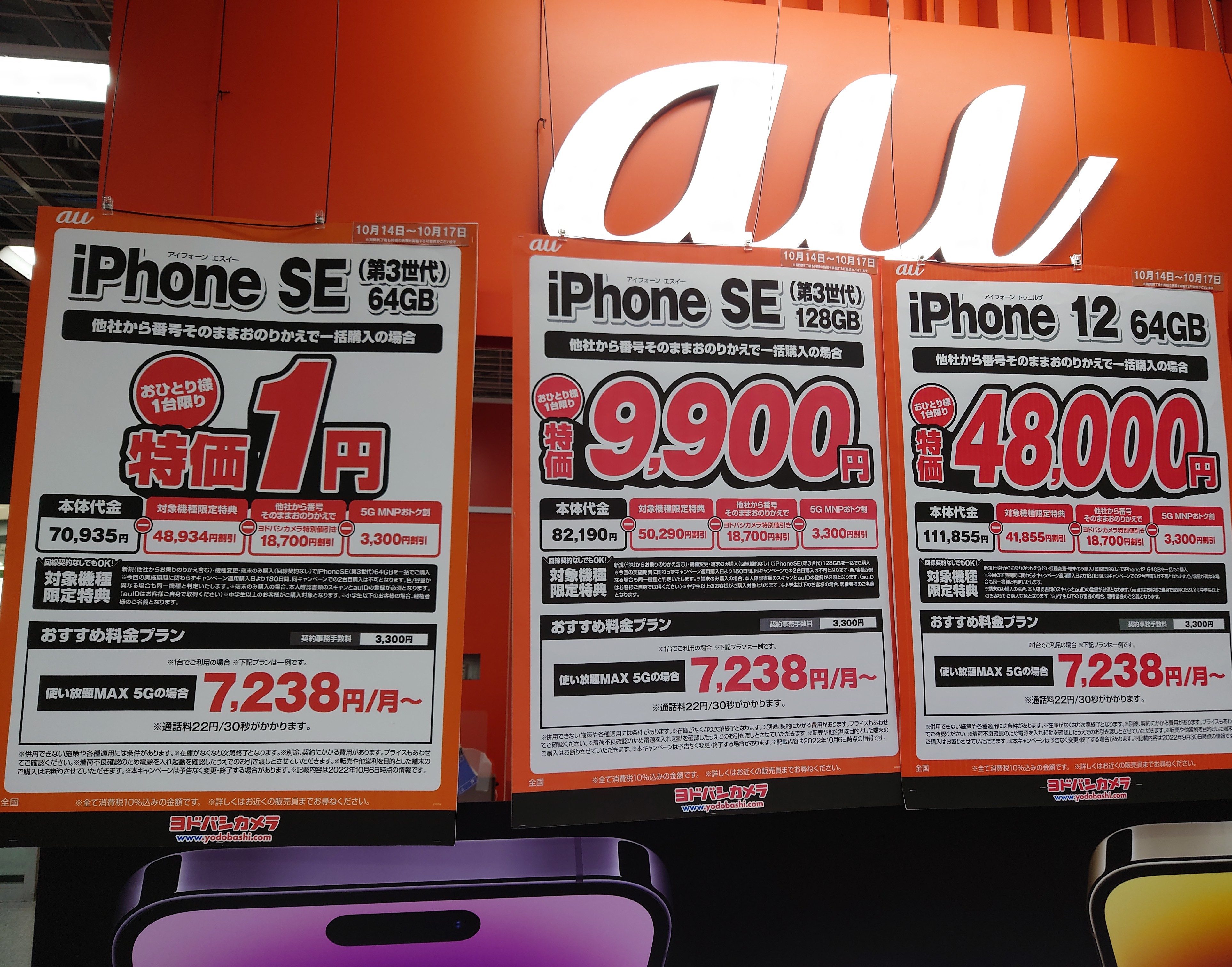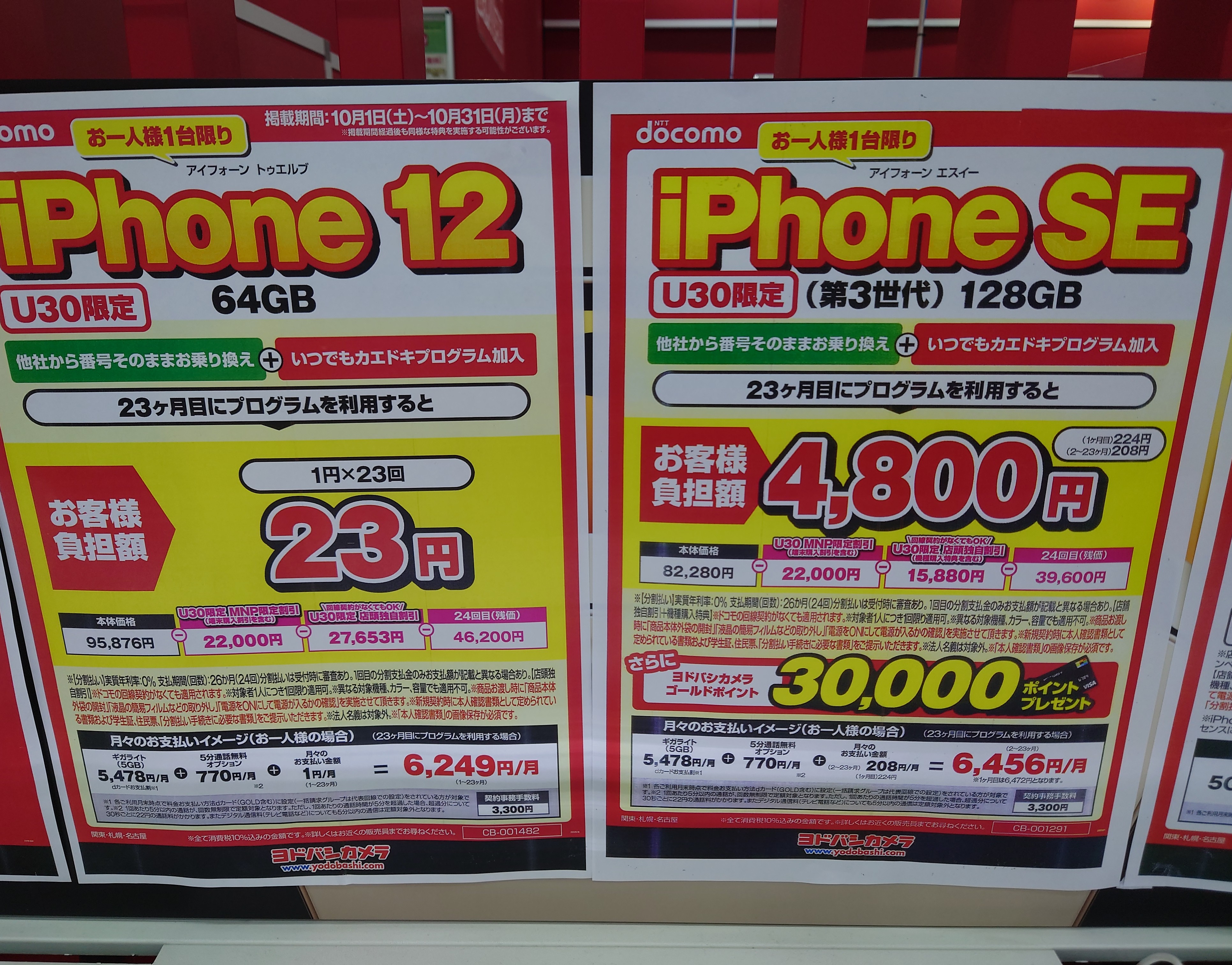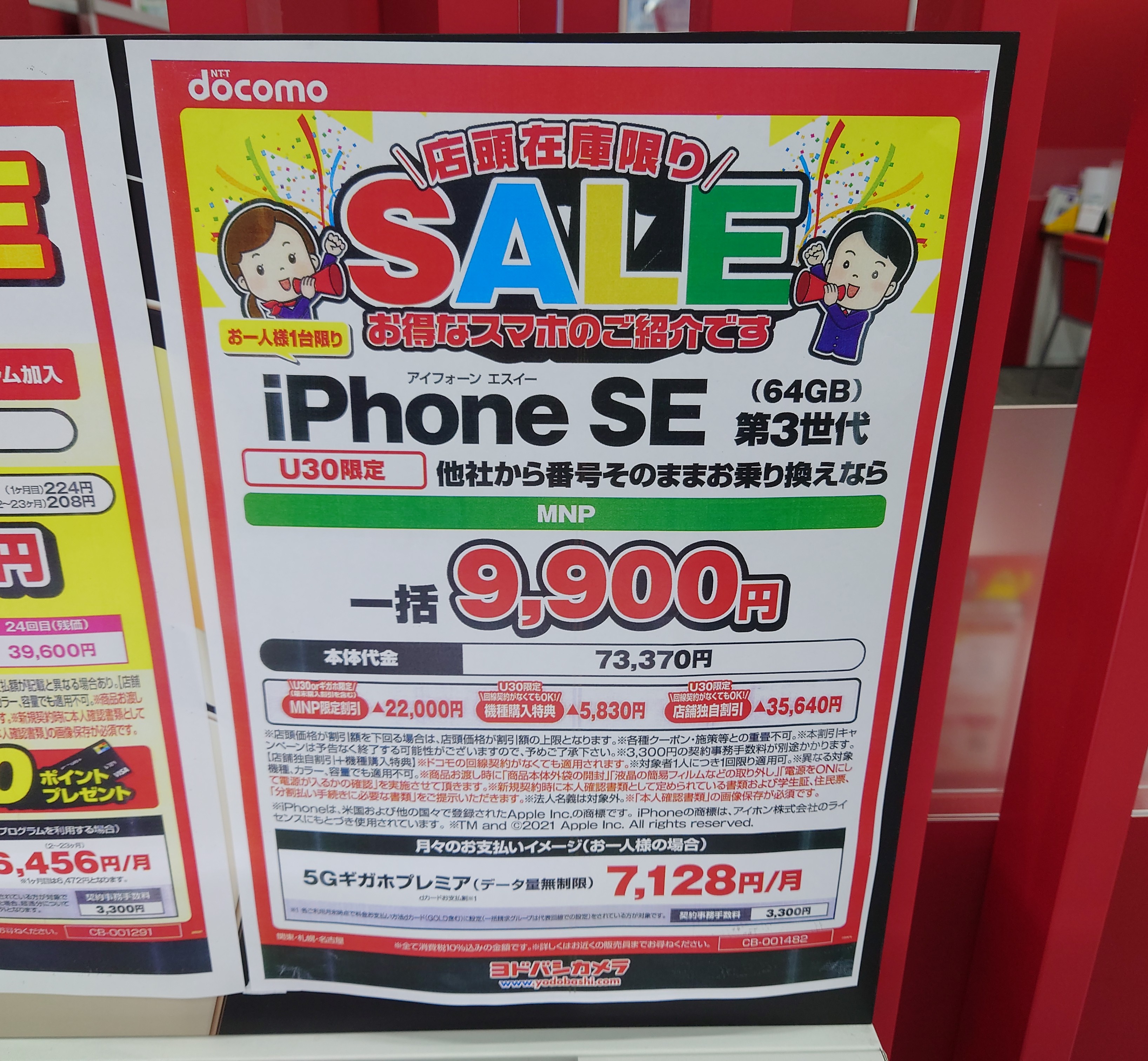 ドコモ「iPhone SE 64GB(税込73,370円)」はMNP一括9,900円(税込)。但し、30歳以下限定。10/17(月)まで。