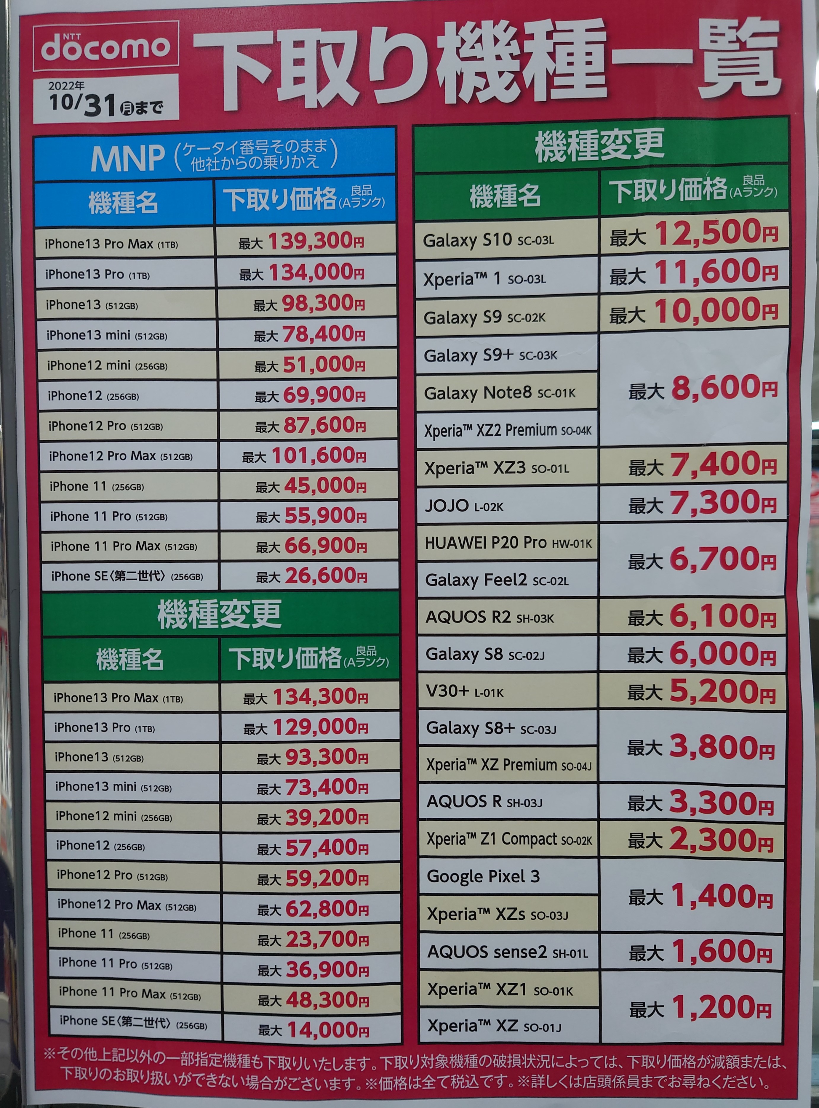 そして下取強化期間は10/31(月)まで。特に、一括1円で購入した人も多いと思いますが「iPhone 12 64GB」の下取り価格(良品)は、「機種変更」でも最大55,000円で、256GB版の最大57,400円とほぼ同額買取となっています。