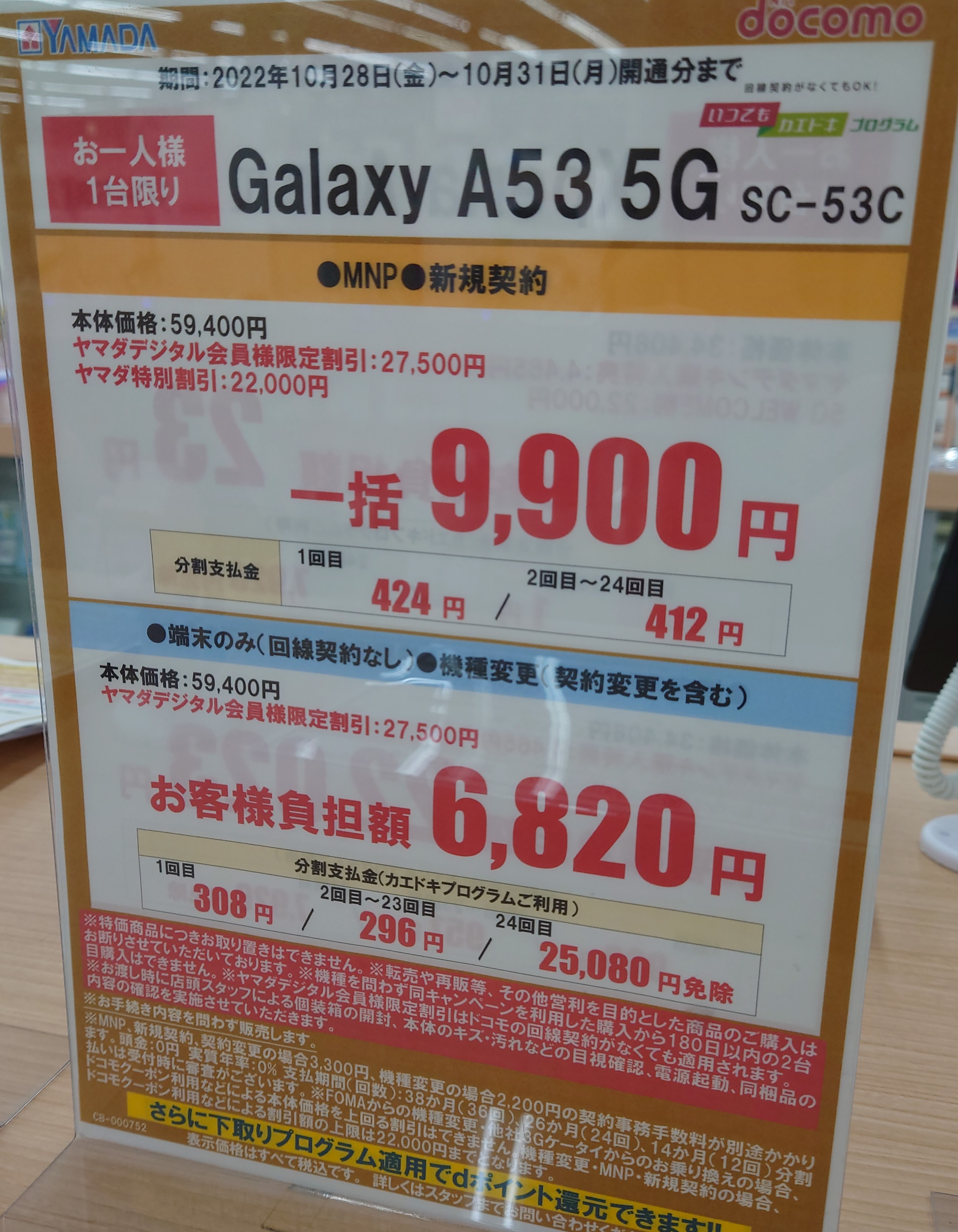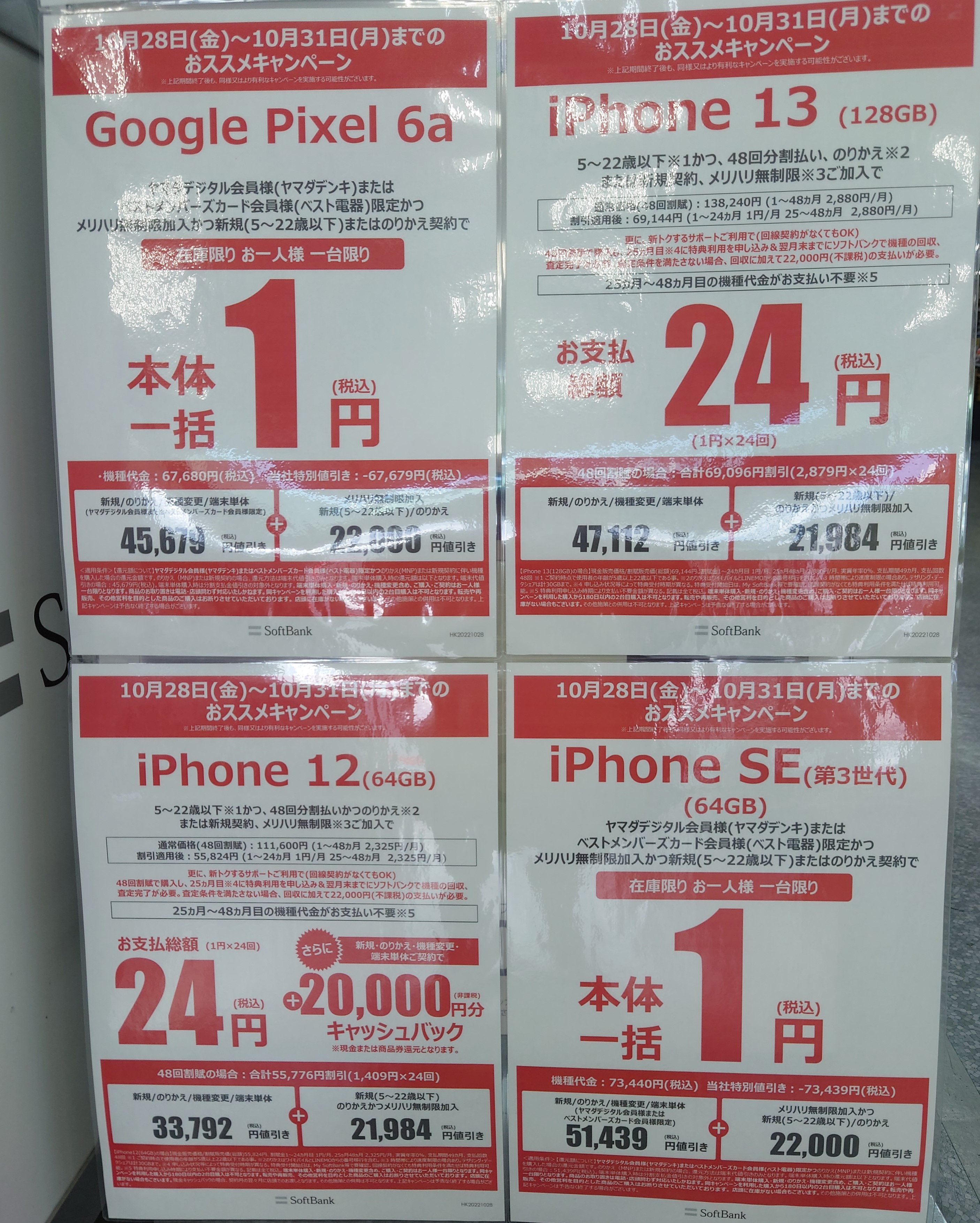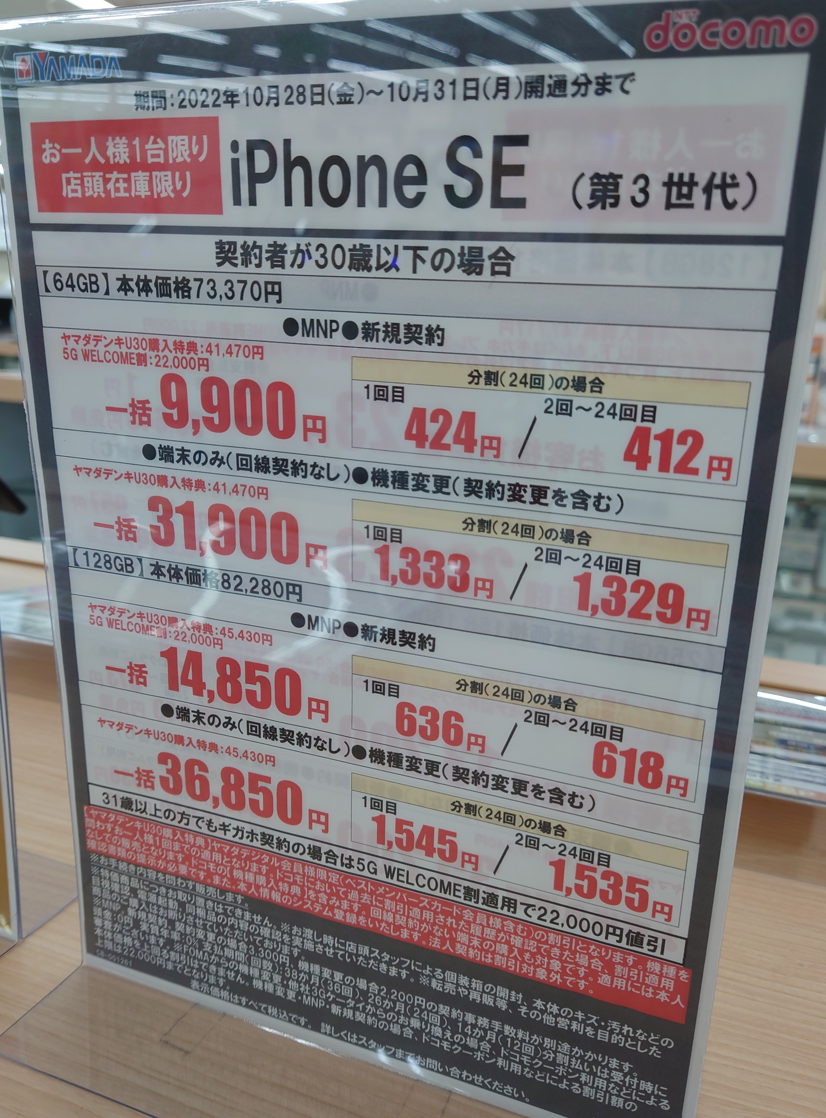 ヤマダ電機のドコモでは「iPhone SE 64GB(税込73,370円)」が新規・MNPで一括9,900円(税込)となっています。但し、30歳以下限定。10/31(月)まで。