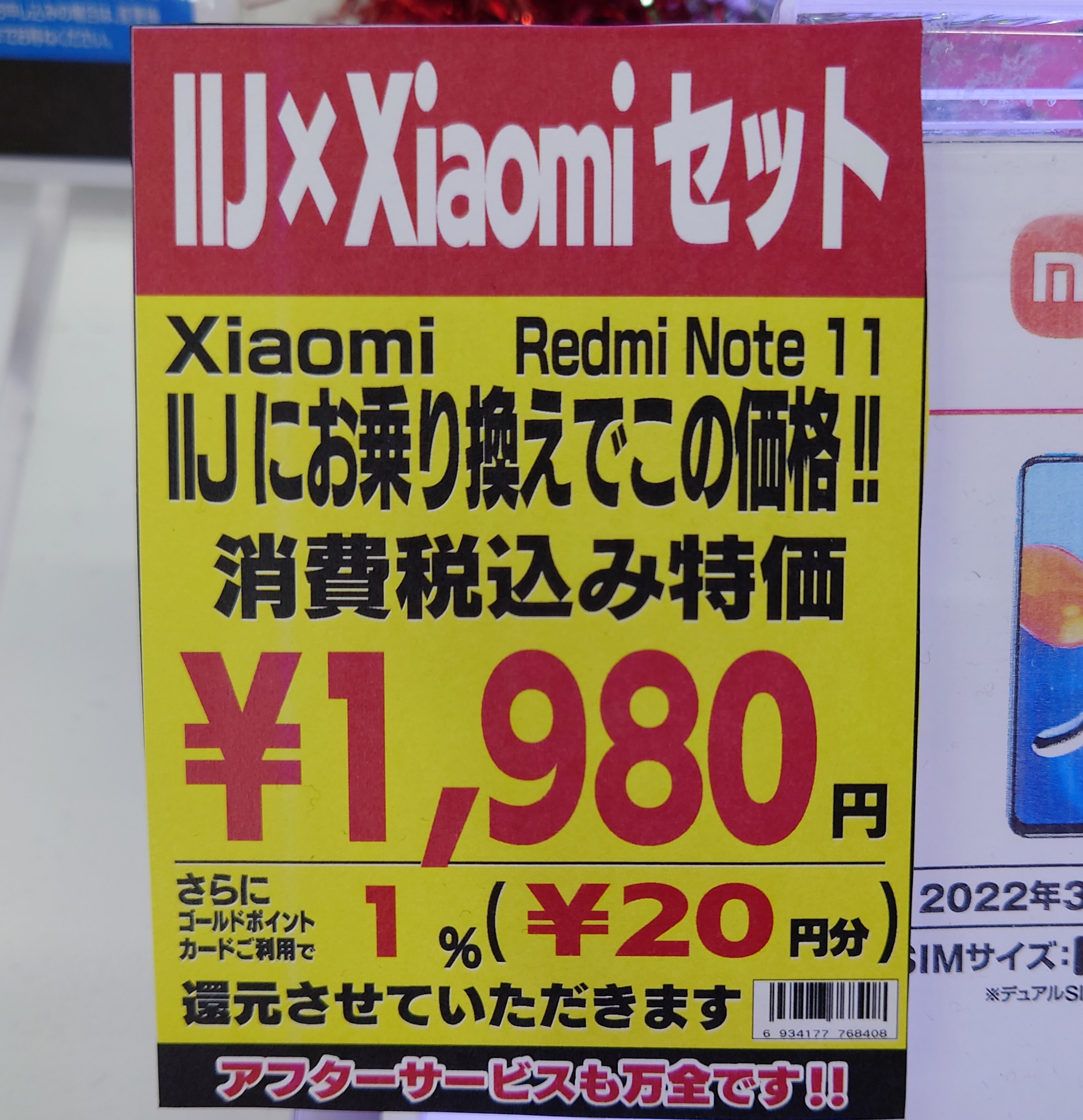 ヨドバシカメラ梅田では、まだまだ人気の高い「Redmi Note11(税込24,800円)」がIIJmioへのMNPで1,980円(税込)となっています。事務手数料は1,650円(税込)。11/6(日)まで。