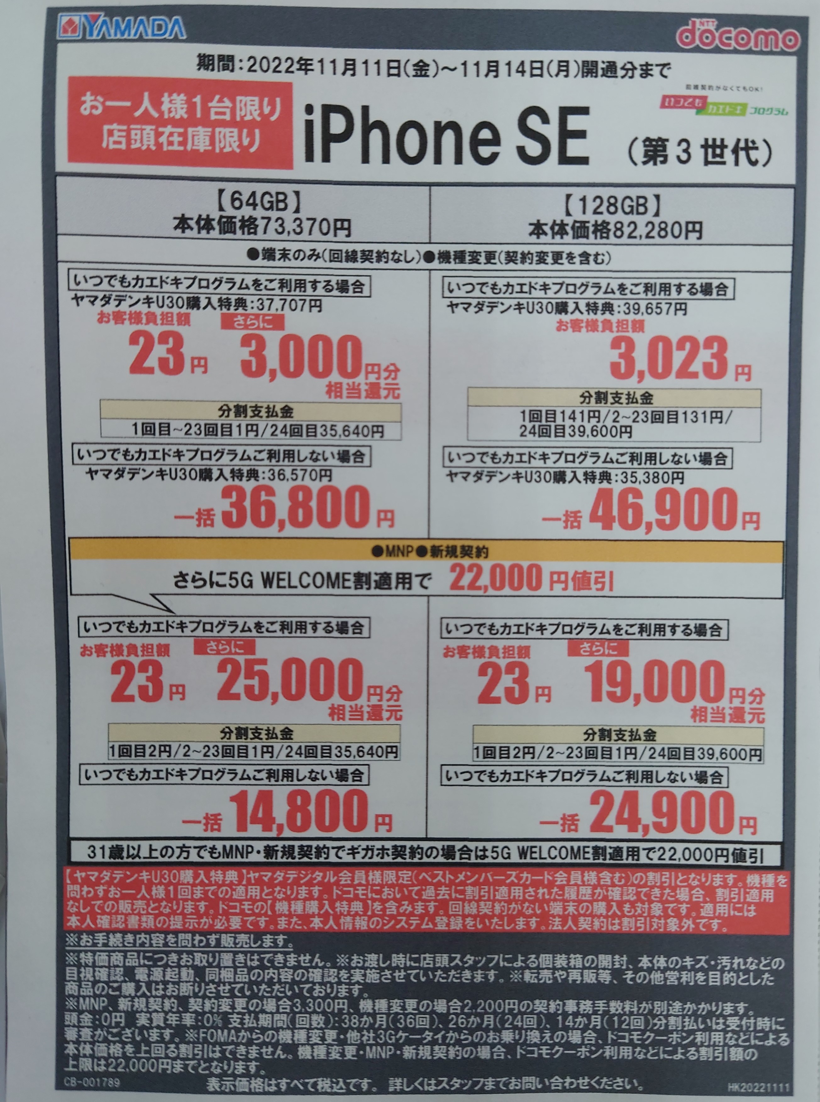 全店共通の機種購入特典(ドコモ公式割引)が入ってますので、下記ご注意下さい。