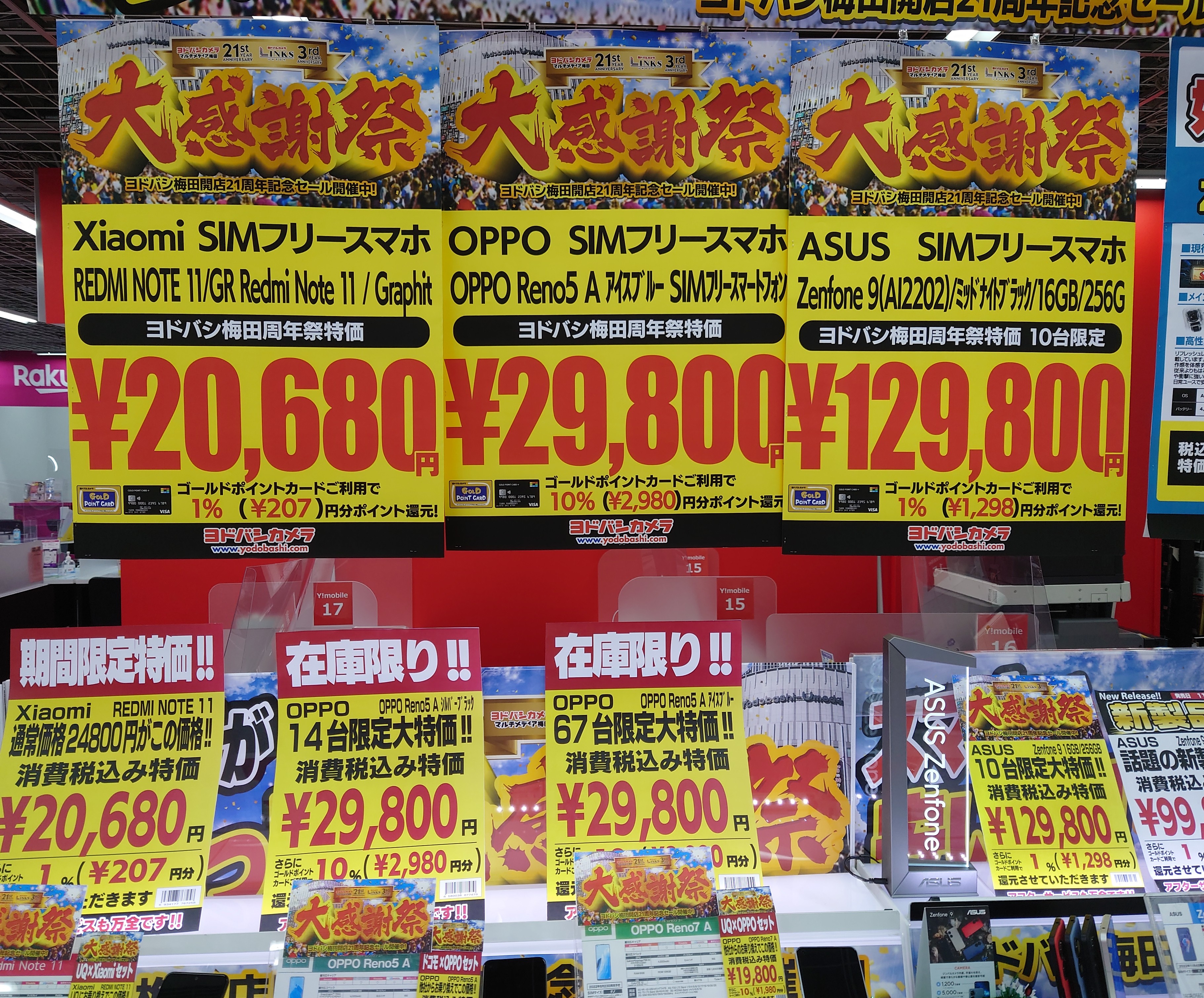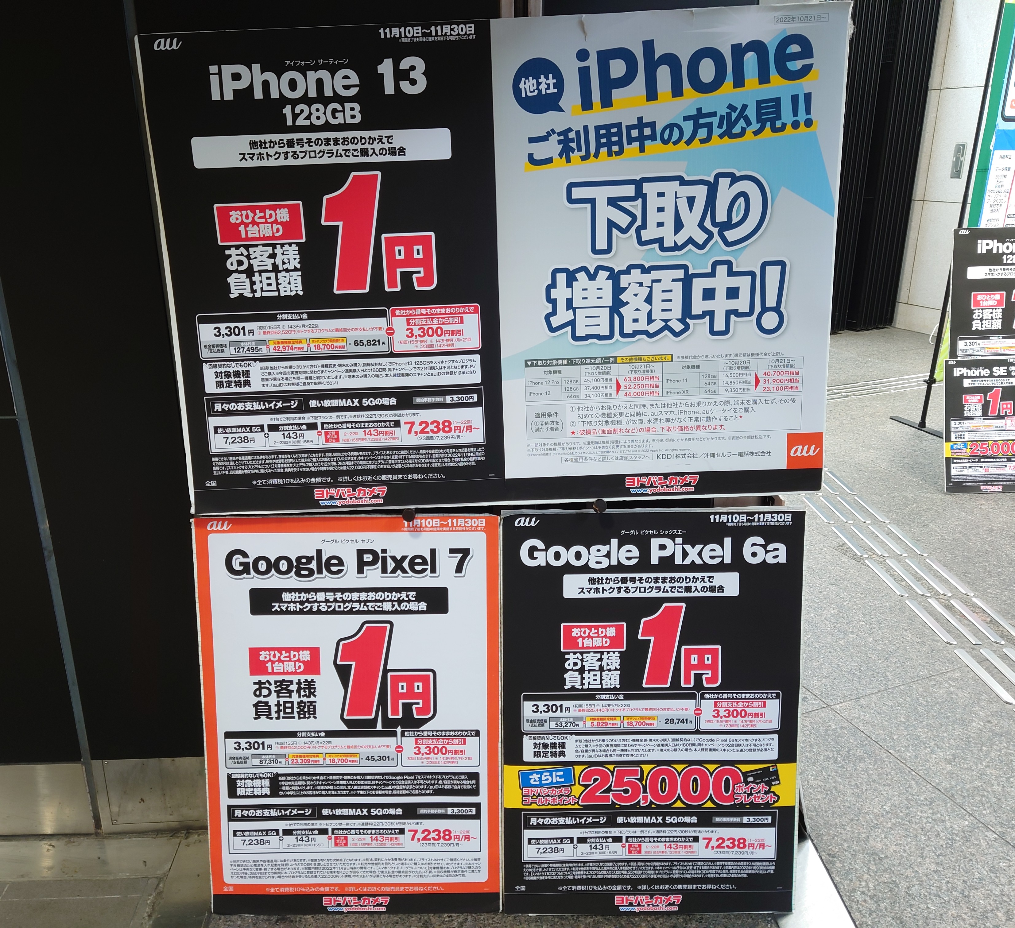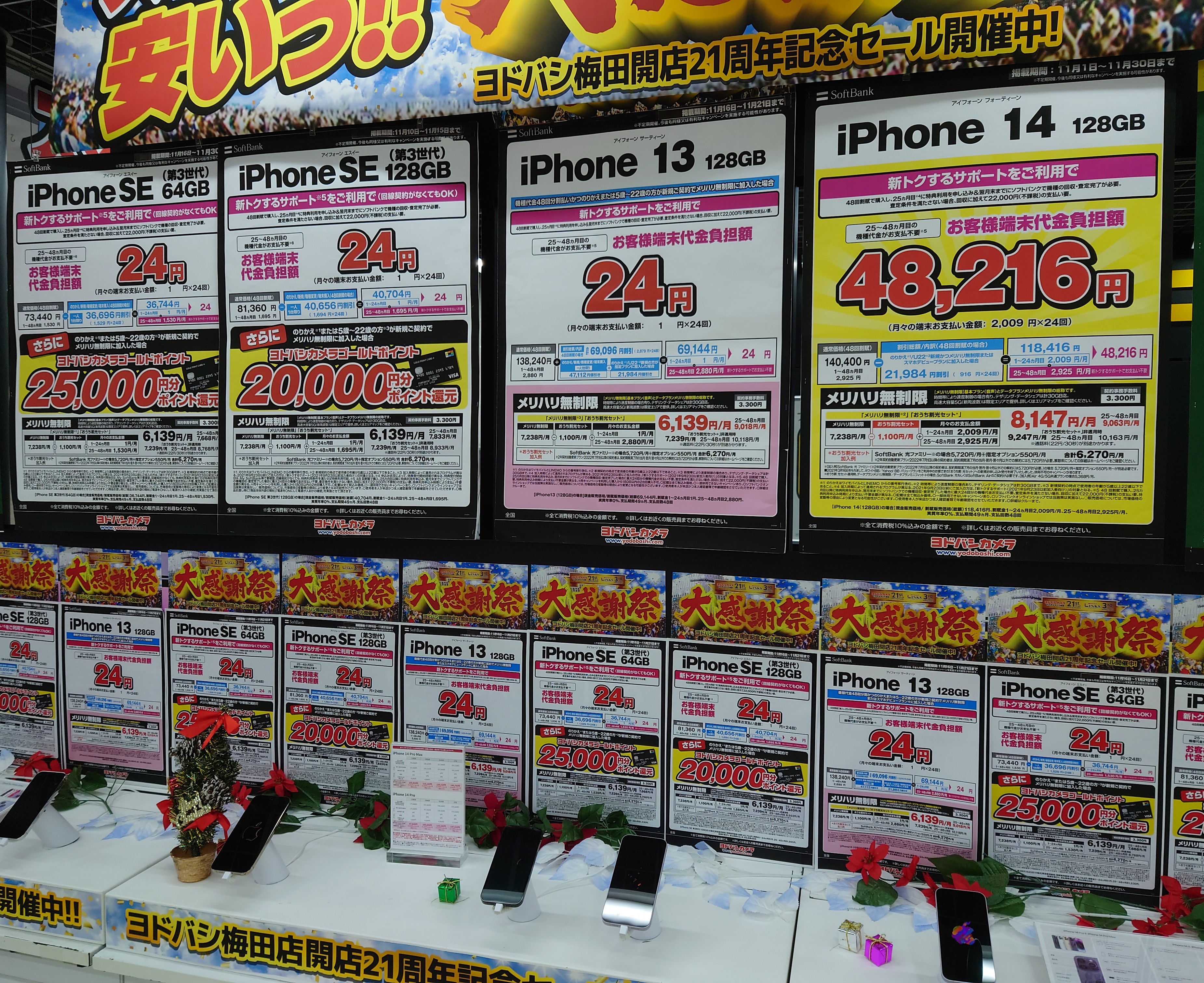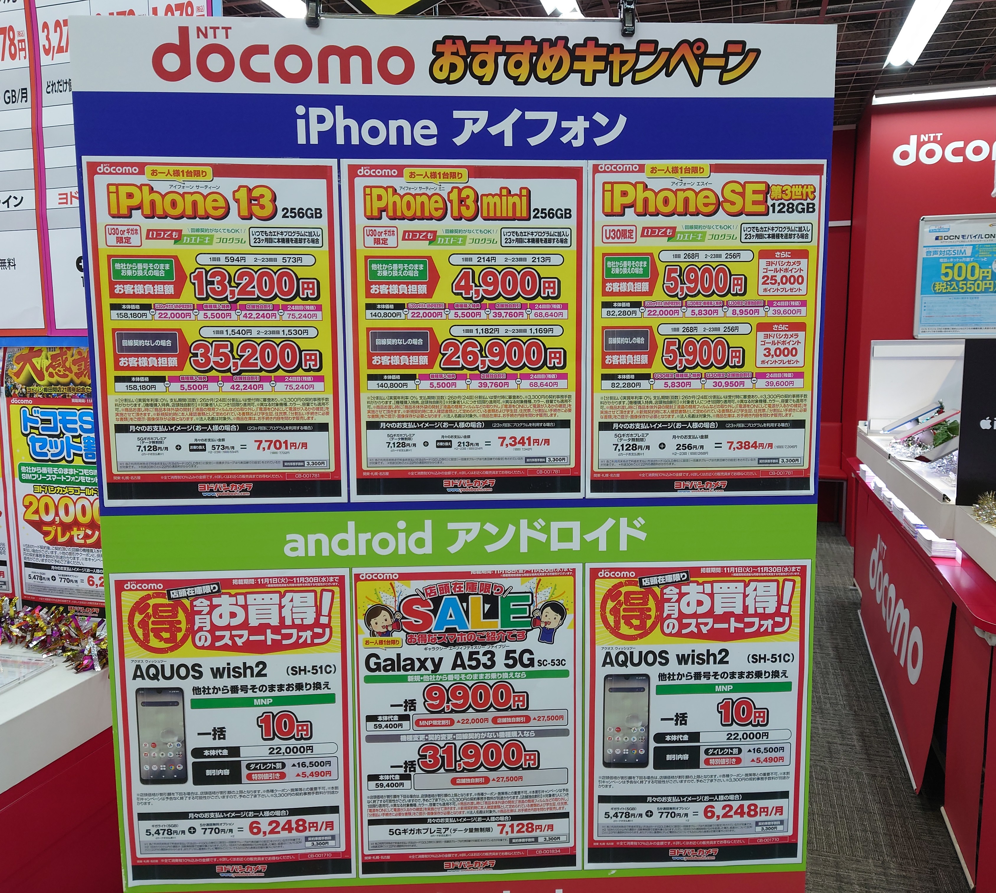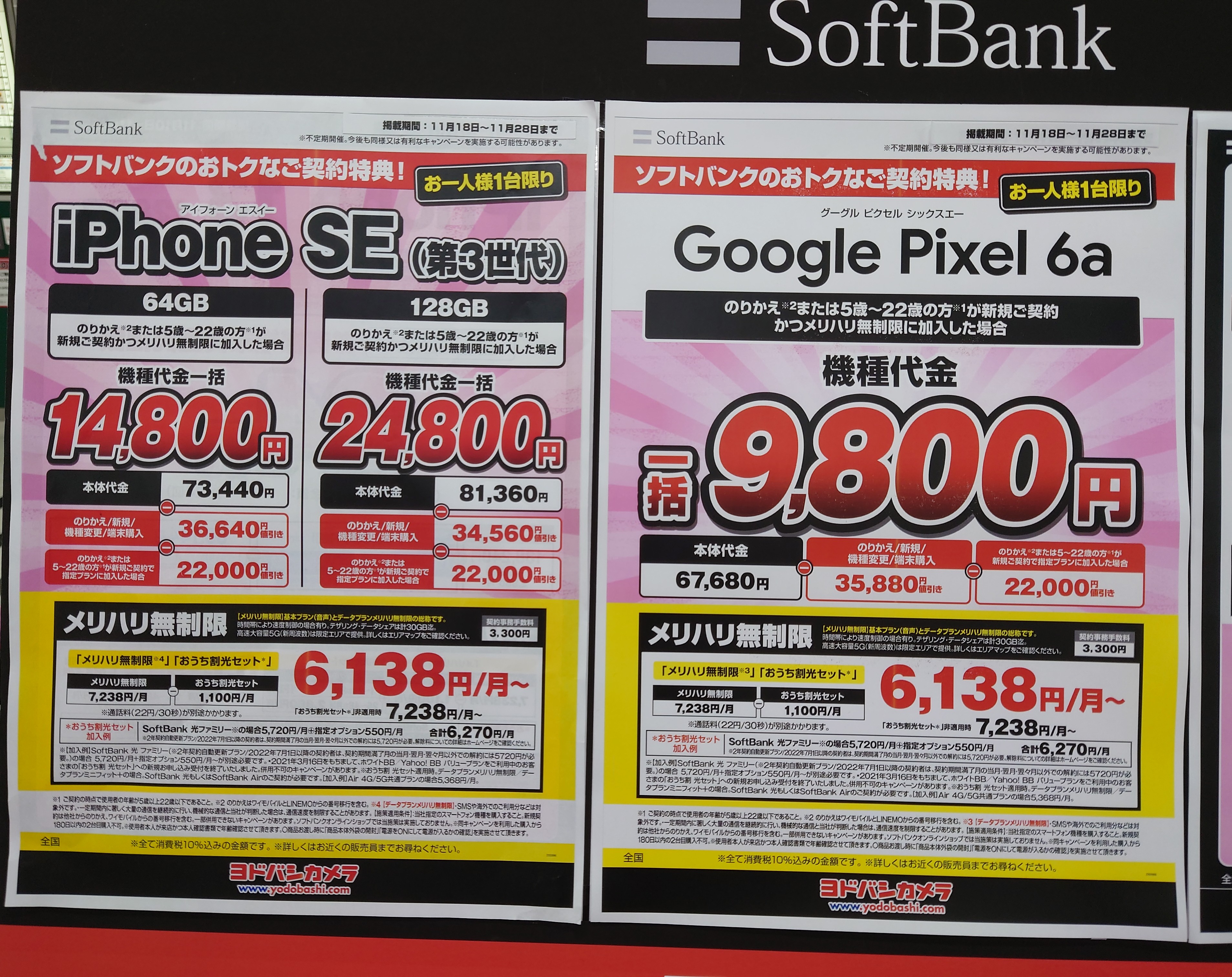 2022年11月19日(土)、ヨドバシカメラ梅田では、ドコモ「iPhone SE 64GB(税込73,370円)」がMNP一括14,800円(税込)となっています。