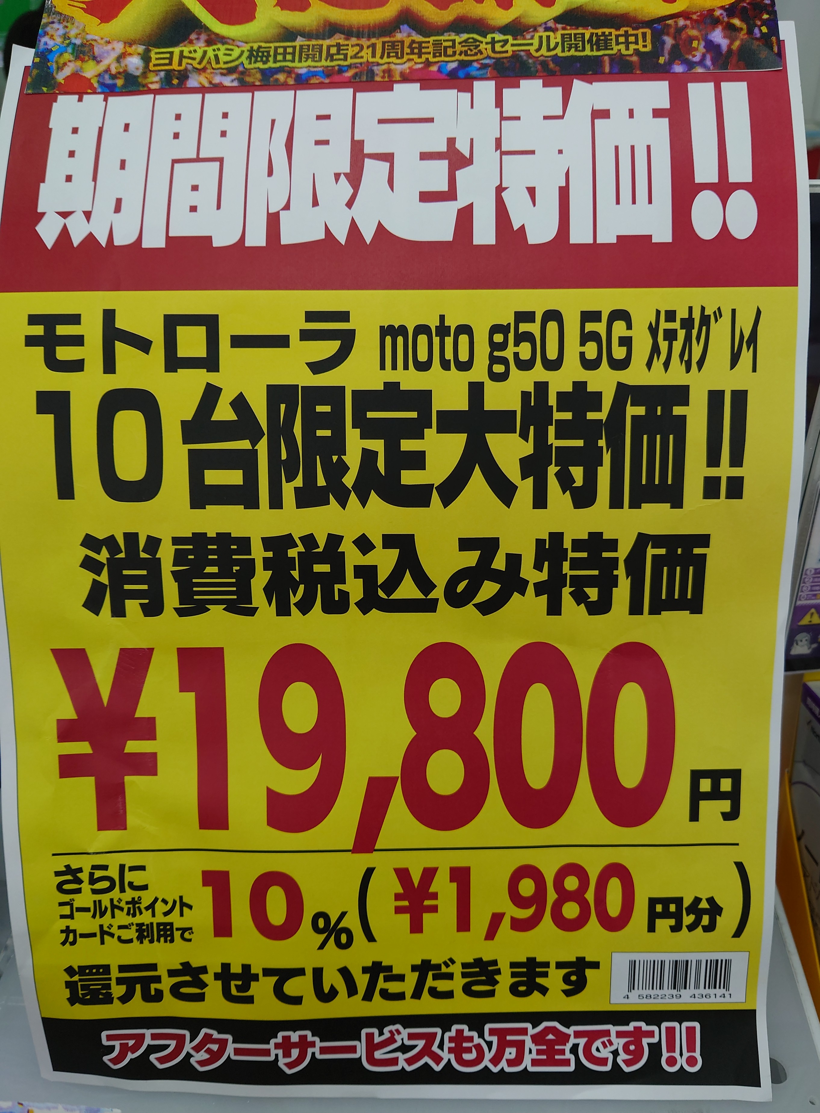 2022年11月19日(土)、ヨドバシカメラ梅田では、2021年10月1日発売の「moto g50 5G(税込32,800円)」が、単品19,800円(税込)に、1,980ポイント還元となっています。在庫処分10台限定。