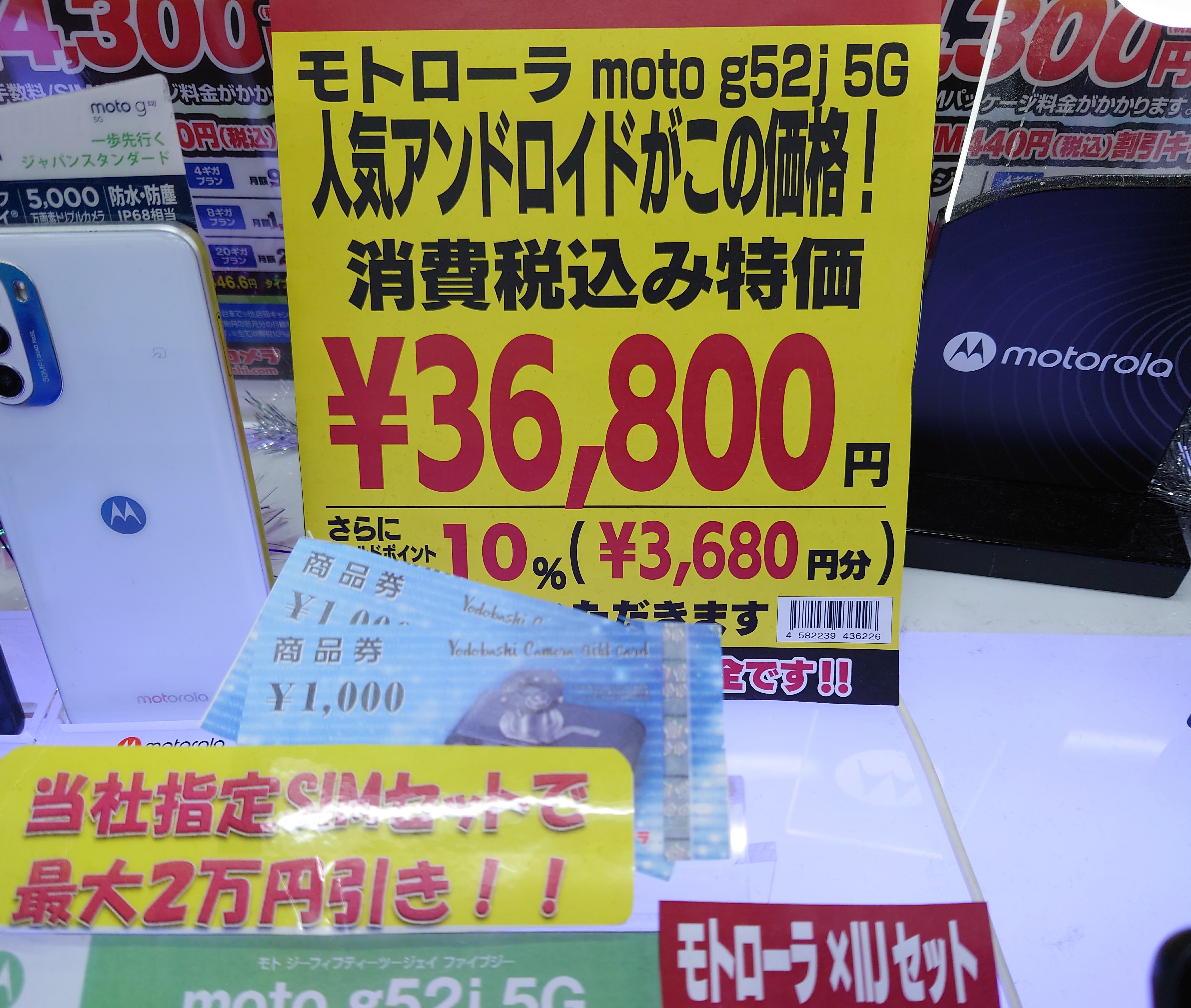 2022年11月26日(土)、ヨドバシカメラ梅田では、Motorola初のおサイフ&防水対応スマホ「moto g52j 5G(税込39,800円)」が2,000円商品券を割引に充てて、34,800円(税込)になっています。ポイントは10%還元。